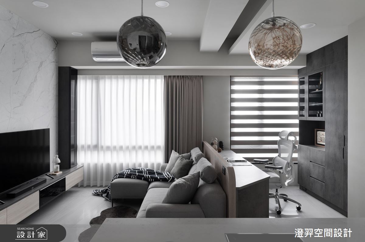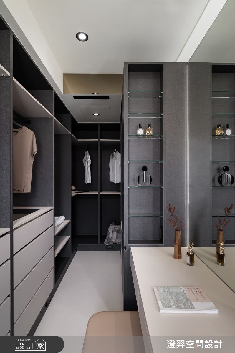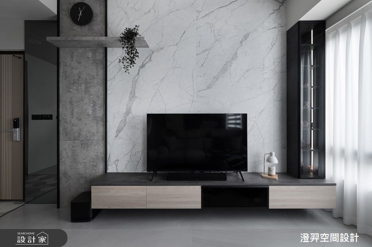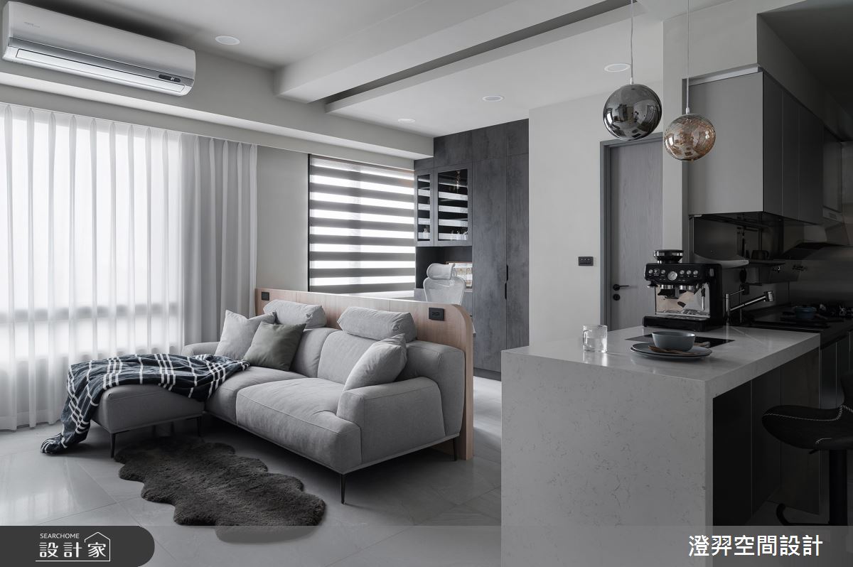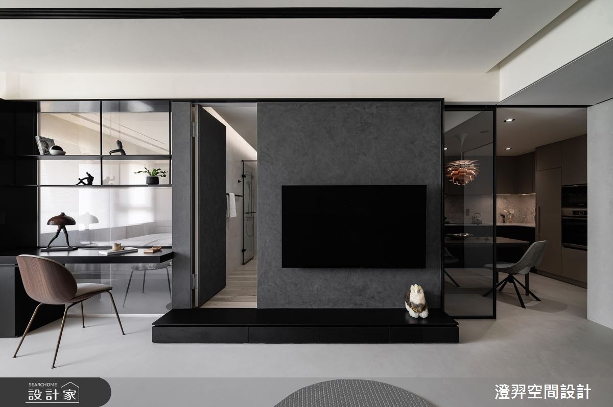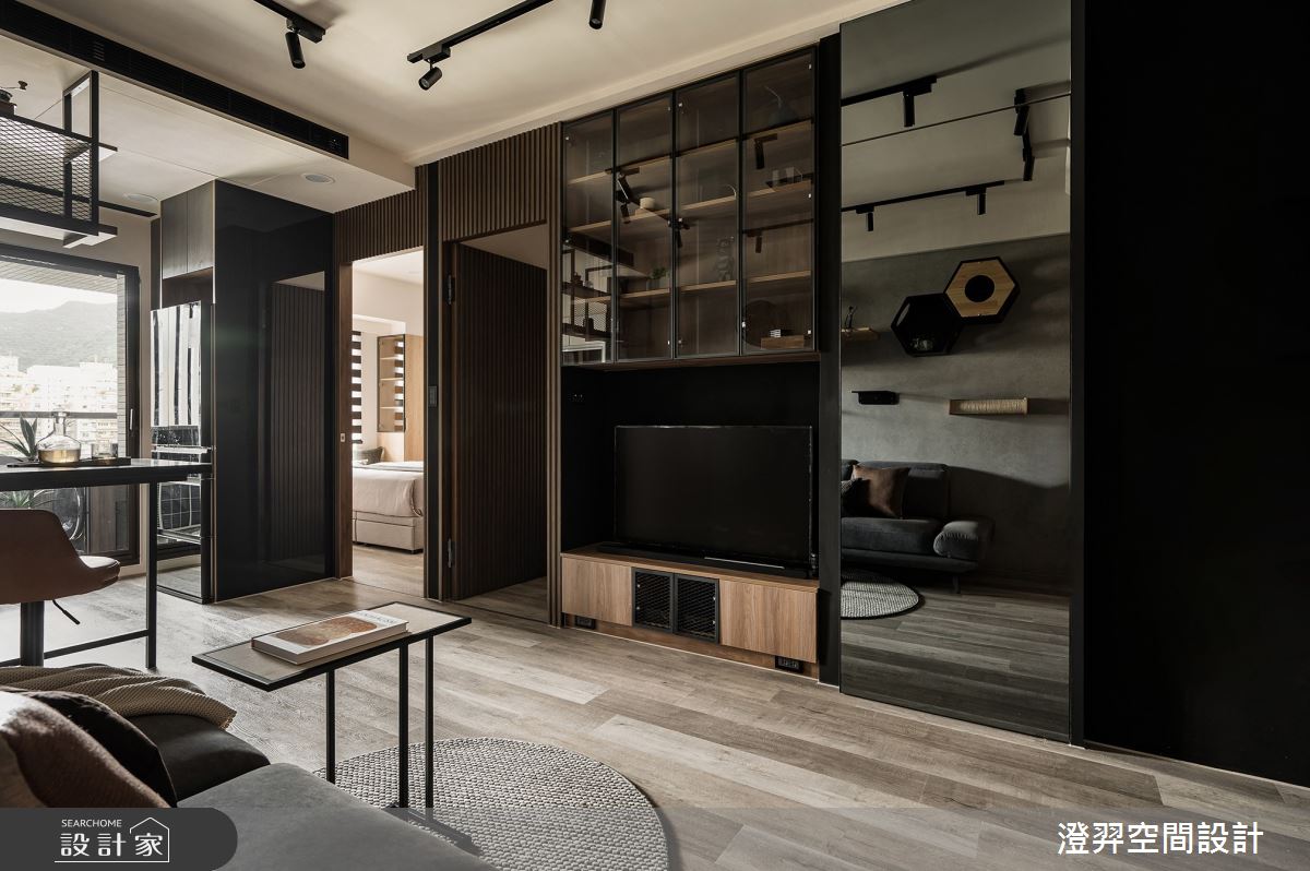 澄羿空間設計以微水泥地板、灰鏡、鍍鈦金屬、木作貼皮、系統板材、賽麗石、磁吸軌道燈、電控玻璃、spiver藝術塗料的搭配應用,呈現現代風居家氛圍,將此間22坪、一房、單層、新成屋(5年以下)打造成舒適愜意的家庭空間,完成2位大人全家人的夢想之居。