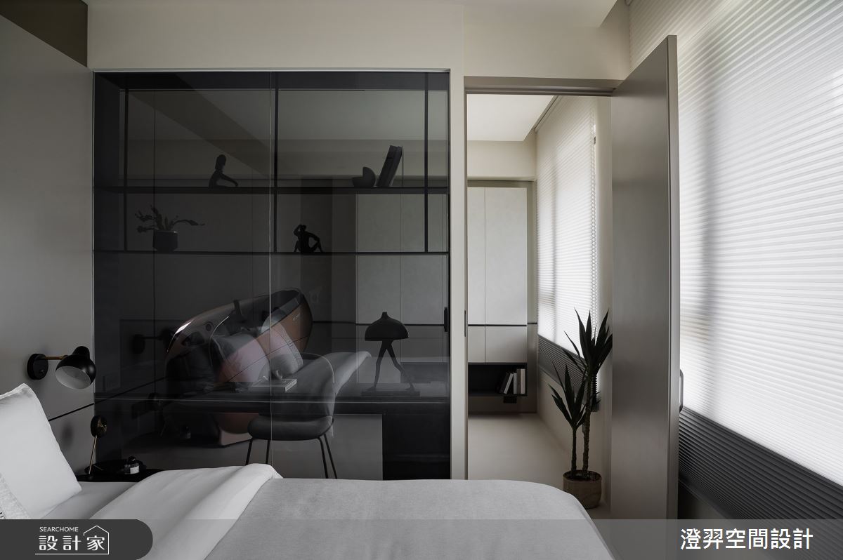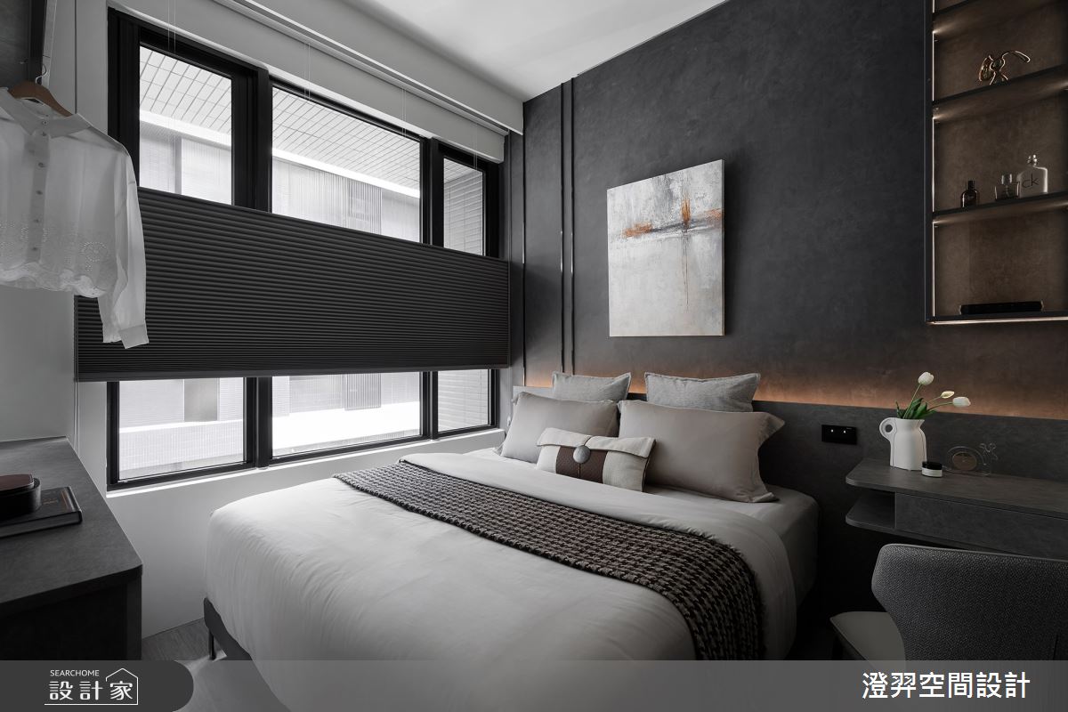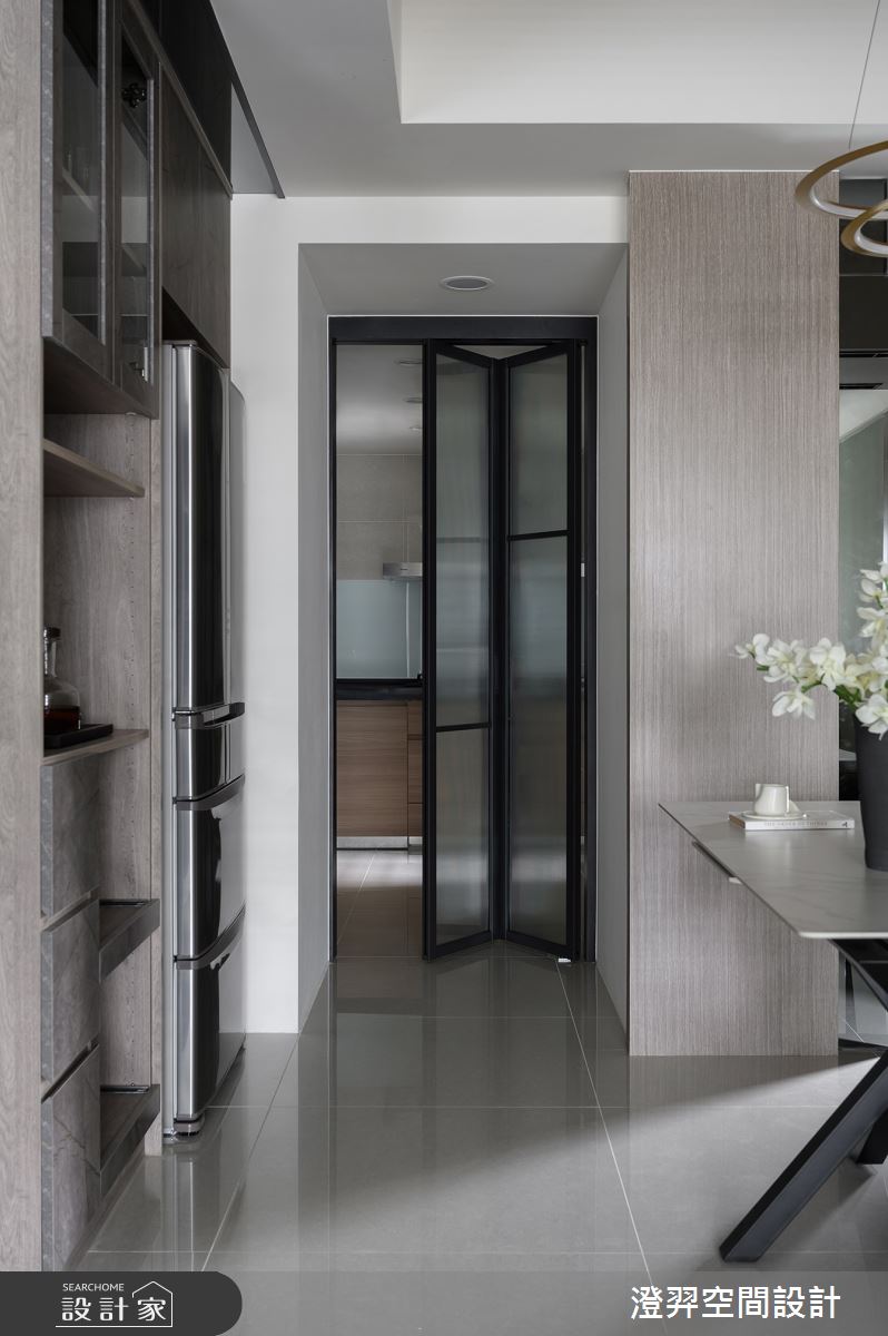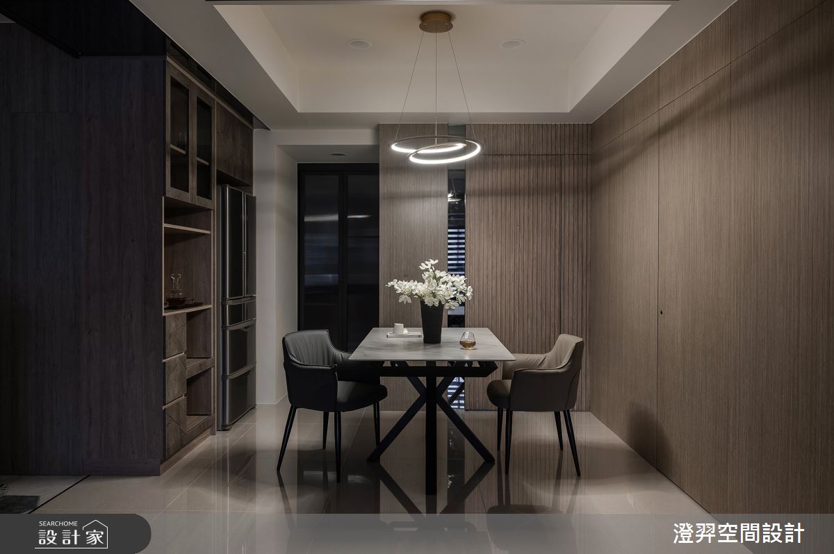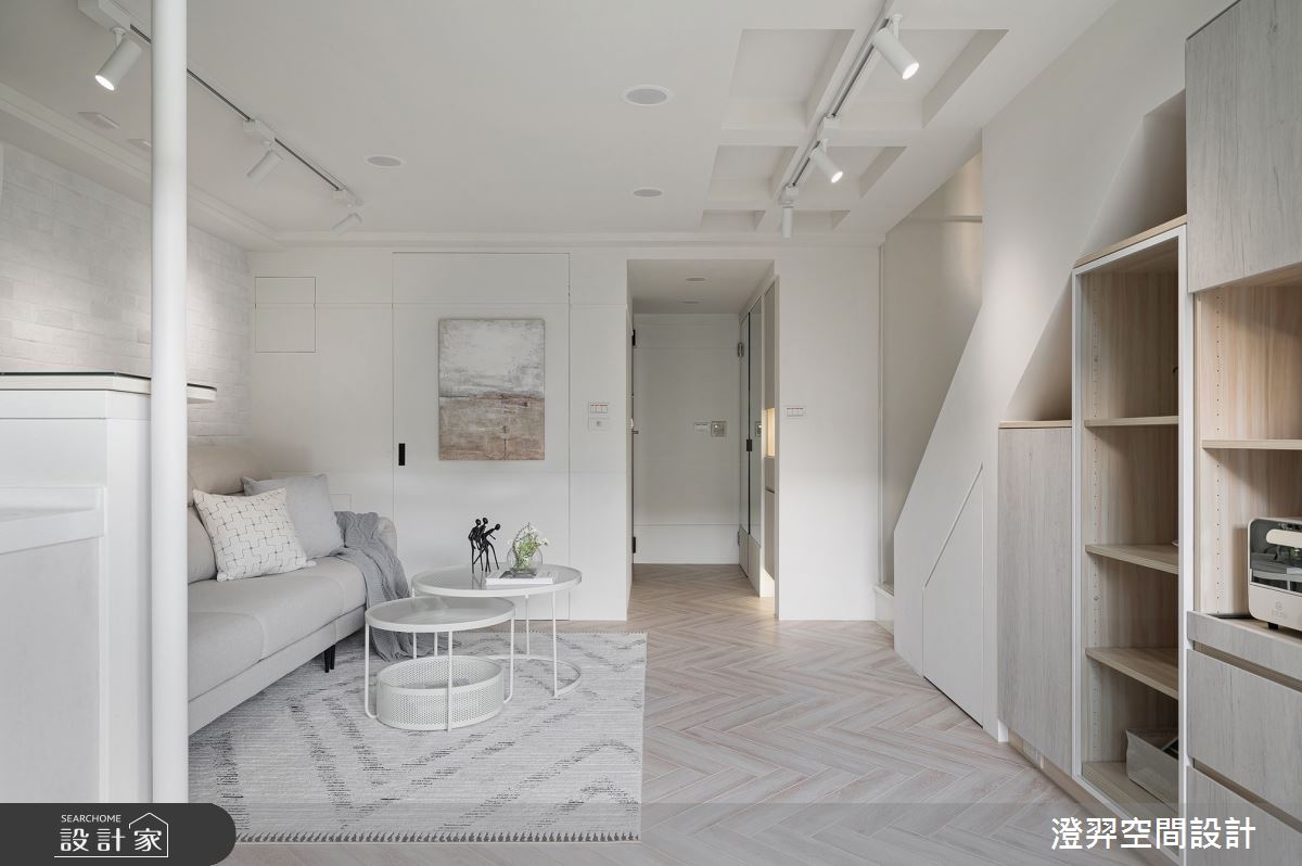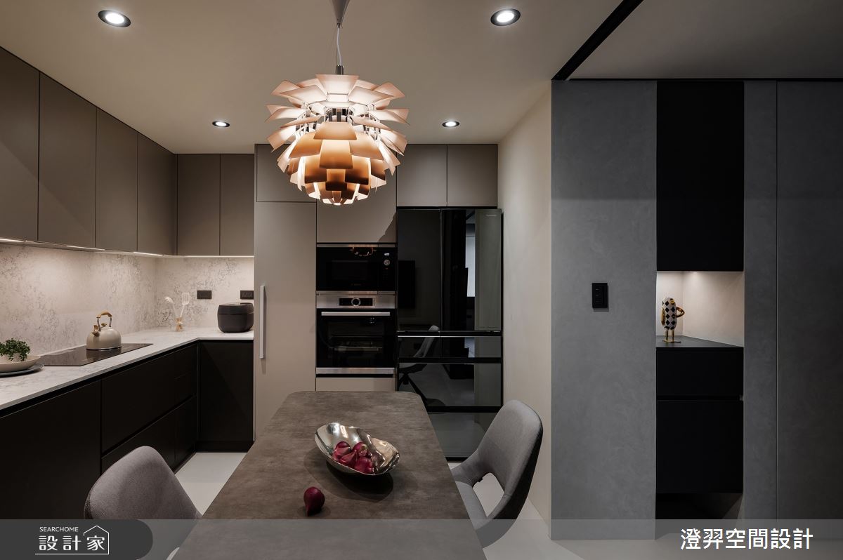 澄羿空間設計以微水泥地板、灰鏡、鍍鈦金屬、木作貼皮、系統板材、賽麗石、磁吸軌道燈、電控玻璃、spiver藝術塗料的搭配應用,呈現現代風居家氛圍,將此間22坪、一房、單層、新成屋(5年以下)打造成舒適愜意的家庭空間,完成2位大人全家人的夢想之居。