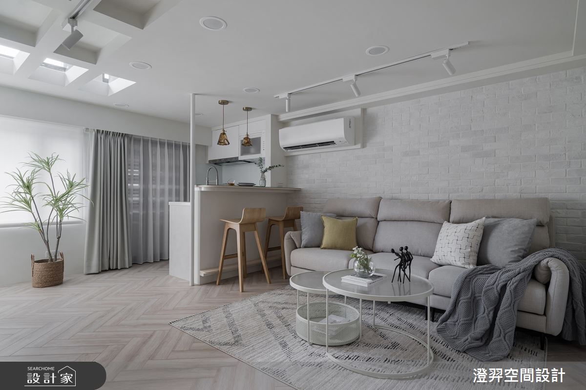 澄羿空間設計以文化石、水泥漆、木地板、灰鏡、木作貼皮、系統板材、人造石的搭配應用,呈現北歐風居家氛圍,將此間14坪、一房、夾層、老屋(16~30年)打造成舒適愜意的家庭空間,完成1位大人全家人的夢想之居。