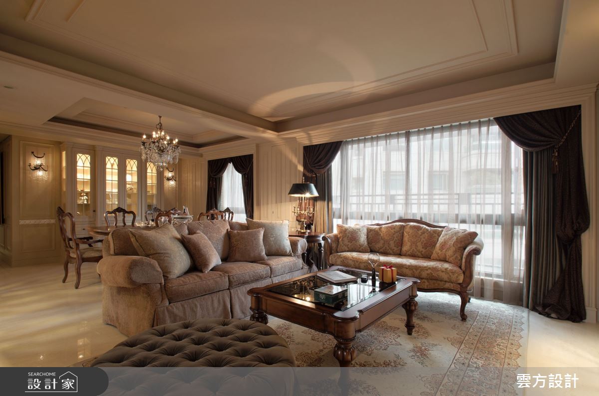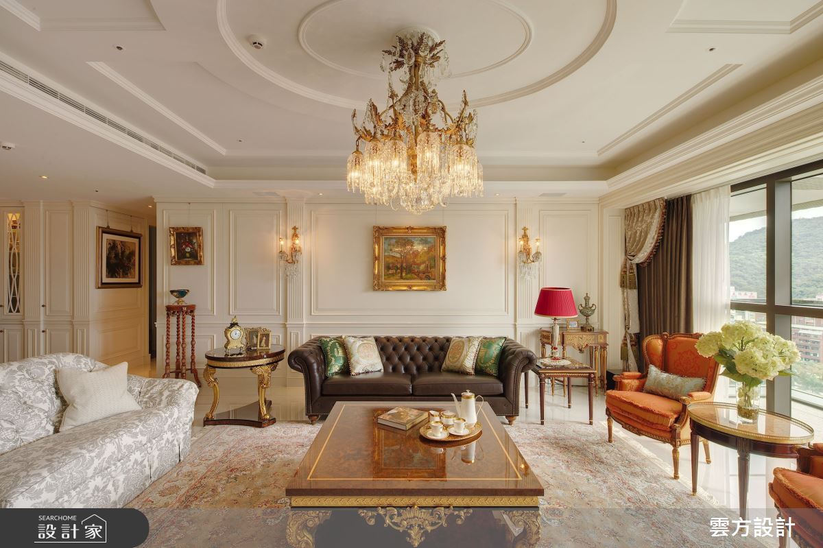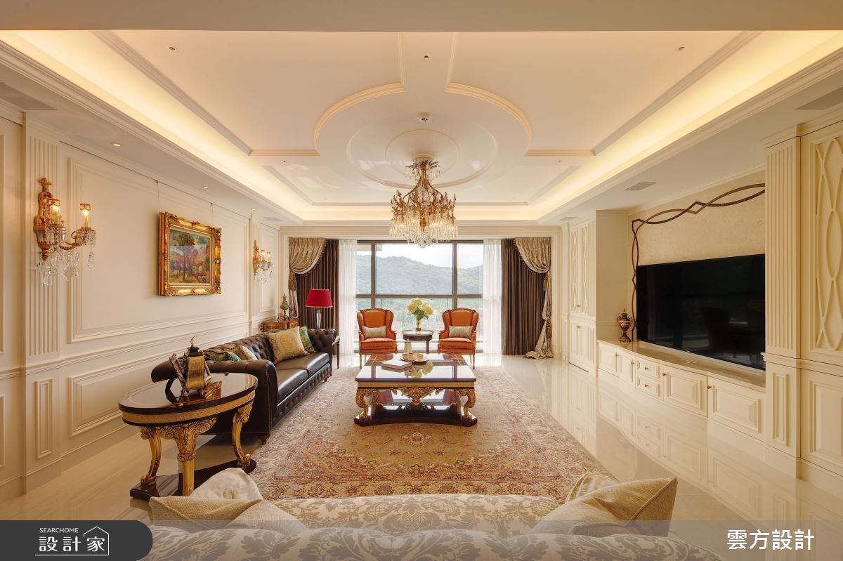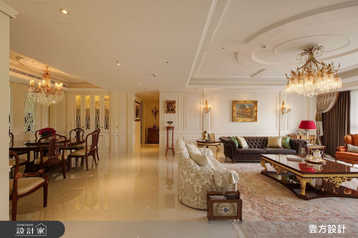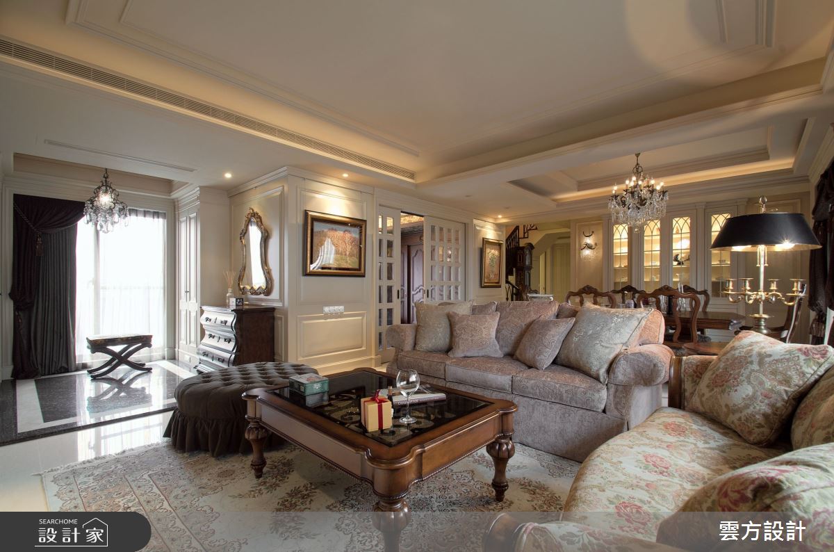 本案為雲方設計的70坪新古典毛胚屋設計作品,格局為單層三房的居住空間。居住成員包含2位大人、1位小孩。全室建材的搭配,應用乳膠漆、花磚、壁紙、超耐磨木地板、石英磚/拋光石英磚、鐵件、茶玻、木作貼皮、烤漆、壓克力、大理石、磁磚、木百葉、賽麗石、石材、線板、噴漆,展現溫馨的居家氛圍。