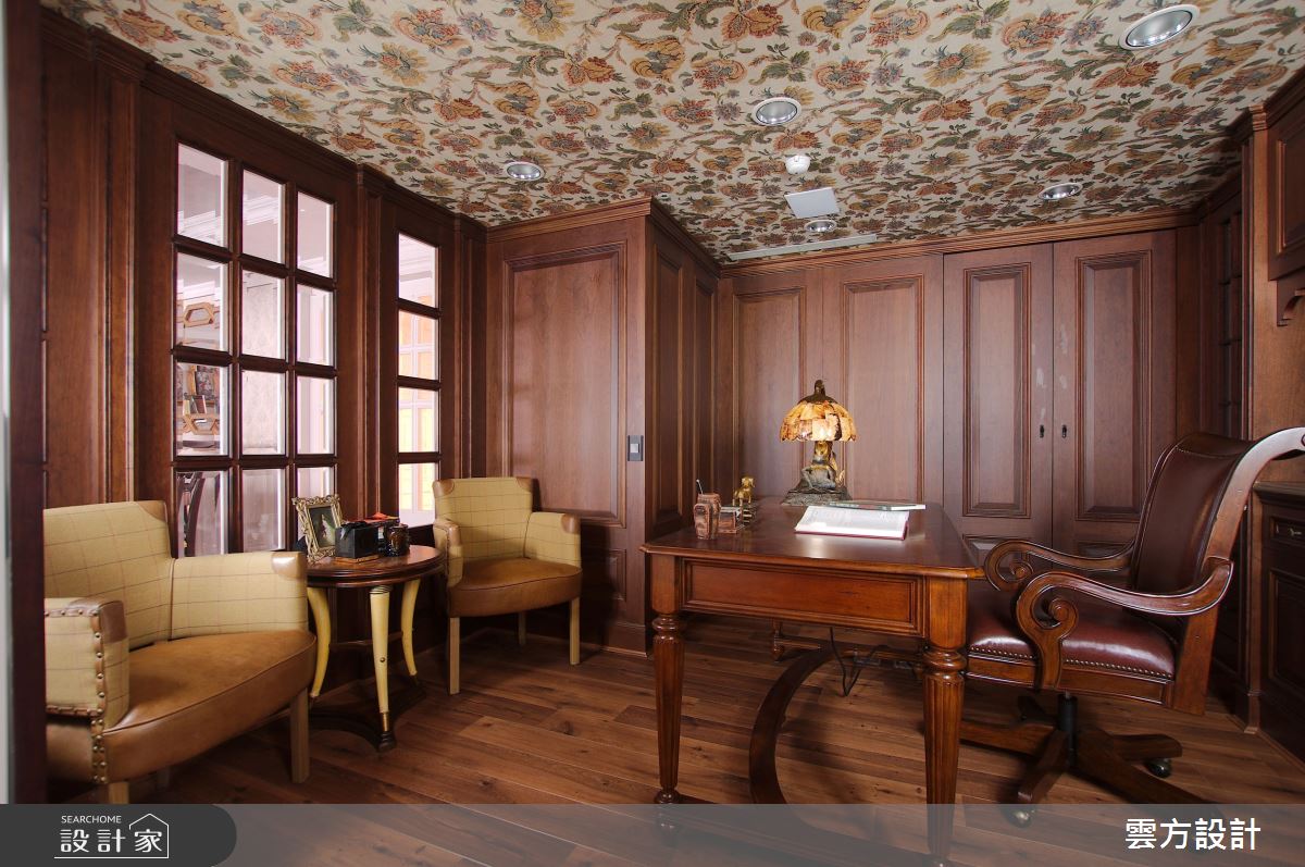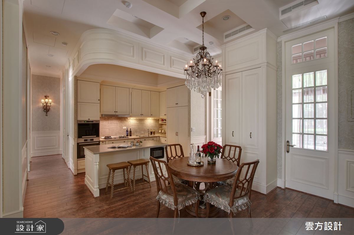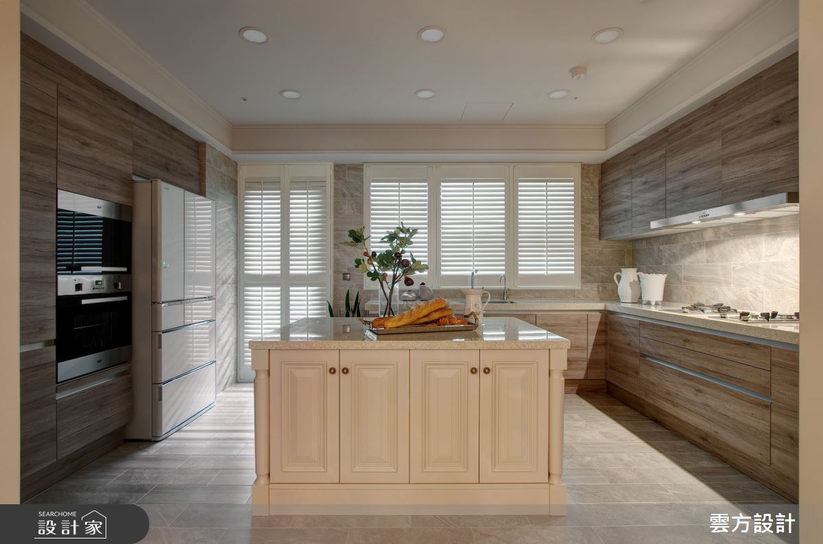 雲方設計以乳膠漆、壁紙、石英磚/拋光石英磚、鐵件、木作貼皮、烤漆、大理石、磁磚、賽麗石、石材、線板、噴漆的搭配應用,呈現新古典居家氛圍,將此間50坪、三房、單層、毛胚屋打造成舒適愜意的家庭空間,完成2位大人、1位小孩全家人的夢想之居。