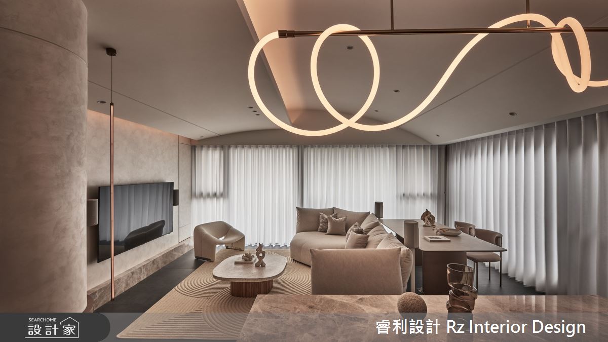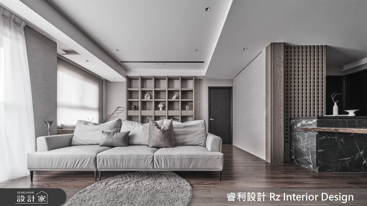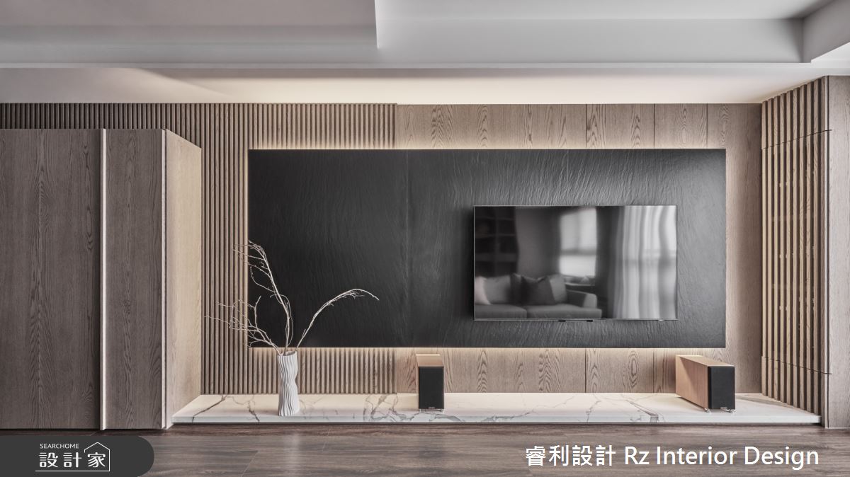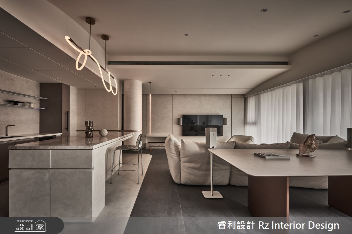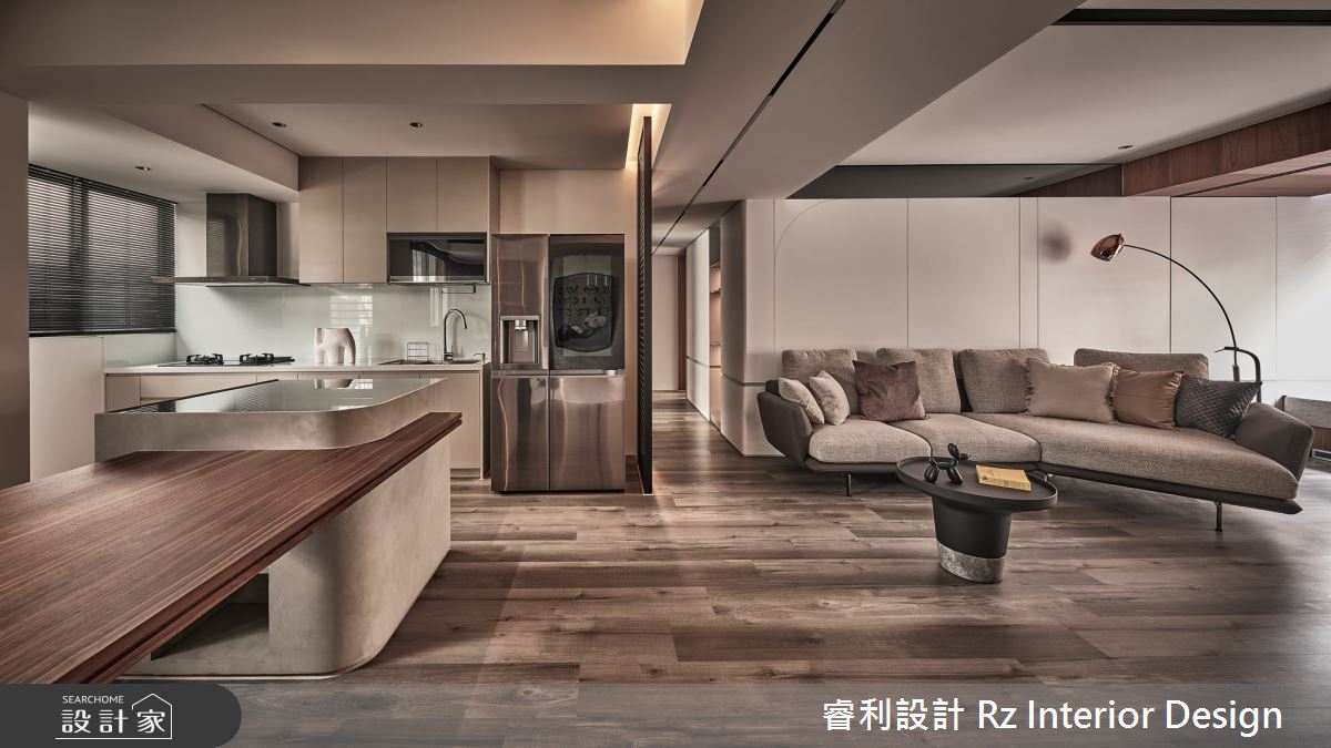 睿利設計以油漆、乳膠漆、水泥漆、木地板、不鏽鋼、鐵件、鍍鈦金屬、木作貼皮、烤漆、系統板材、磁磚、水泥/水泥粉光、人造石、石材、噴漆的搭配應用,呈現侘寂風居家氛圍,將此間27.7坪、兩房、單層、新成屋(5年以下)打造成舒適愜意的家庭空間,完成2位大人全家人的夢想之居。