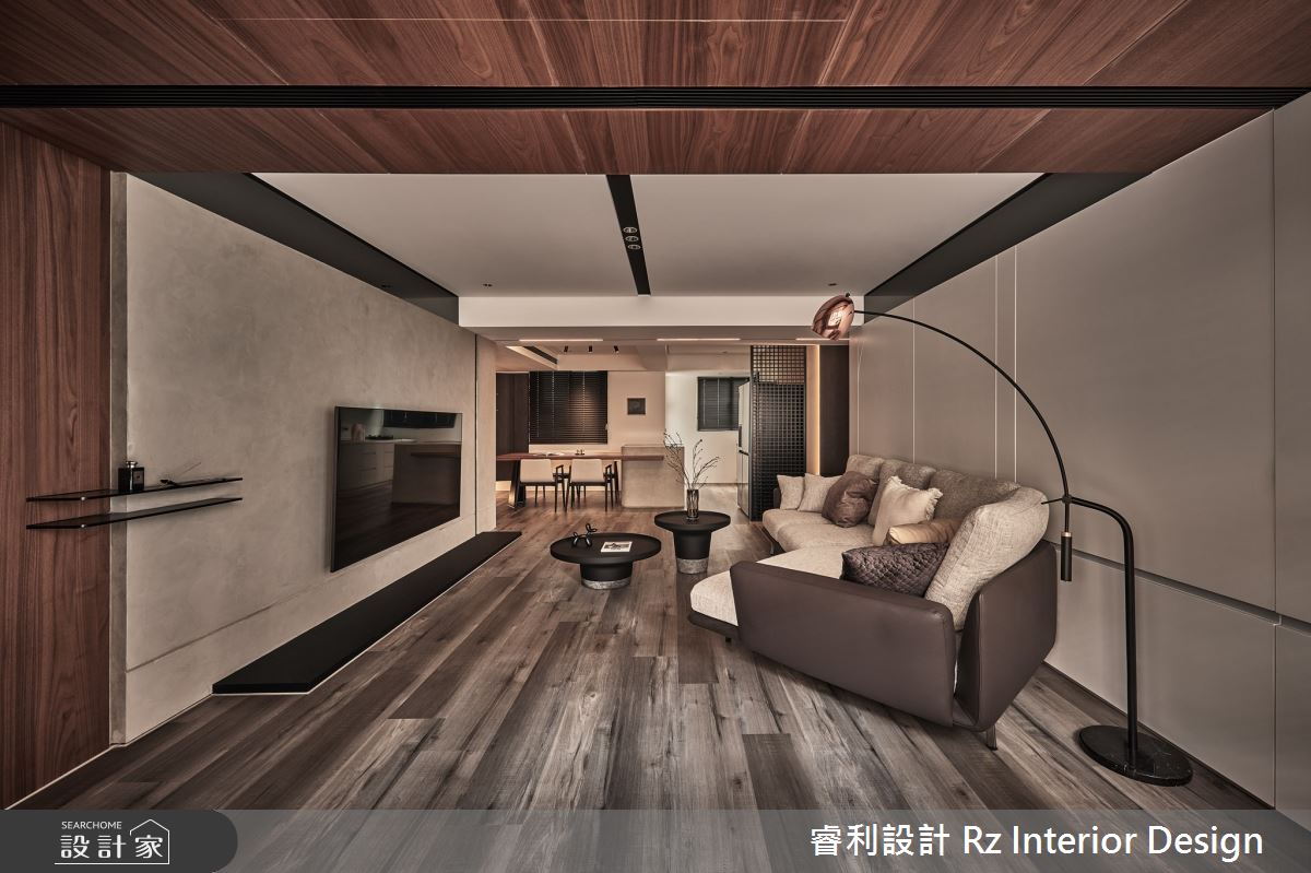 睿利設計以油漆、乳膠漆、木地板、鐵件、灰鏡、鍍鈦金屬、木作貼皮、烤漆、系統板材、水泥/水泥粉光、石材、線板、噴漆的搭配應用,呈現混搭風居家氛圍,將此間26坪、兩房、單層、新成屋(5年以下)打造成舒適愜意的家庭空間,完成2位大人全家人的夢想之居。
