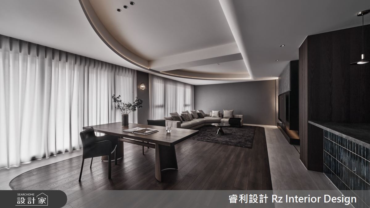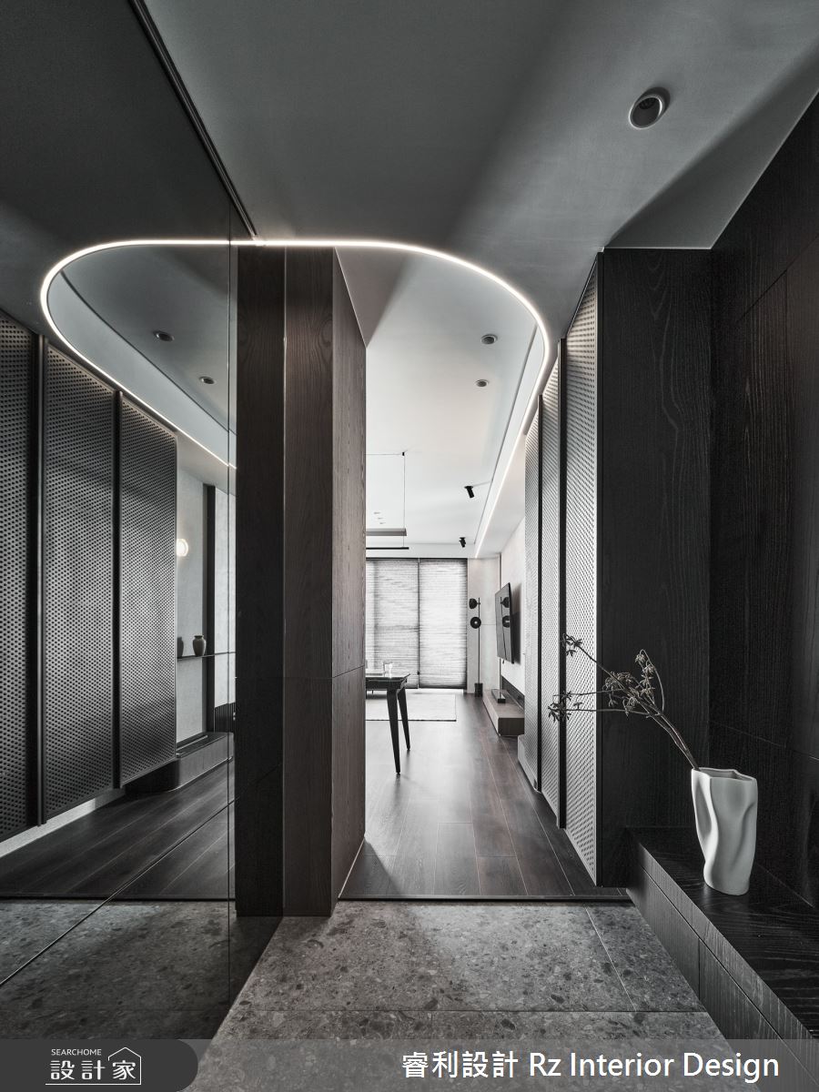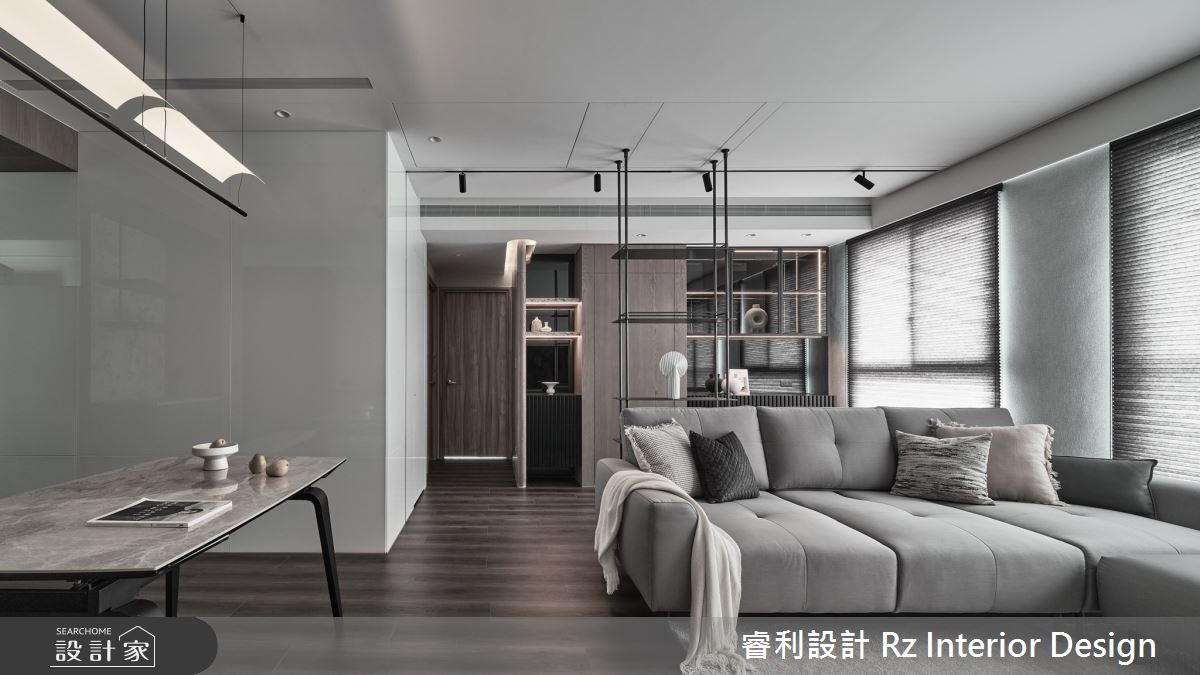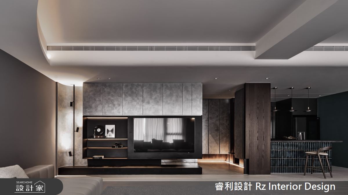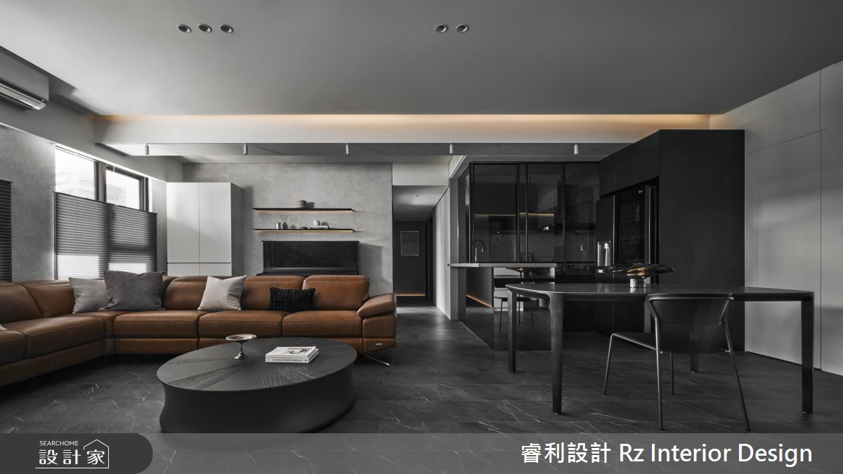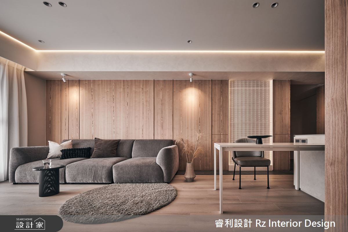 睿利設計以油漆、鐵道磚、超耐磨木地板、不鏽鋼、鐵件、灰鏡、鍍鈦金屬、木作貼皮、烤漆、系統板材、磁磚、軌道燈、石材、噴漆的搭配應用,呈現現代風居家氛圍,將此間33坪、三房、單層、新成屋(5年以下)打造成舒適愜意的家庭空間,完成2位大人全家人的夢想之居。