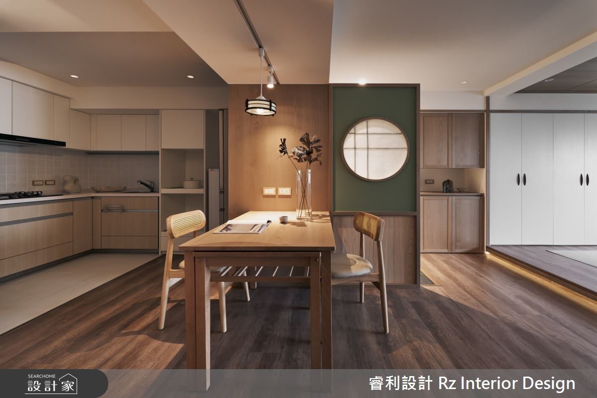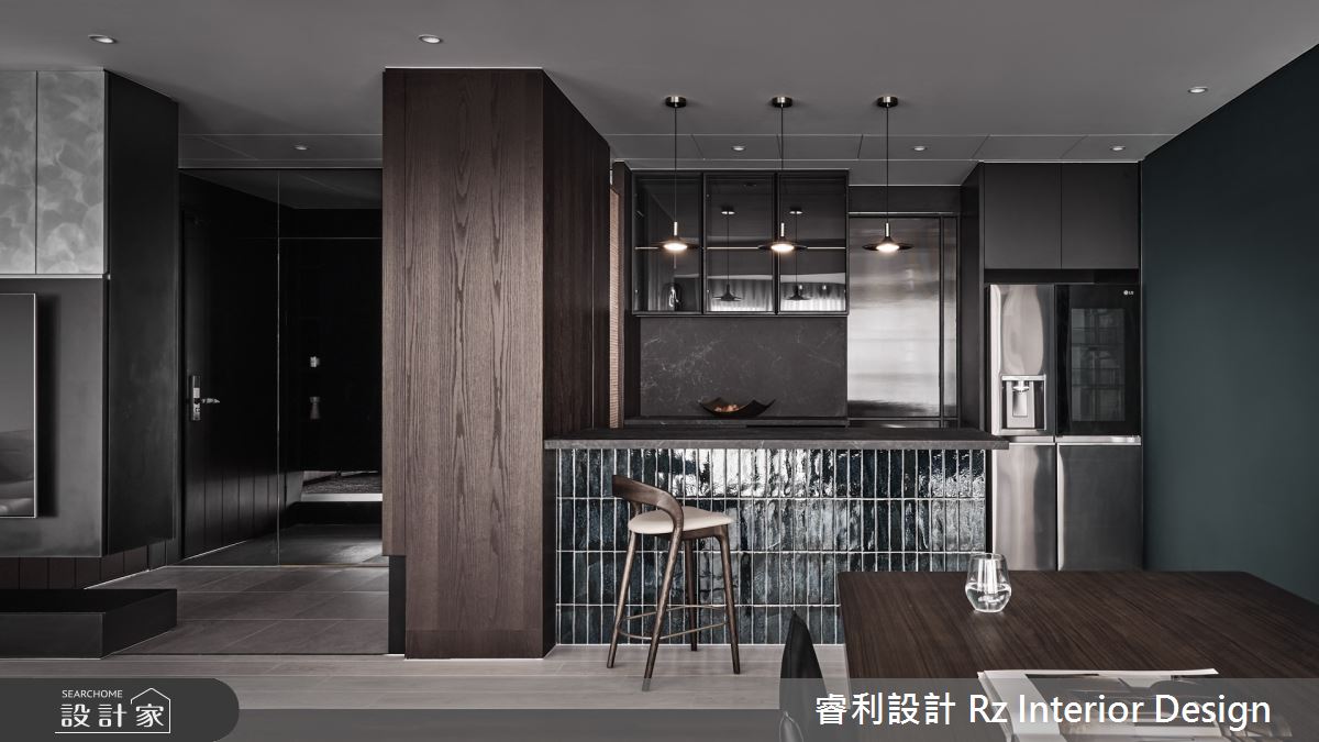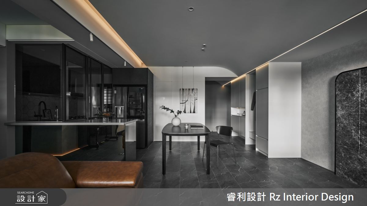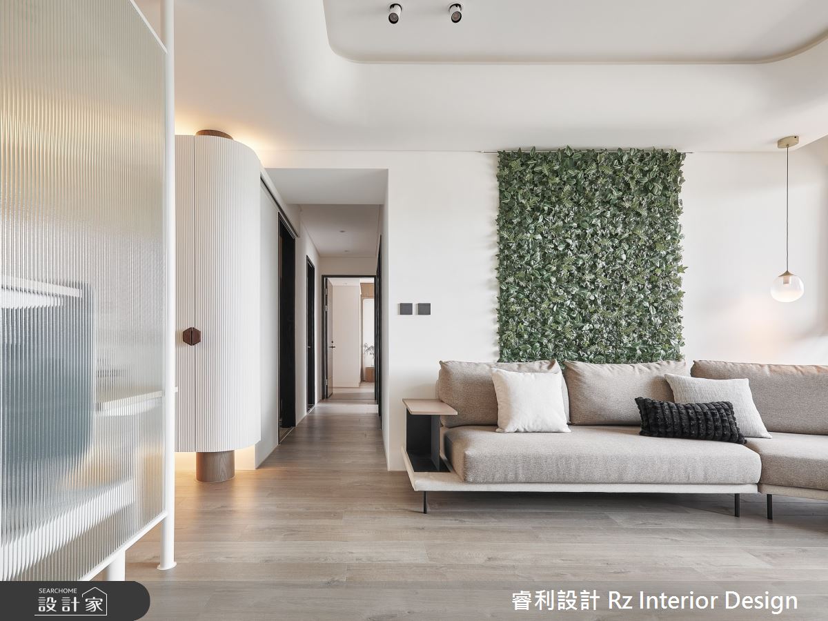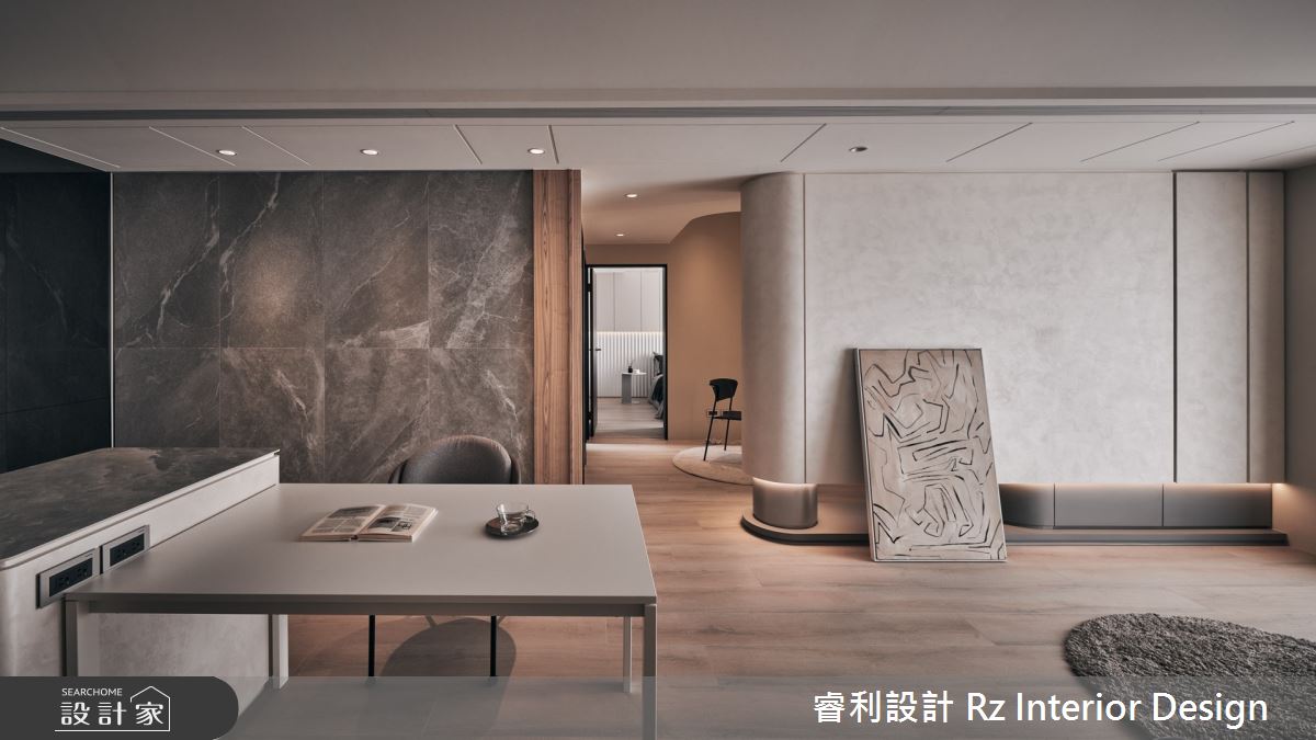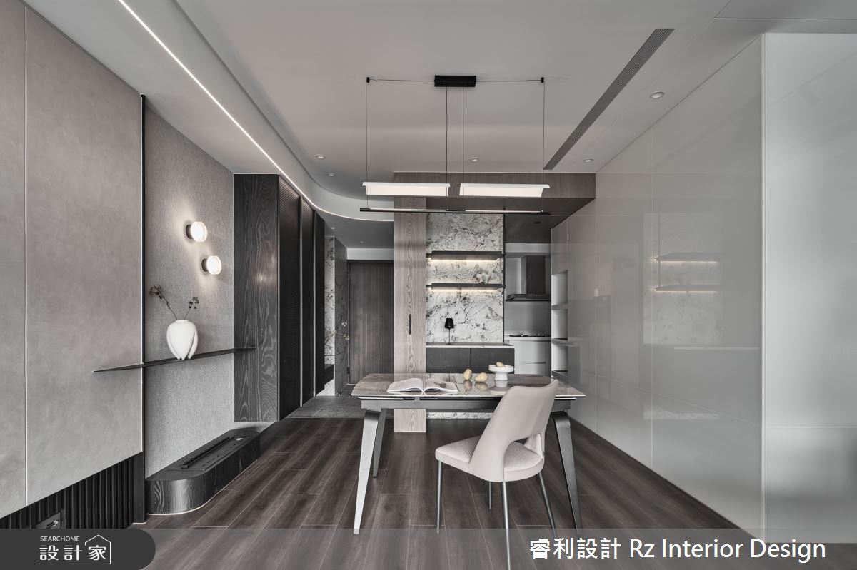 睿利設計以油漆、鐵道磚、超耐磨木地板、不鏽鋼、鐵件、灰鏡、鍍鈦金屬、木作貼皮、烤漆、系統板材、磁磚、軌道燈、石材、噴漆的搭配應用,呈現現代風居家氛圍,將此間33坪、三房、單層、新成屋(5年以下)打造成舒適愜意的家庭空間,完成2位大人全家人的夢想之居。
