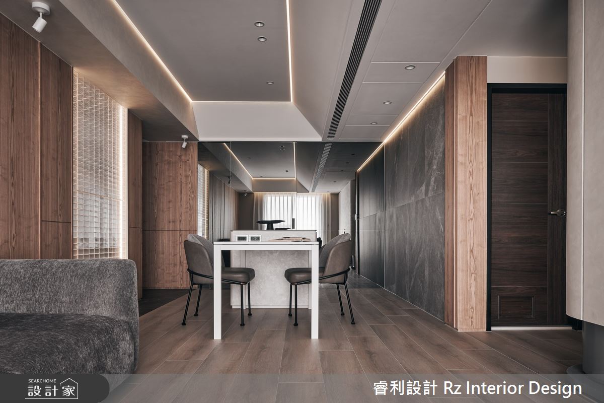 睿利設計以油漆、壁紙、超耐磨木地板、不鏽鋼、鐵件、灰鏡、茶玻、烤玻、鍍鈦金屬、木作貼皮、大理石、磁磚、水泥/水泥粉光、軌道燈、石材的搭配應用,呈現現代風的風格氣息,將此間50坪新成屋(5年以下)優雅詮釋成舒適愜意的商業空間。