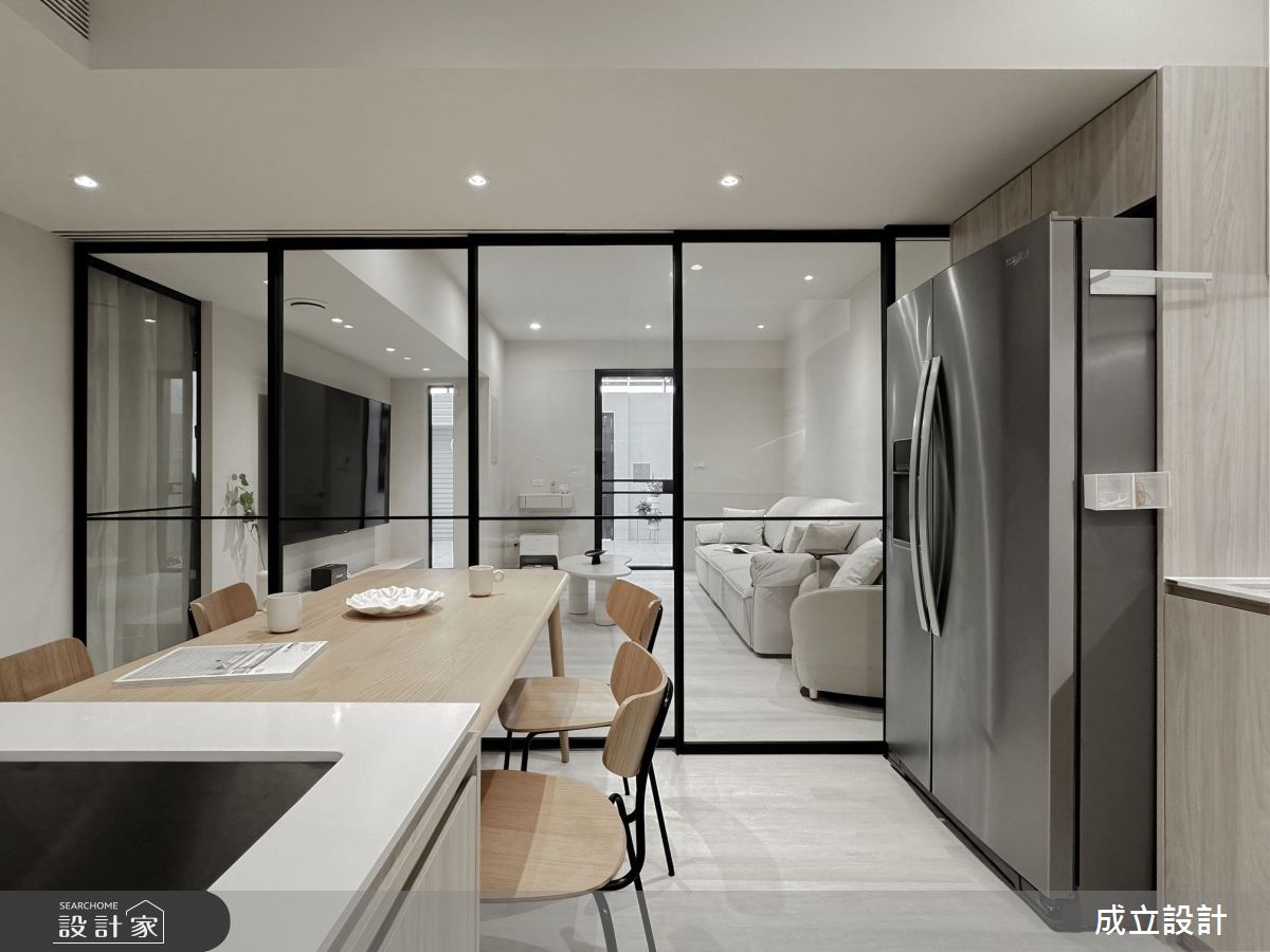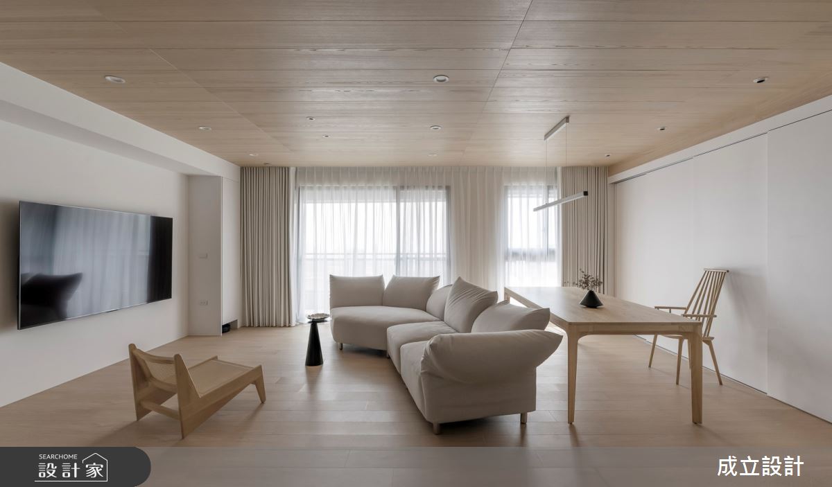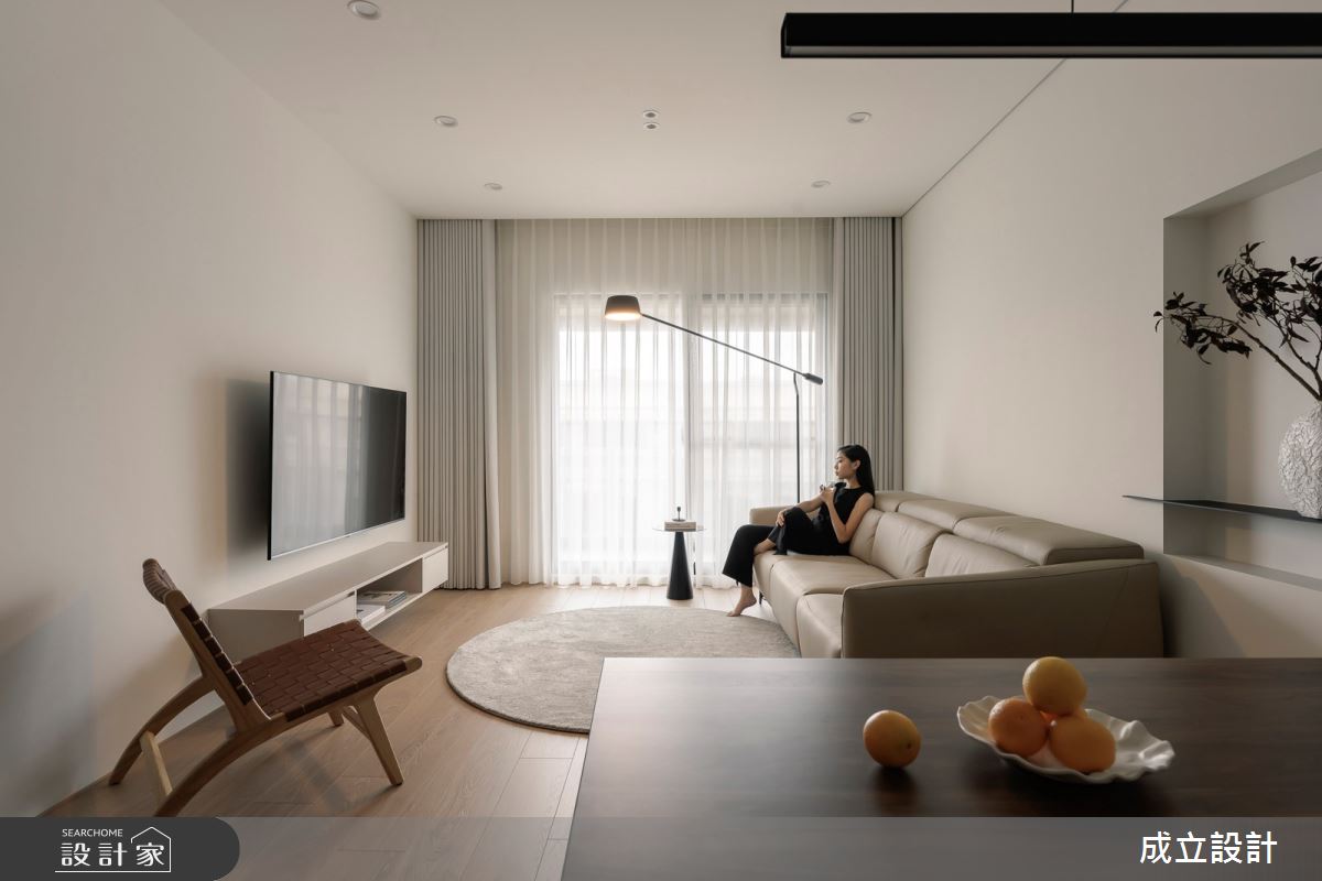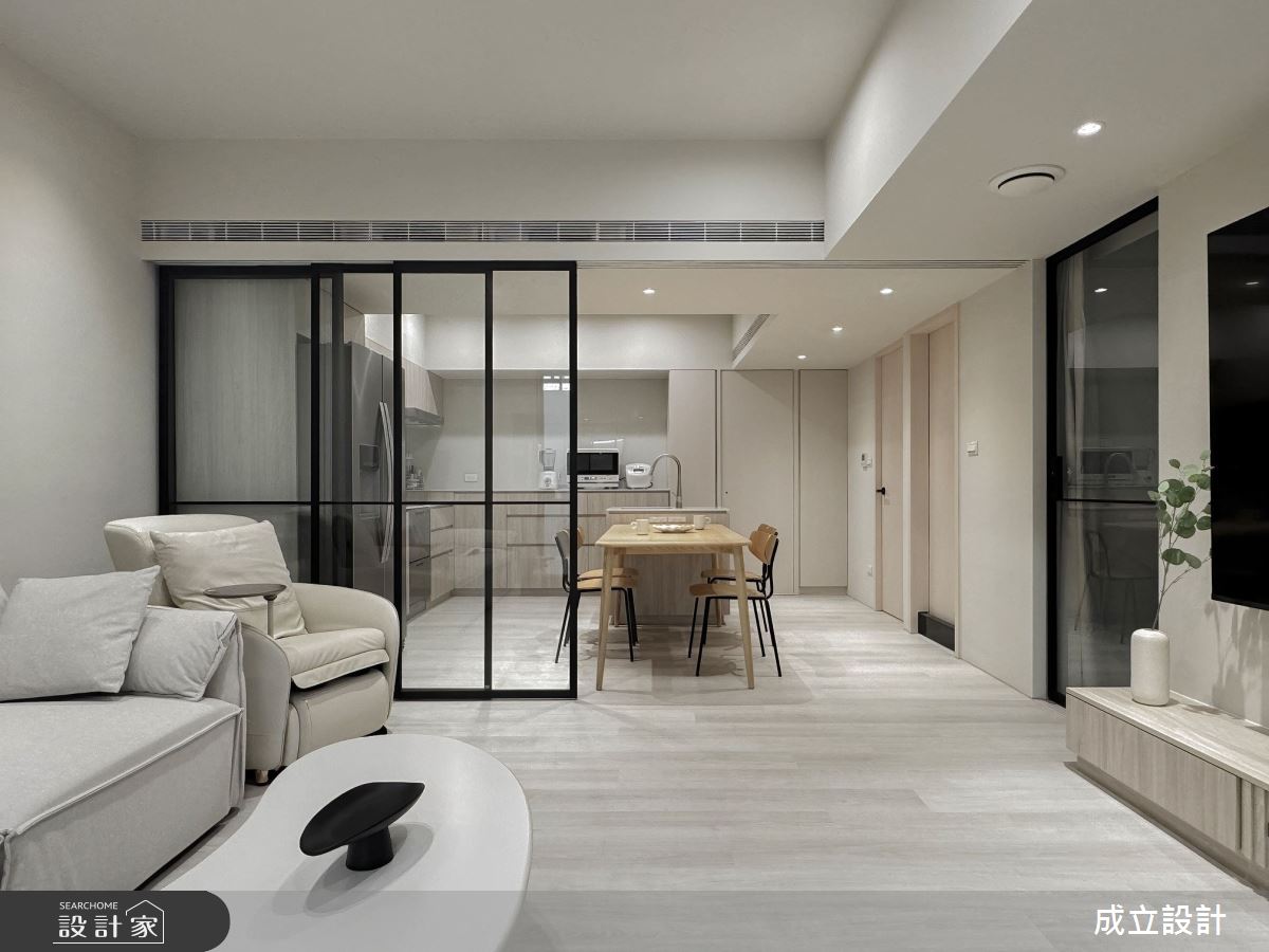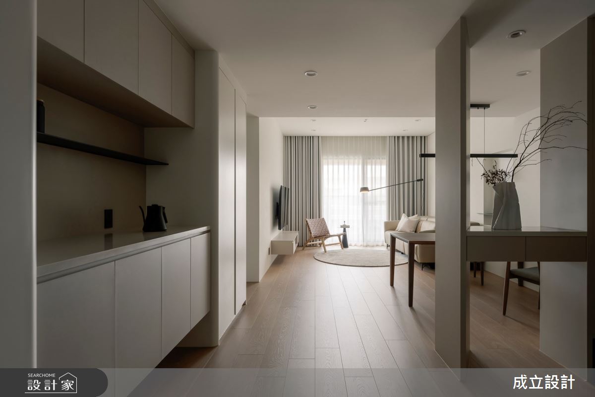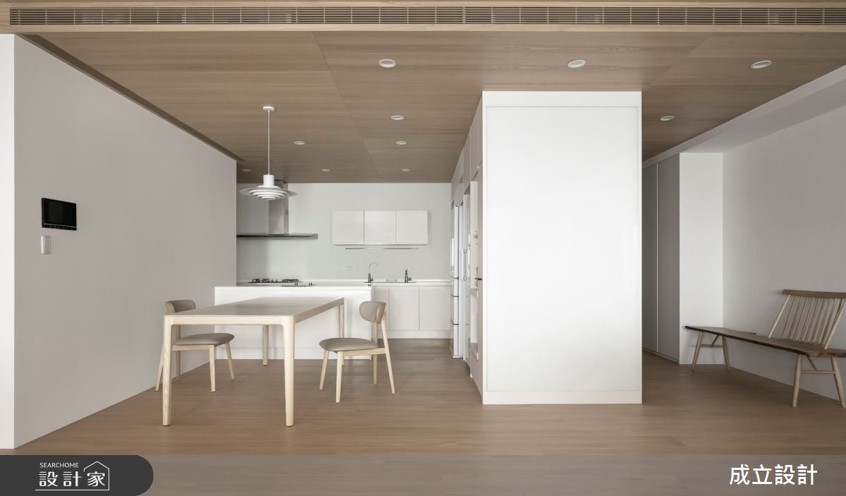由成立設計精心規劃的42坪三房住宅空間,家庭成員一共有2位大人。因應屋主需求,設計師運用簡約風作為主軸,搭配油漆、乳膠漆、木地板、木作貼皮、系統板材、磁磚、水泥/水泥粉光、人造石、賽麗石、軌道燈、石材、SPC地板,打造全家人的夢想家居。