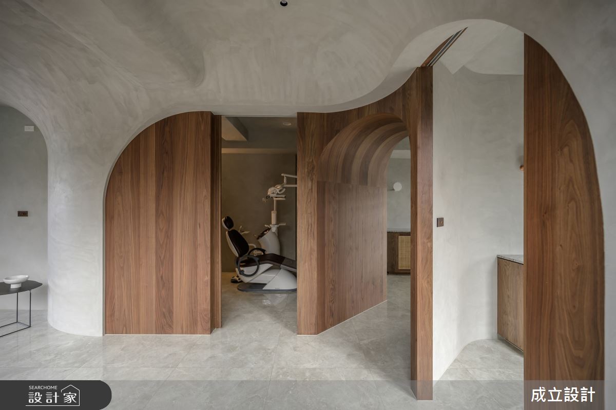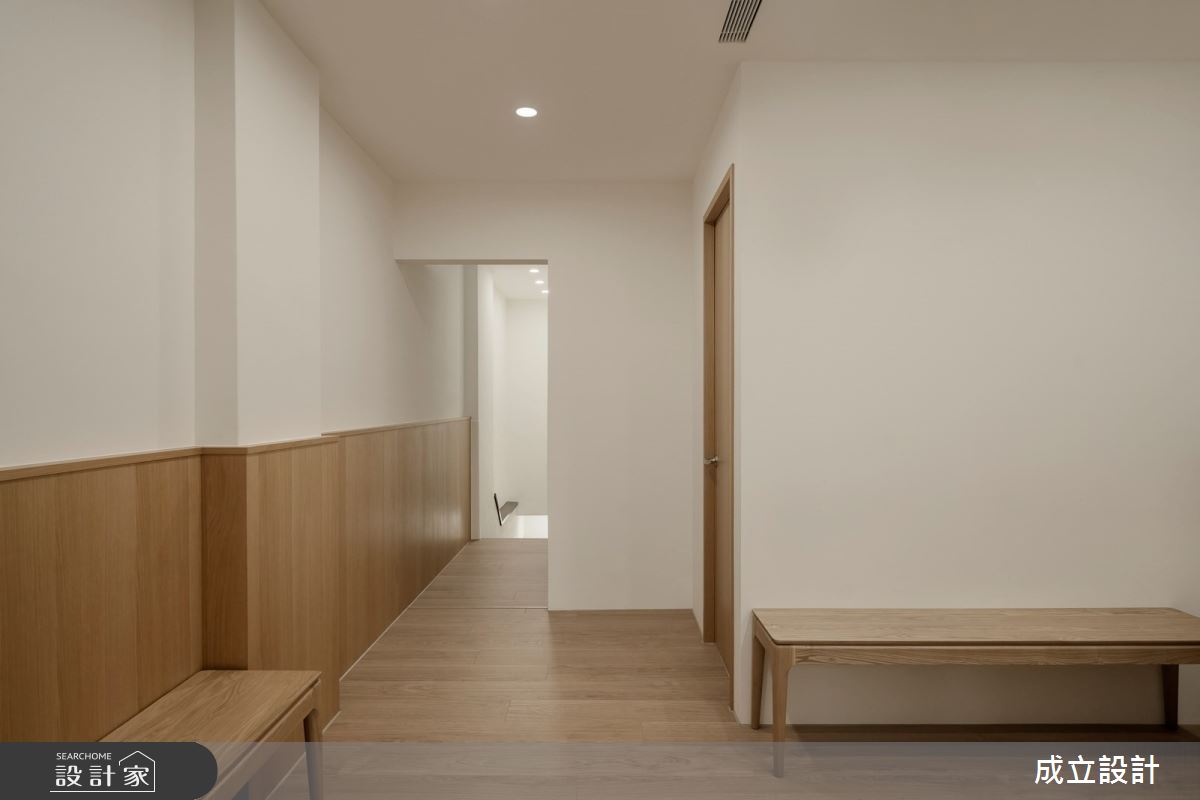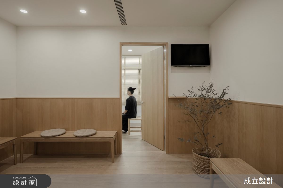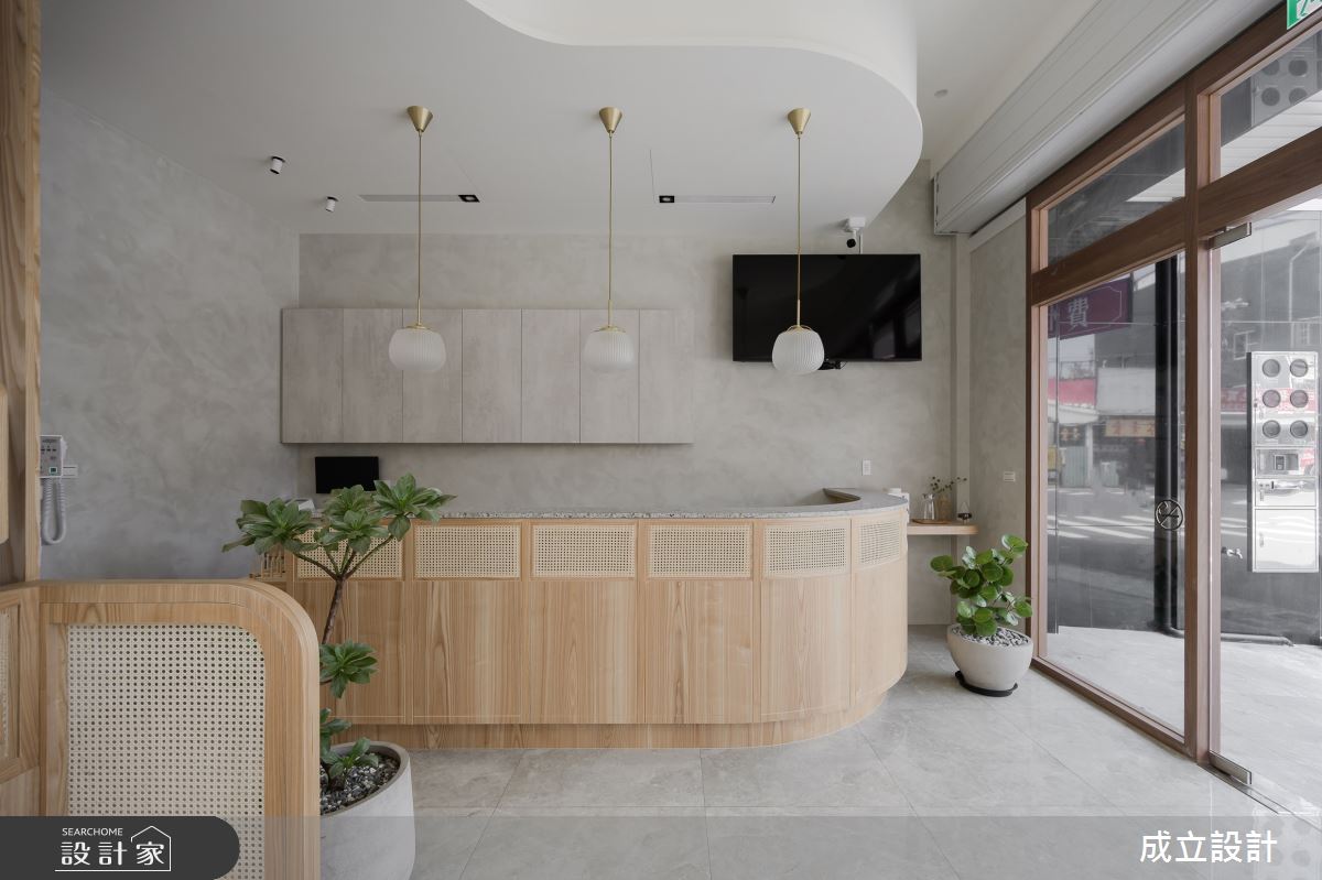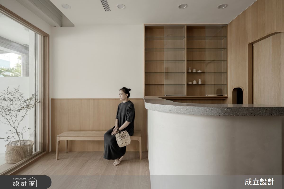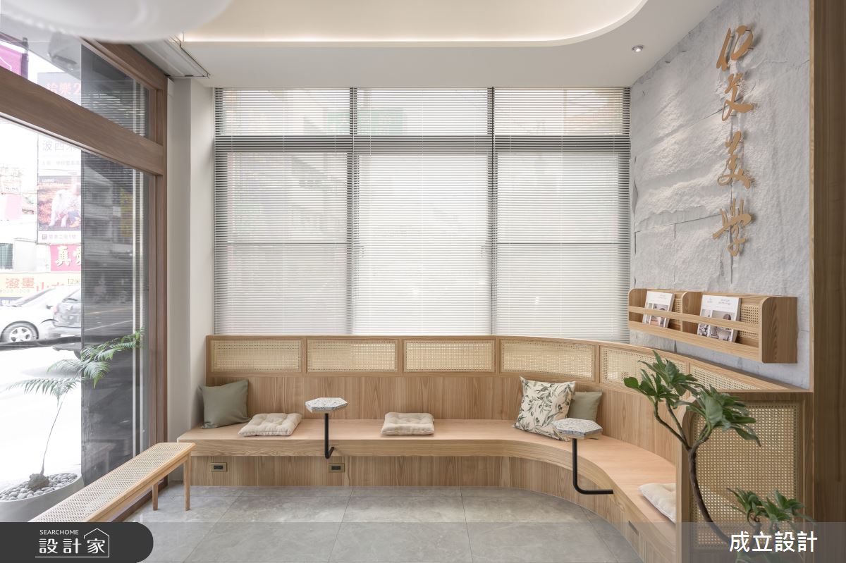 成立設計以乳膠漆、木作貼皮、磁磚、樂土、木百葉、特殊漆、藤編、水磨石、石皮的搭配應用,呈現Japandi風的風格氣息,將此間60坪新成屋(5年以下)優雅詮釋成舒適愜意的商業空間。