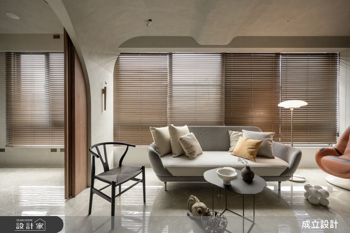 成立設計以乳膠漆、水泥漆、超耐磨木地板、木作貼皮、烤漆、磁磚、木百葉、人造石、石材、噴漆的搭配應用,呈現簡約風居家氛圍,將此間39坪、三房、單層、新成屋(5年以下)打造成舒適愜意的家庭空間,完成2位大人全家人的夢想之居。