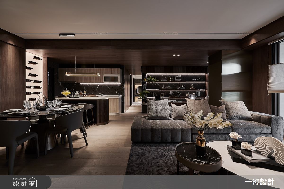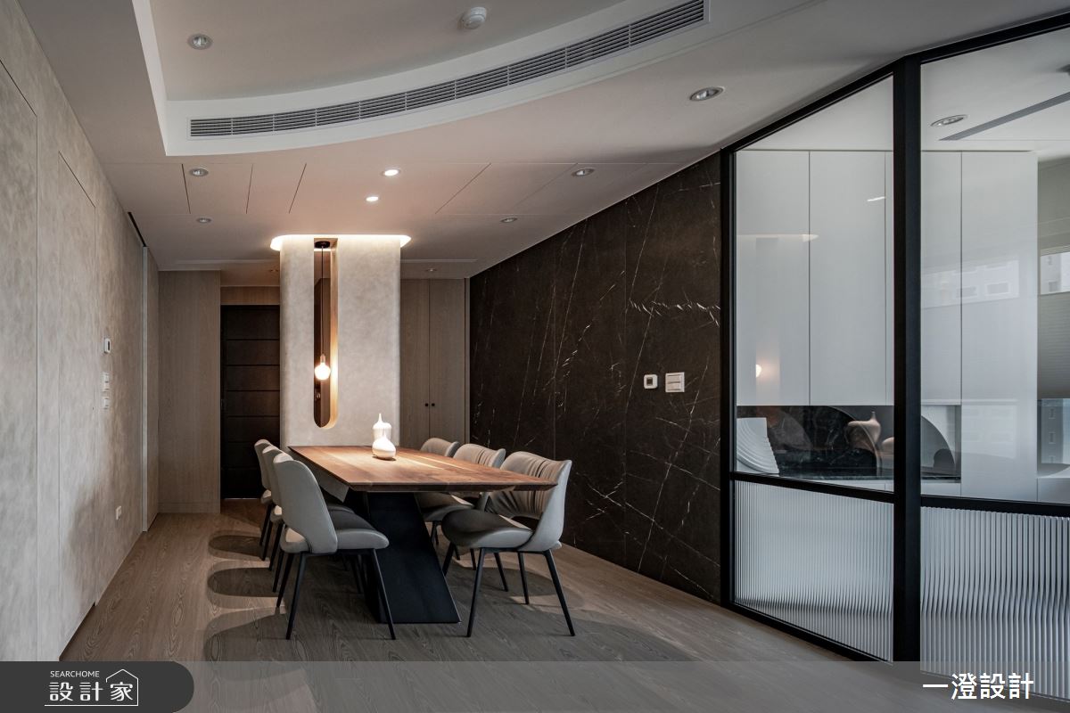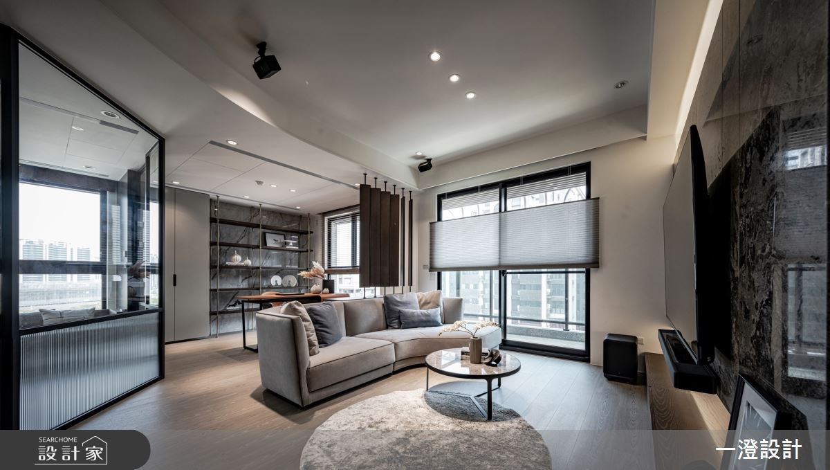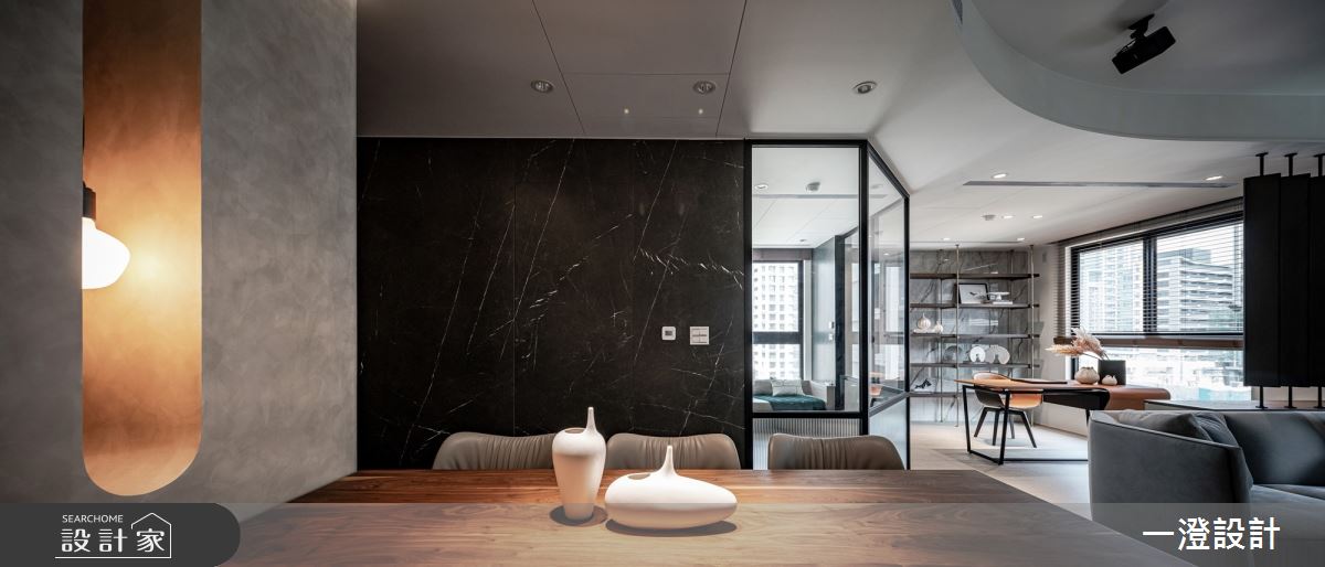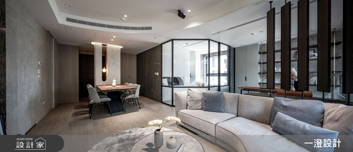 一澄設計事業以天然石材、天然木皮染色、金屬烤漆、玻璃隔間、木質地板的搭配應用,呈現現代輕奢風居家氛圍,將此間51坪、四房打造成舒適愜意的家庭空間,完成全家人的夢想之居。