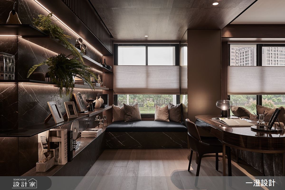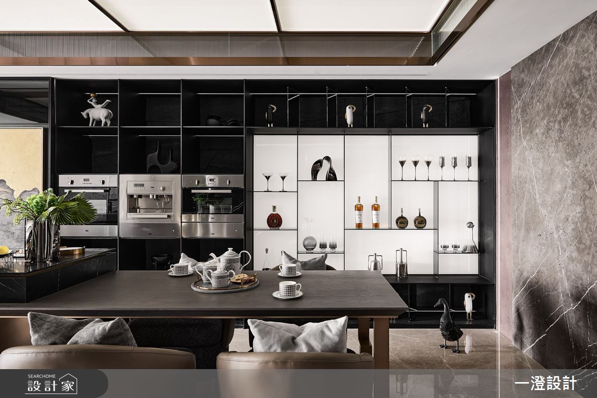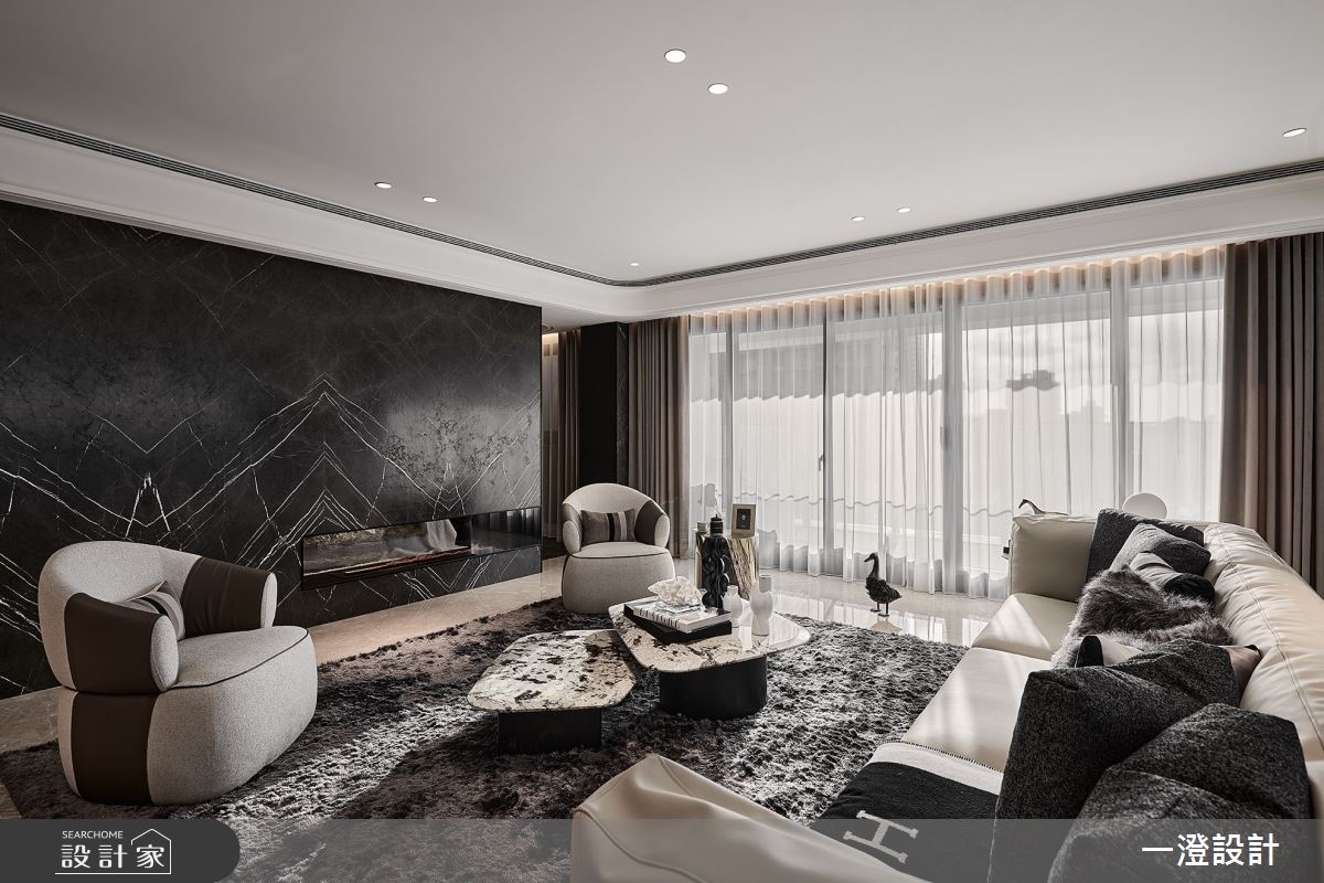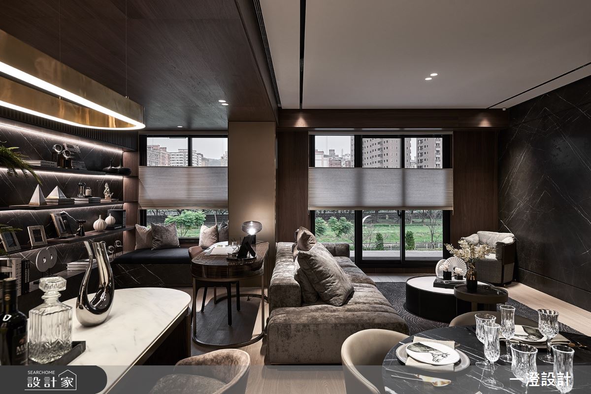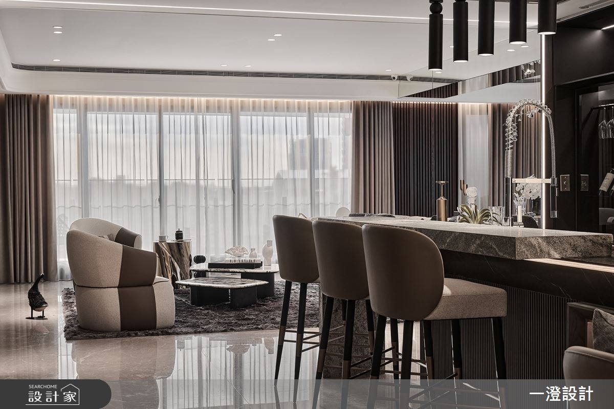 一澄設計事業以天然石材、天然木皮染色、金屬烤漆、玻璃隔間、木質地板的搭配應用,呈現現代輕奢風居家氛圍,將此間51坪、四房打造成舒適愜意的家庭空間,完成全家人的夢想之居。