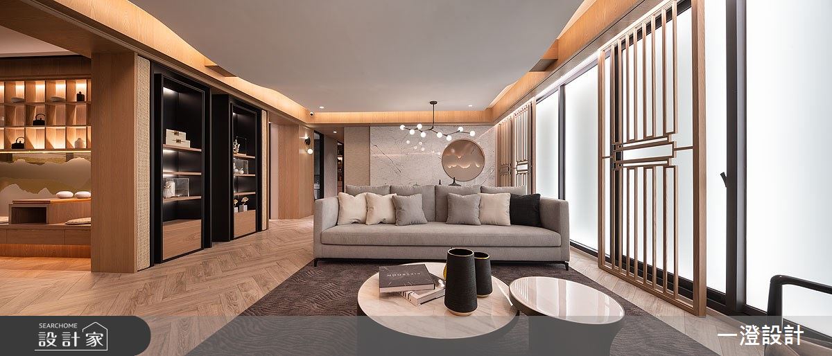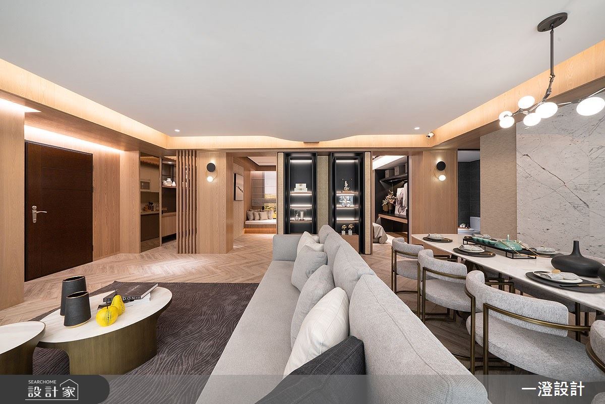 由一澄設計事業精心規劃的50坪四房住宅空間。因應屋主需求,設計師運用輕奢華風作為主軸,搭配天然石材、海島型木地板、天然木皮染色、鍍鈦折板、皮革、透光雲石,打造全家人的夢想家居。