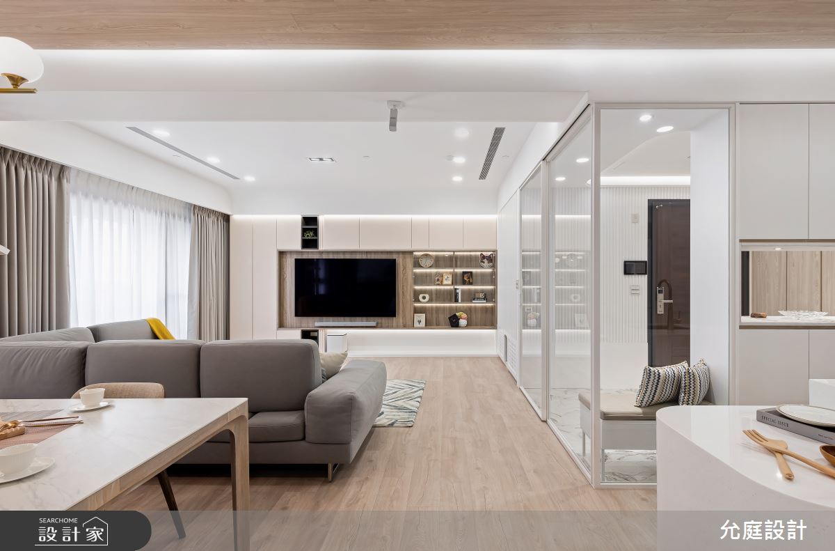 允庭室內裝修設計有限公司以乳膠漆、水泥漆、超耐磨木地板、鐵件、灰鏡、烤玻、烤漆、系統板材、磁磚、人造石、義大利塗料的搭配應用,呈現現代風居家氛圍,將此間15坪、兩房、單層、新成屋(5年以下)打造成舒適愜意的家庭空間,完成2位大人全家人的夢想之居。