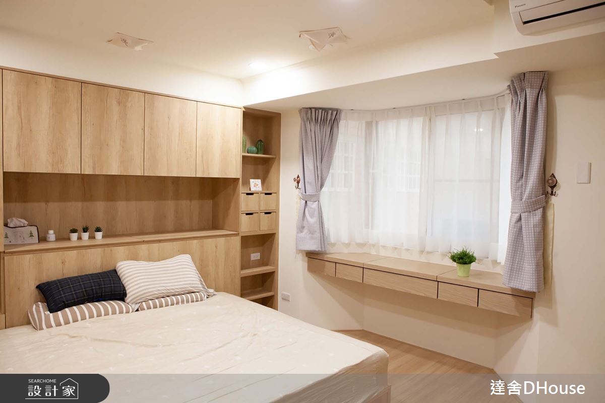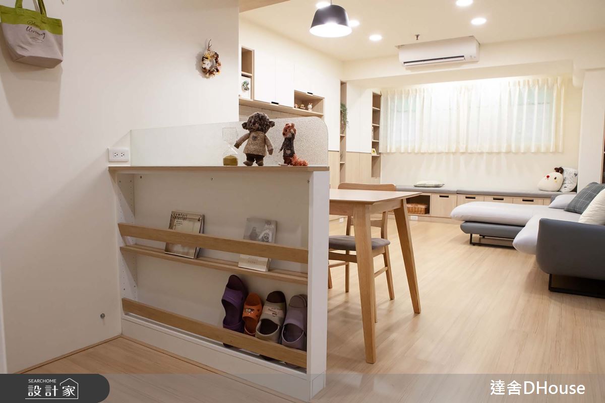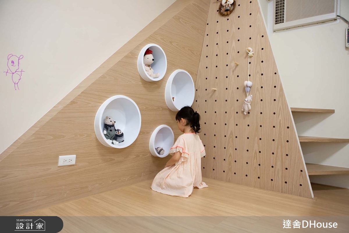 利用半腰式淺鞋櫃分割入口玄關與餐廳區,搭配樑下裝飾板與餐桌吊燈設計,劃出開放式餐桌區,同時化解開門見樑的視覺壓迫感。將原本閒置的吧檯區改造為男主的半開放式書房,後方牆面搭配櫃體做延伸;心愛的公仔有了展示收藏空間,也避免後面走道來往走動產生打擾。而恰好位在全區中心點的書房,更有180度的視野可照看到客廳至小孩房區域,將緊鄰廚房的客臥改造為兒童房,在去除一部分的隔間牆之後搭配雙面矮櫃設計,為廚房提供了不影響原有走道寬度的置物空間;同時兒童房增加了書架、衣櫃及儲物空間。矮櫃上方採用透明玻璃隔屏,既阻隔油煙也讓女主備餐同時仍能看見兒童房動靜。連結矮櫃延伸設計高櫃及小閱讀臥榻,臥榻上方預留掛衣桿做為日後彈性增加的衣櫃空間。因為小朋友活動力強,角落特別設計造型階梯,日後也可做為製物層架,牆面白板漆則成為小朋友盡情揮灑創作的畫布。一個個設計的細節,皆來自於家人對於生活空間需求的體現。圖文提供_達舍創研所