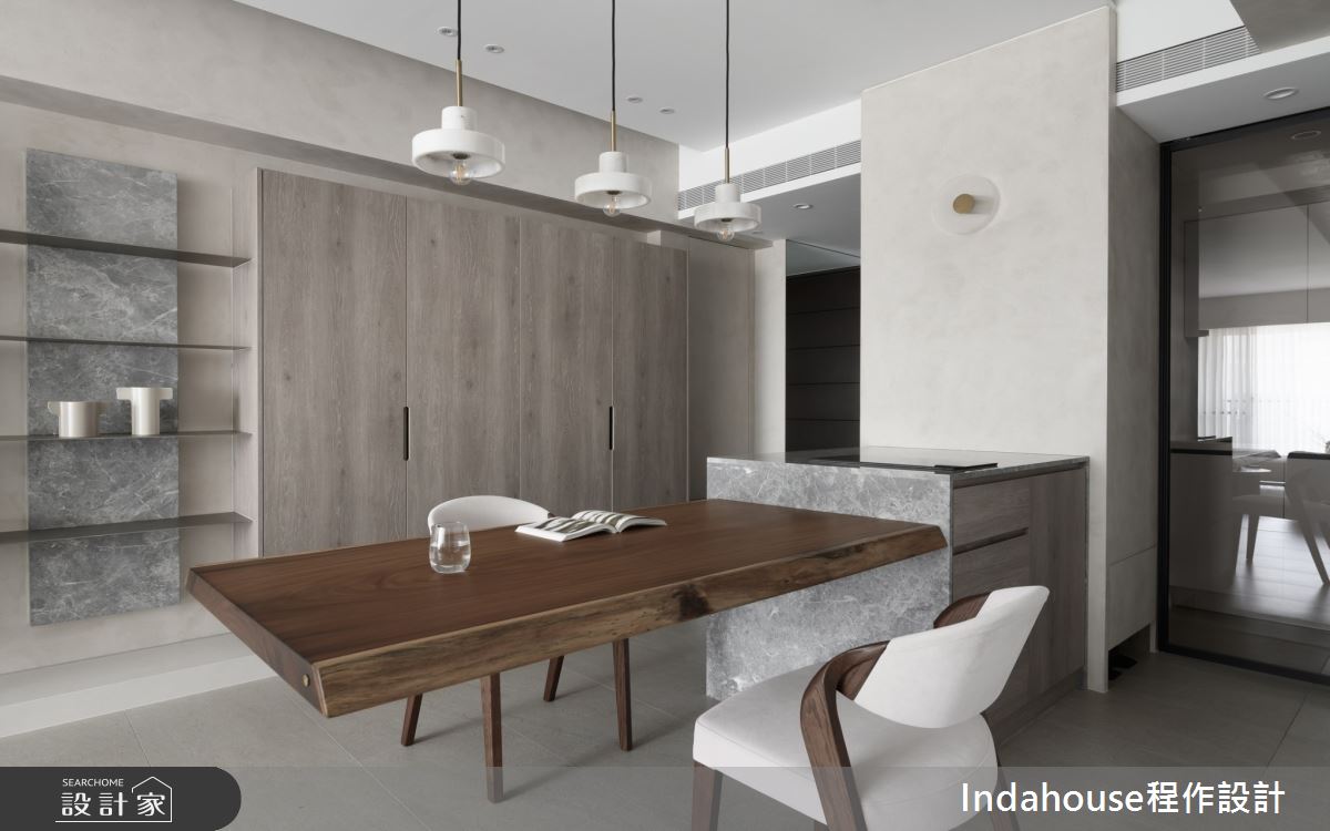 Indahouse程作設計以鐵件、系統板材、大理石、藝術塗料、非洲柚木、枚板的搭配應用,呈現現代風居家氛圍,將此間25.5坪、三房、單層、新成屋(5年以下)打造成舒適愜意的家庭空間,完成2位大人全家人的夢想之居。