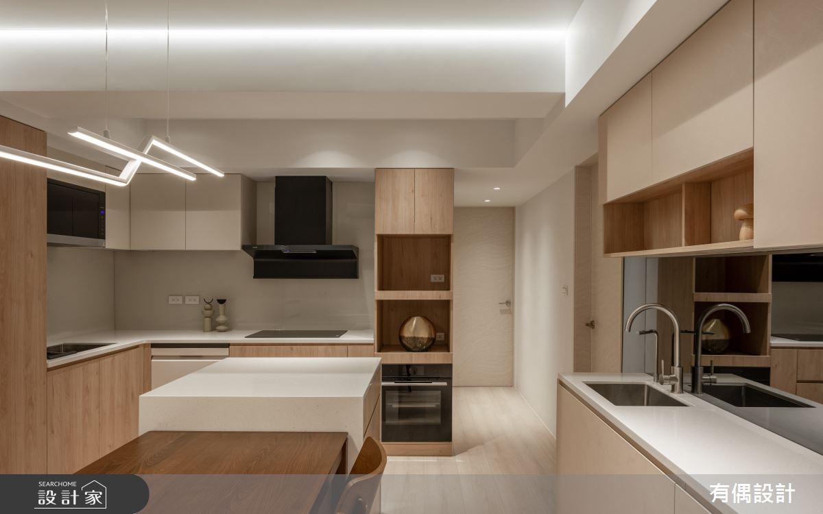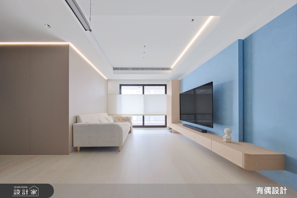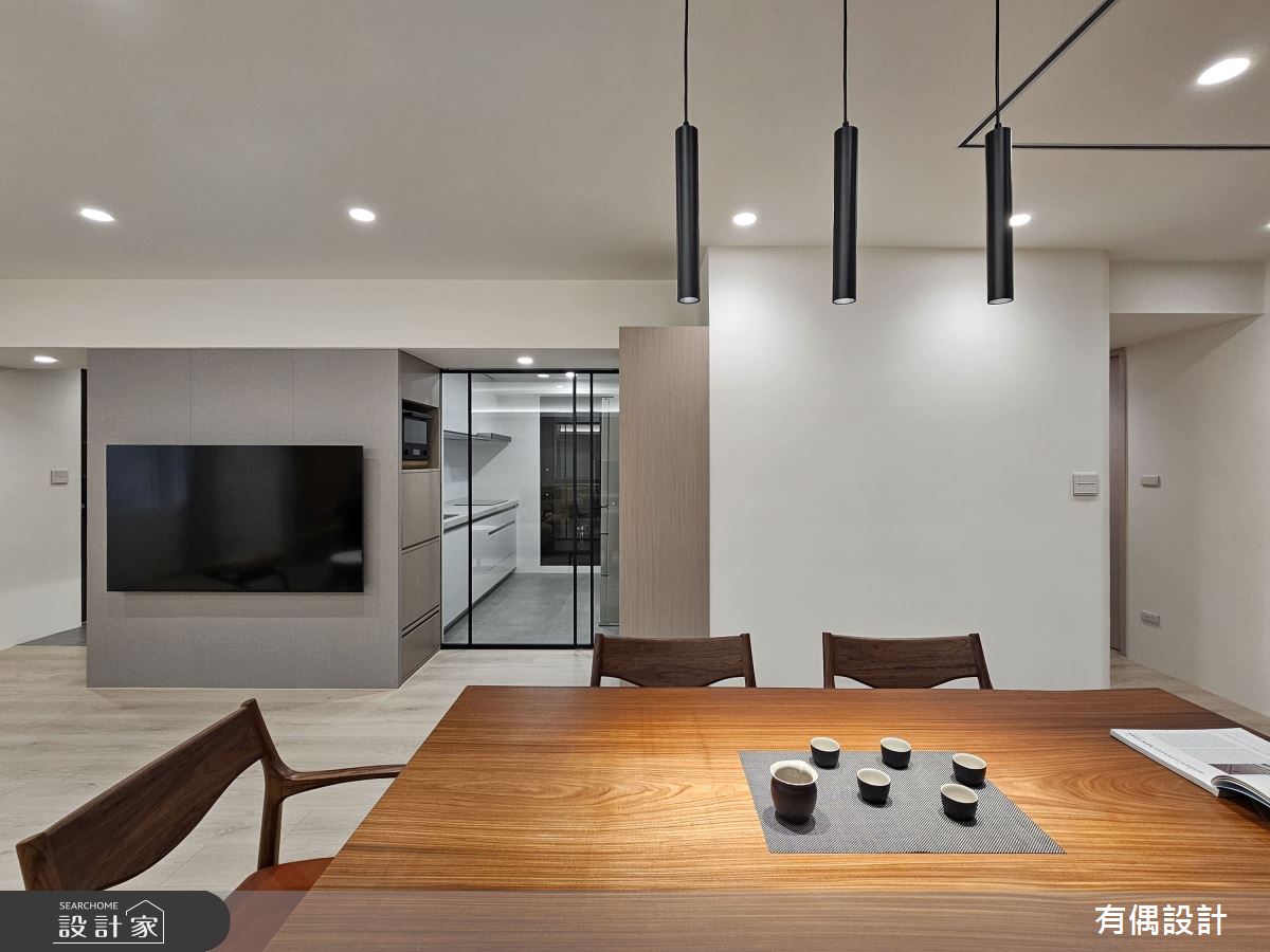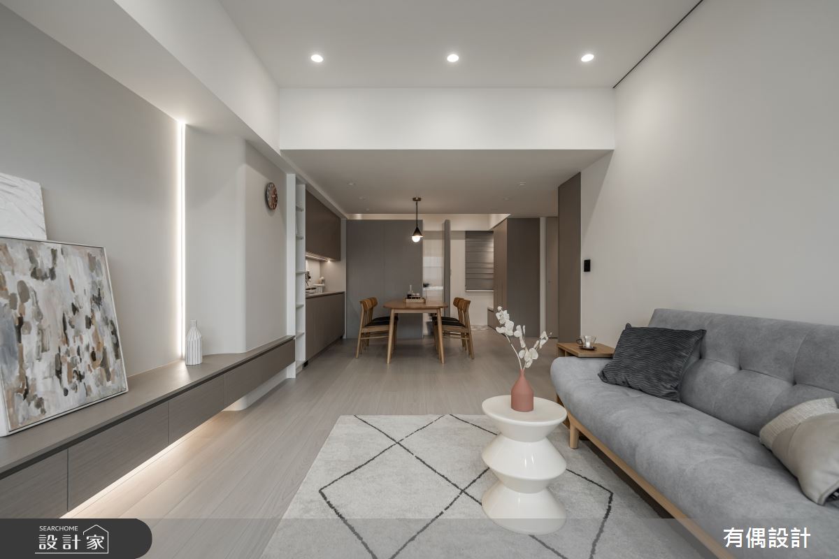由有偶設計精心規劃的30坪三房住宅空間,家庭成員一共有2位大人、1位小孩。因應屋主需求,設計師運用現代侘寂風作為主軸,搭配乳膠漆、超耐磨木地板、鐵件、烤玻、系統板材、磁磚、人造石、軌道燈,打造全家人的夢想家居。