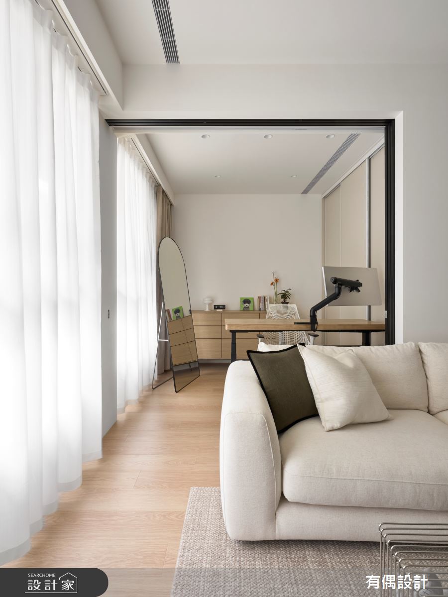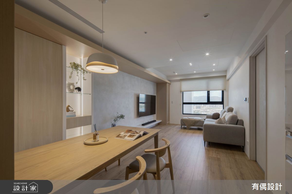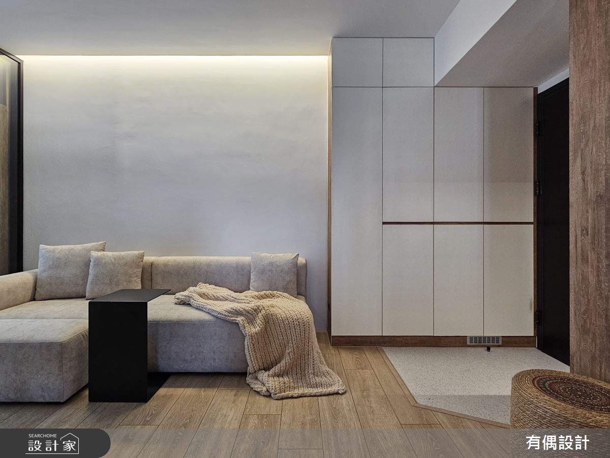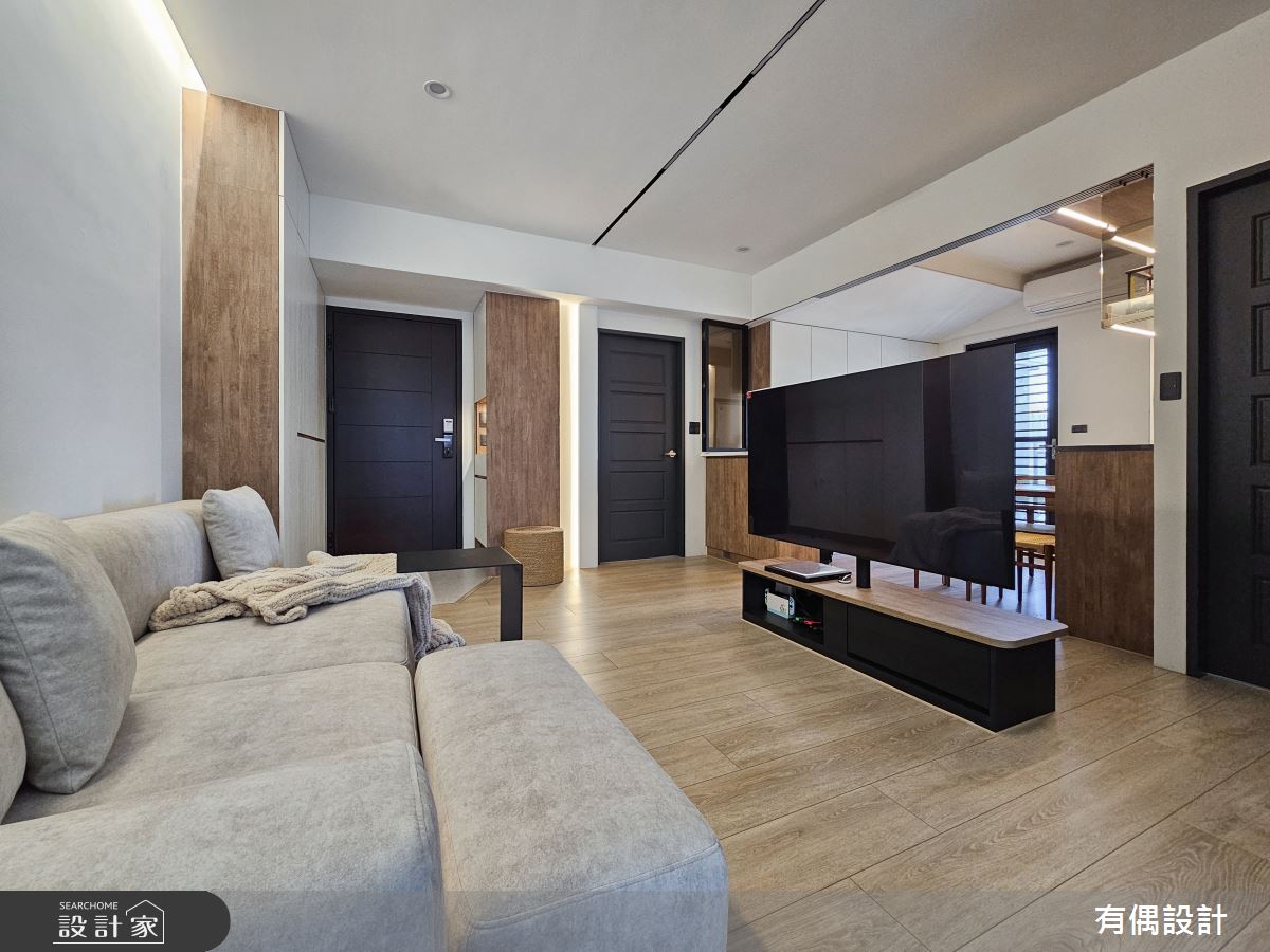 有偶設計以鐵件、木作貼皮、系統板材的搭配應用,呈現日式簡約風居家氛圍,將此間23坪、三房、單層、新成屋(5年以下)打造成舒適愜意的家庭空間,完成1位大人的夢想之居。