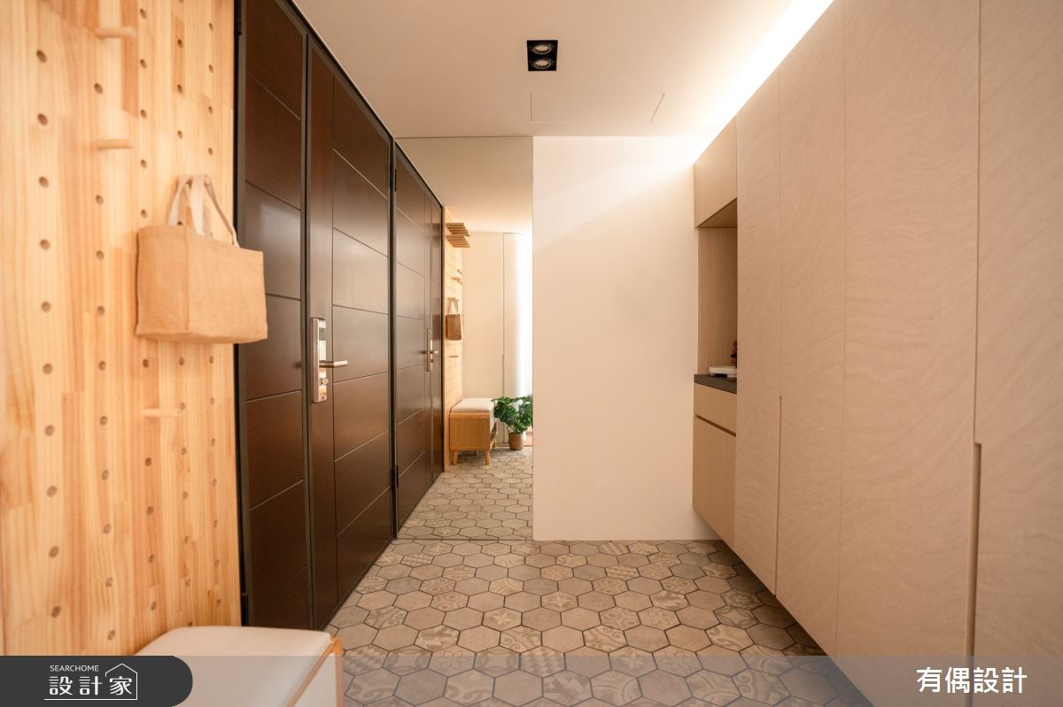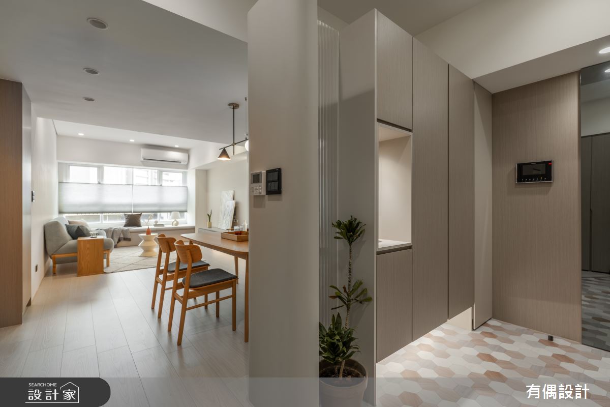 由有偶設計精心規劃的24.5坪兩房住宅空間,家庭成員一共有1位大人、1位長輩。因應屋主需求,設計師運用簡約風作為主軸,搭配乳膠漆、六角磚/蜂巢磚、超耐磨木地板、鐵件、灰鏡、木作貼皮、系統板材、磁磚、人造石,打造全家人的夢想家居。