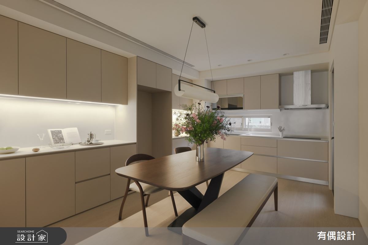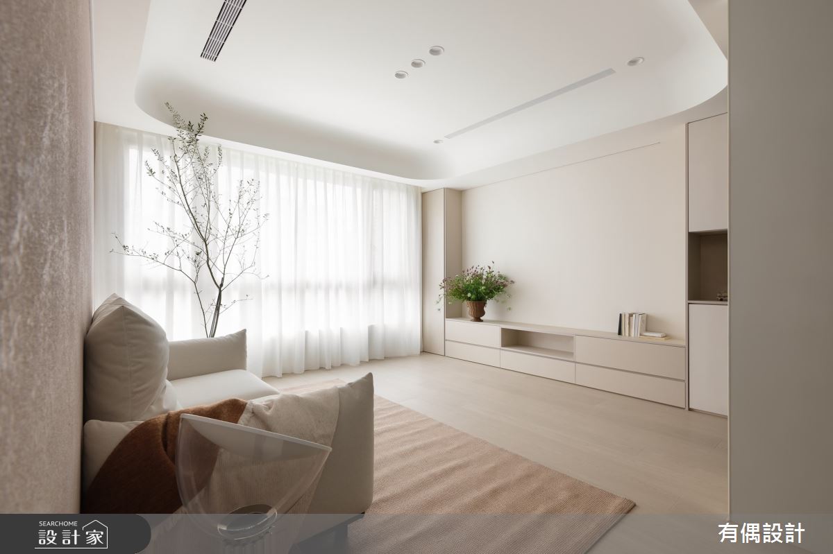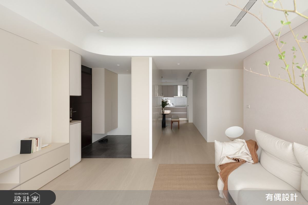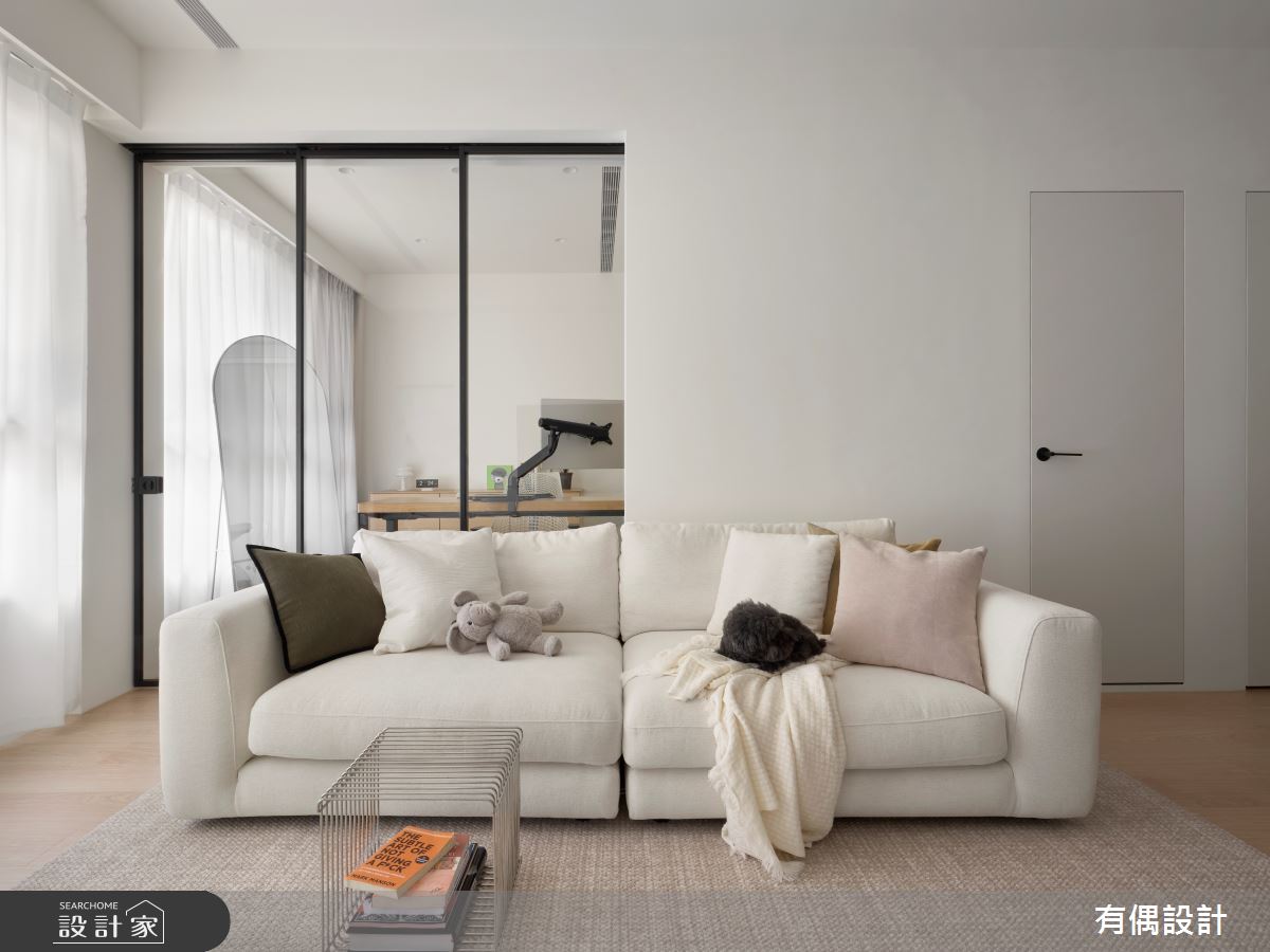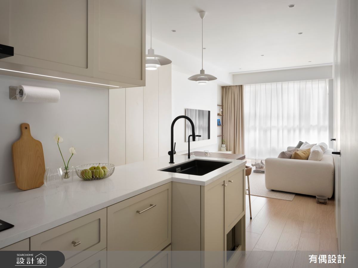 由有偶設計精心規劃的15坪兩房住宅空間,家庭成員一共有2位大人。因應屋主需求,設計師運用現代奶油風作為主軸,搭配乳膠漆、超耐磨木地板、系統板材、石材、噴漆,打造全家人的夢想家居。