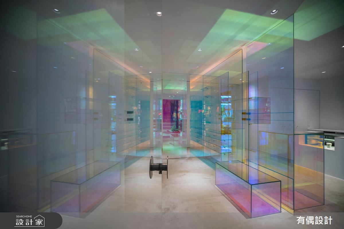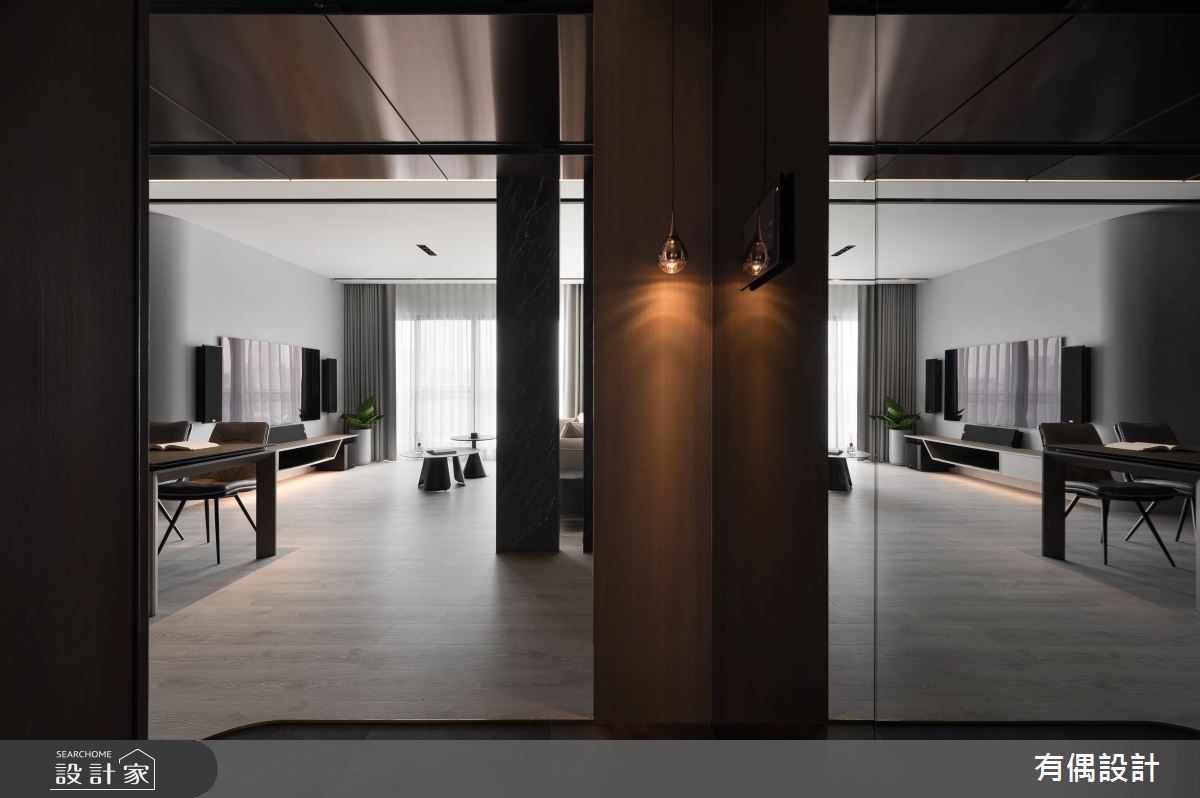 有偶設計以特殊塗料、鍍鈦、智能燈控、藝術繪畫的搭配應用,呈現混搭風居家氛圍,將此間35坪、四房、單層、新成屋(5年以下)打造成舒適愜意的家庭空間,完成全家人的夢想之居。
