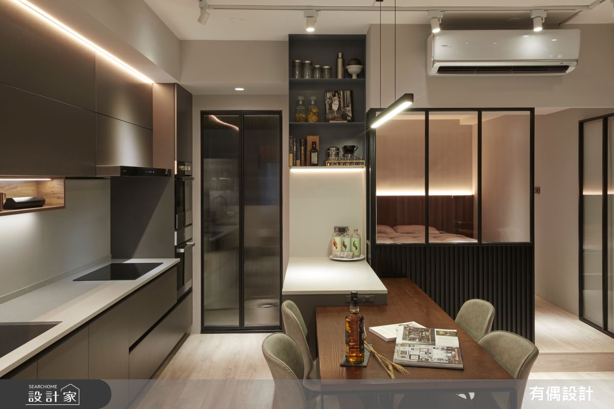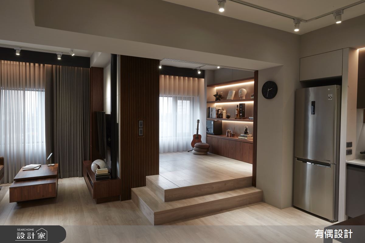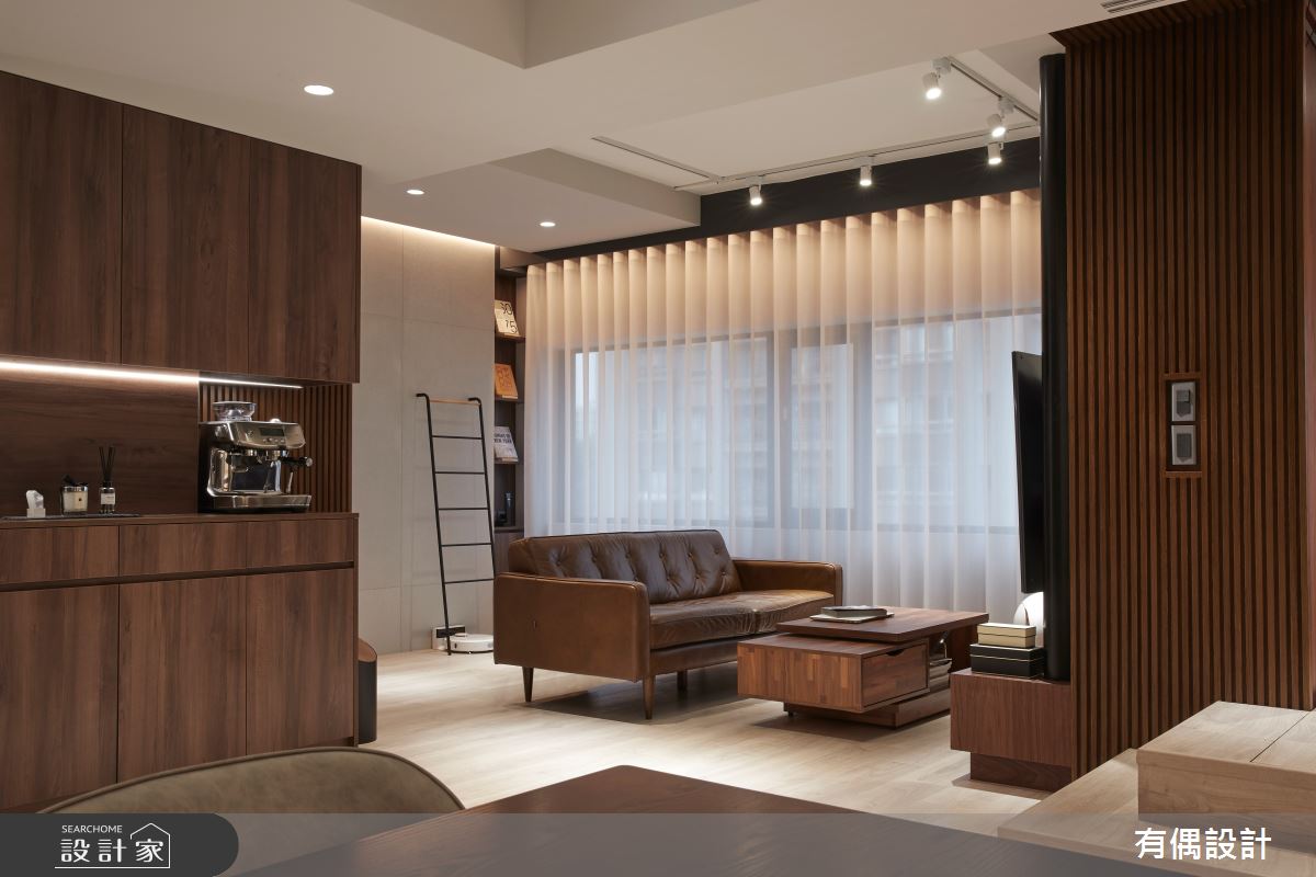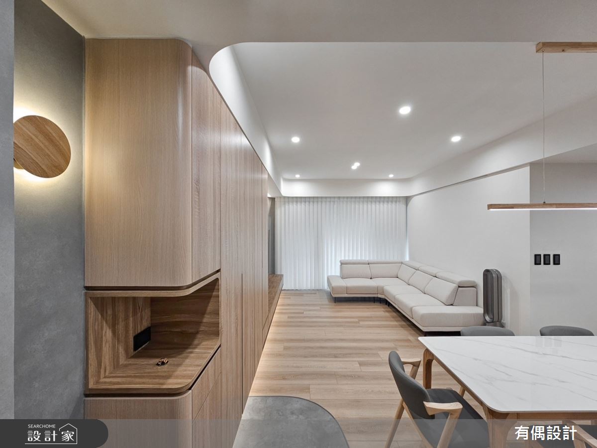 由有偶設計精心規劃的19坪一房住宅空間。因應屋主需求,設計師運用現代風作為主軸,搭配水泥漆、超耐磨木地板、木百葉,打造全家人的夢想家居。