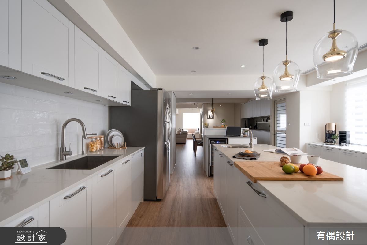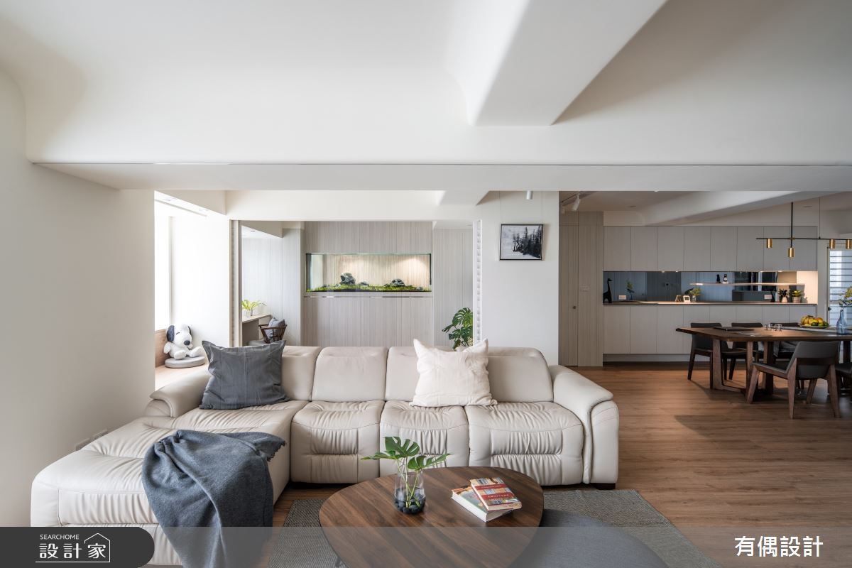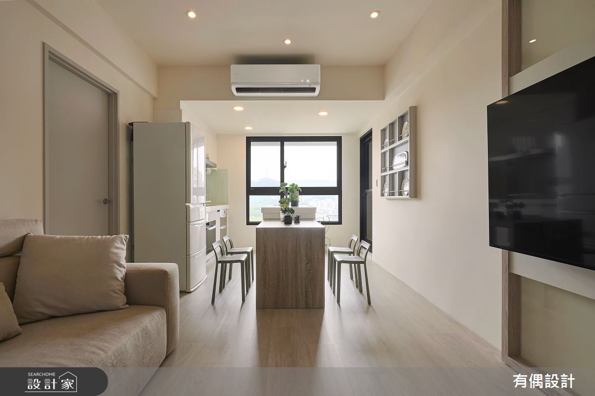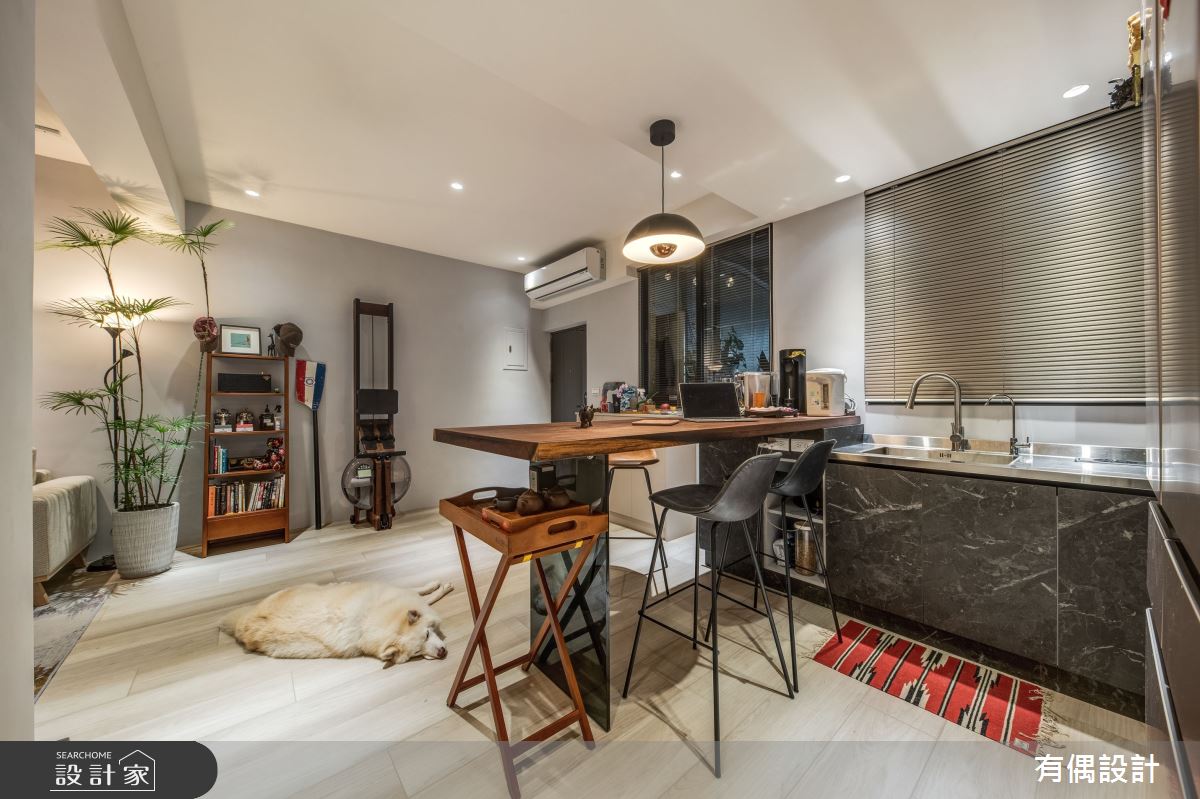 有偶設計以油漆、超耐磨木地板的搭配應用,呈現現代風居家氛圍,將此間22坪、兩房、單層、中古屋(5~15年)打造成舒適愜意的家庭空間,完成全家人的夢想之居。