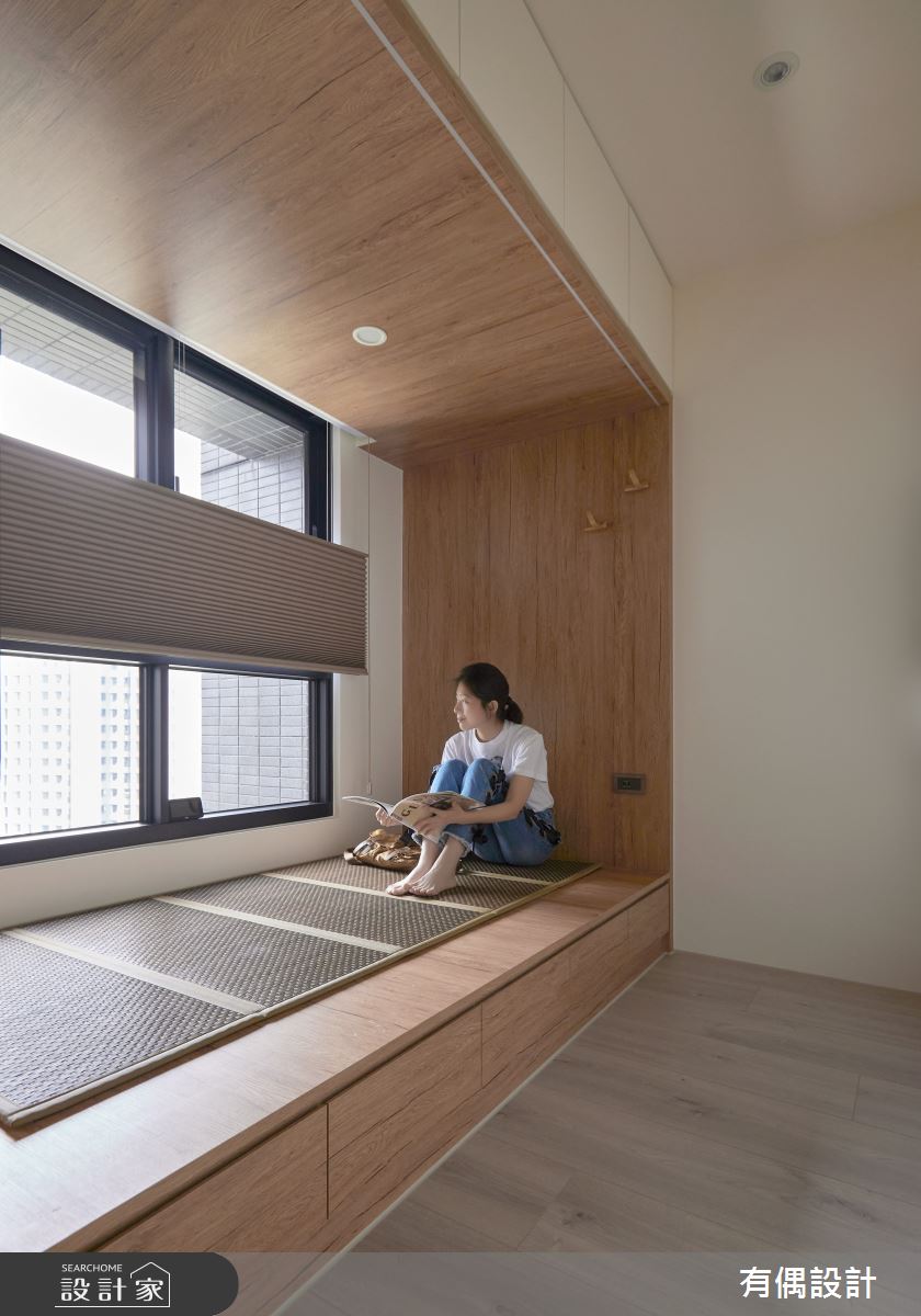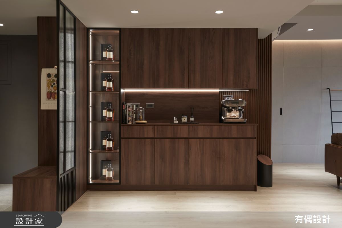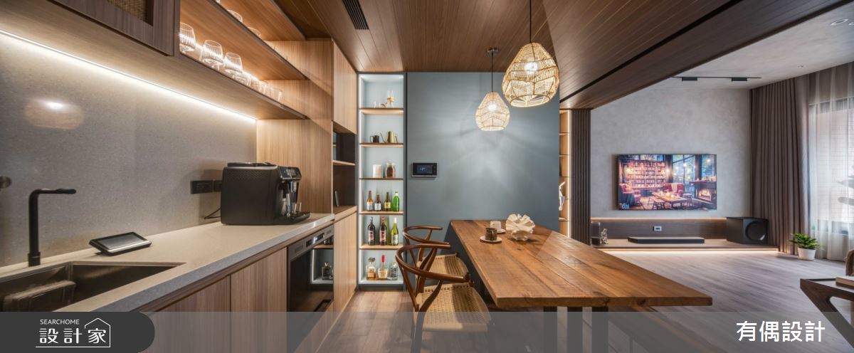 有偶設計以超耐磨木地板、小冰柱玻璃、藤編、藝術漆的搭配應用,呈現侘寂風居家氛圍,將此間27坪、三房、單層、中古屋(5~15年)打造成舒適愜意的家庭空間,完成全家人的夢想之居。