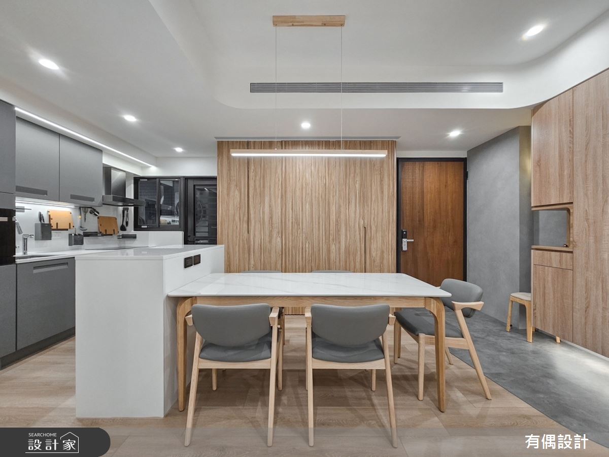 來自有偶設計的50坪現代風住宅案,是一間單層中古屋(5~15年)的三房格局,設計師藉由建材以超耐磨木地板、樂土的搭配應用,實現一家人的理想生活。