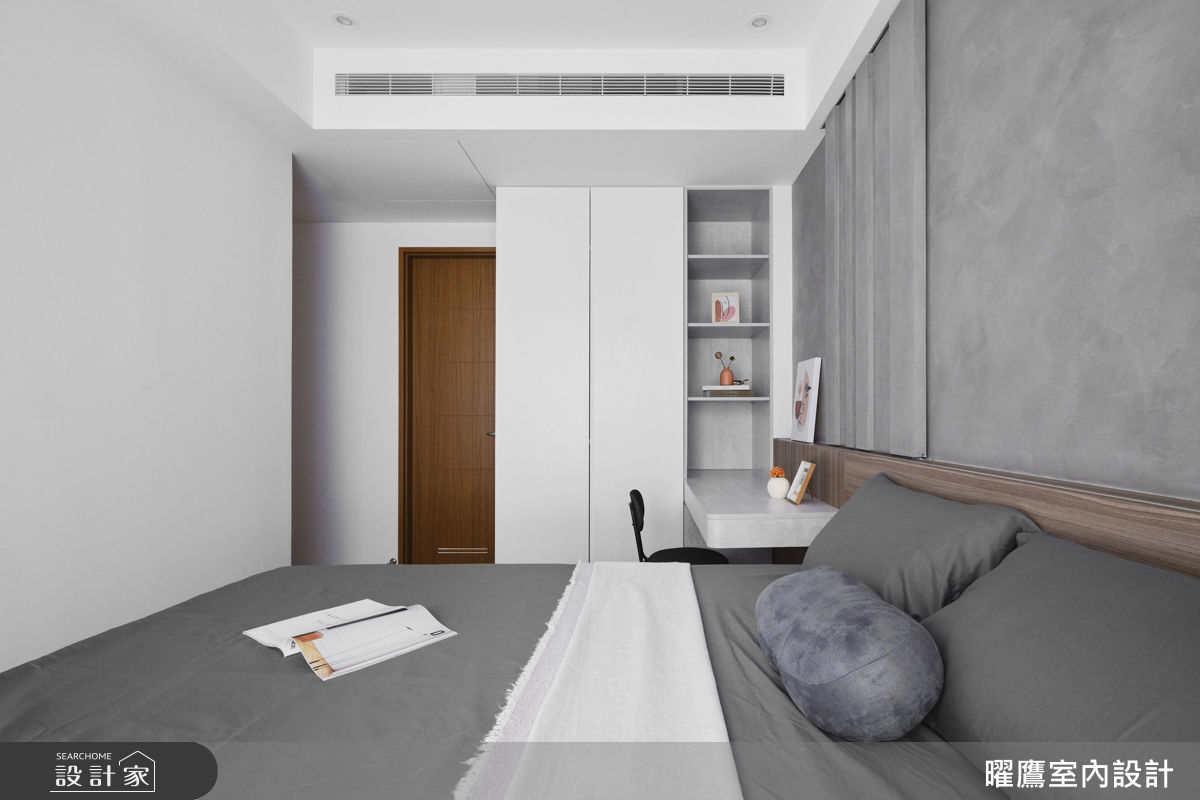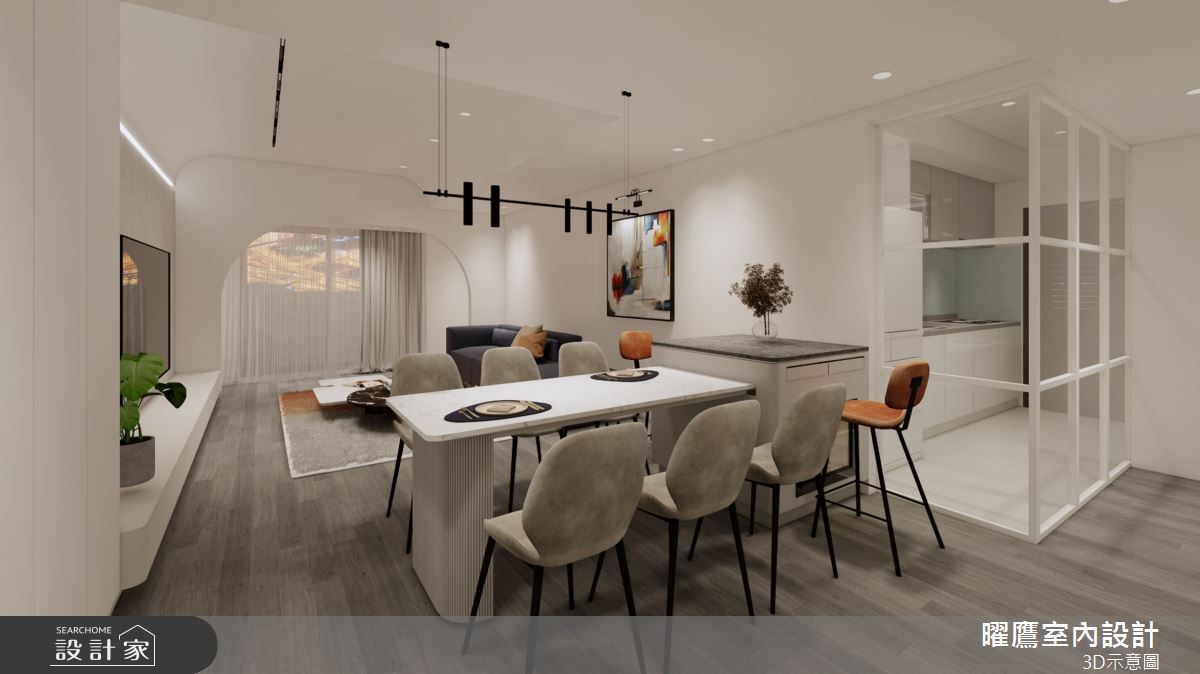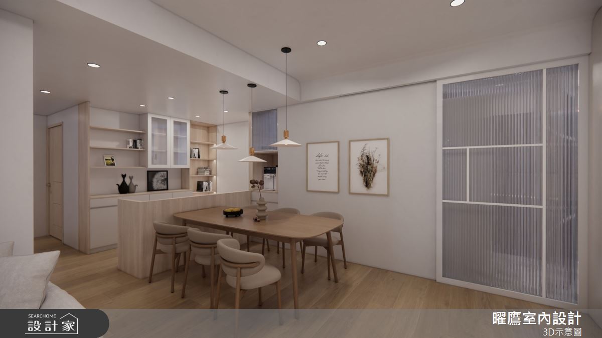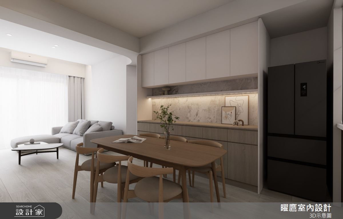 曜鷹室內設計以乳膠漆、烤玻、木作貼皮、系統板材、繃布的搭配應用,呈現現代北歐風居家氛圍,將此間26坪、三房、單層打造成舒適愜意的家庭空間,完成全家人的夢想之居。
