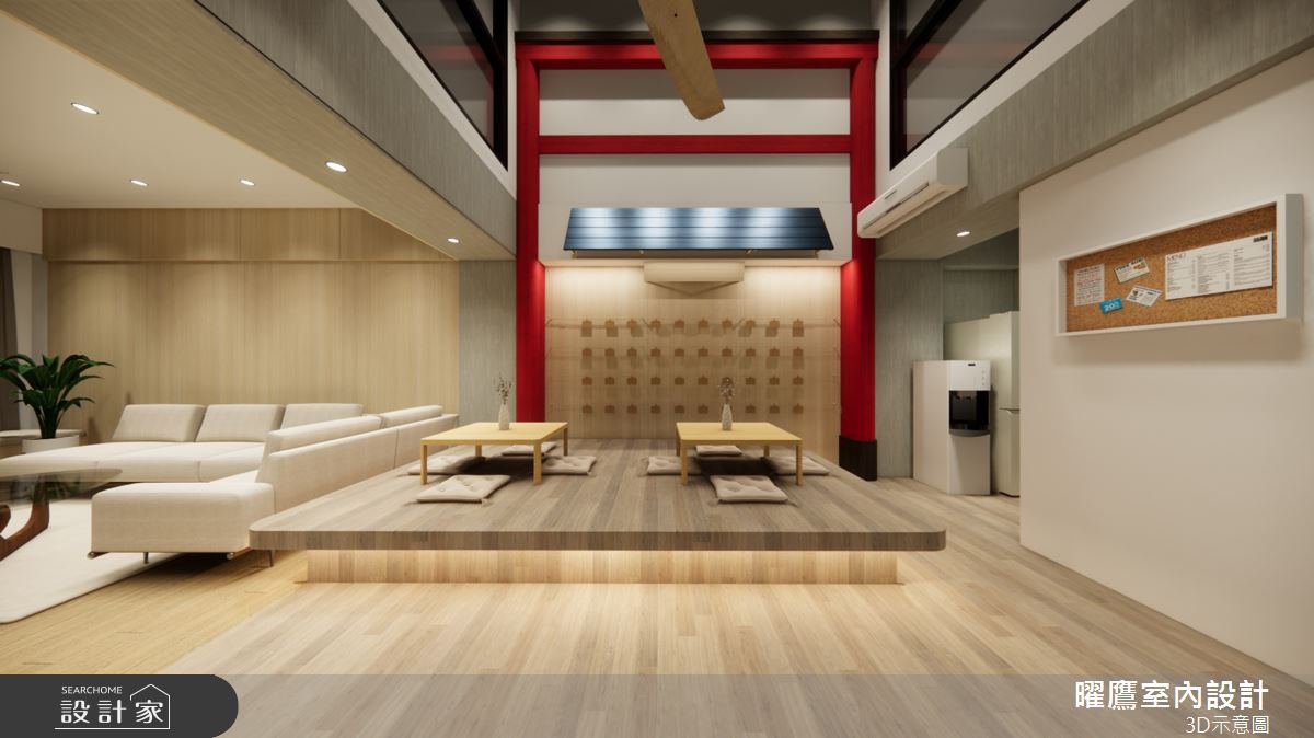 曜鷹室內設計以油漆、大圖輸出、超耐磨木地板、木作貼皮、系統板材、噴漆的搭配應用,呈現日式風的風格氣息,將此間56坪預售屋優雅詮釋成舒適愜意的商業空間。