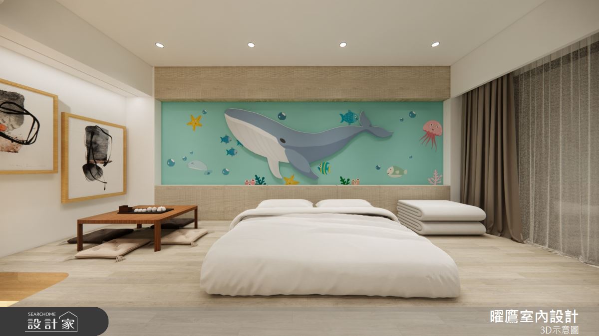 曜鷹室內設計以乳膠漆、烤玻、木作貼皮、系統板材、繃布的搭配應用,呈現現代北歐風居家氛圍,將此間26坪、四房、單層、預售屋打造成舒適愜意的家庭空間,完成2位大人、1位小孩、2位長輩全家人的夢想之居。