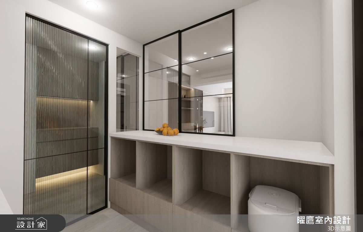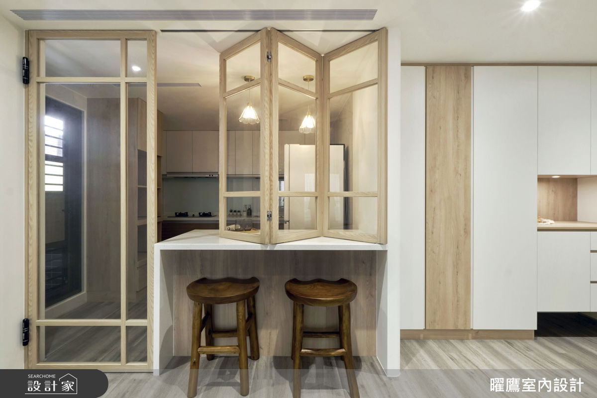 曜鷹室內設計以乳膠漆、鐵件、木作貼皮、系統板材、人造石、玻璃的搭配應用,呈現北歐風居家氛圍,將此間21坪、三房、單層、預售屋打造成舒適愜意的家庭空間,完成2位大人、2位小孩全家人的夢想之居。