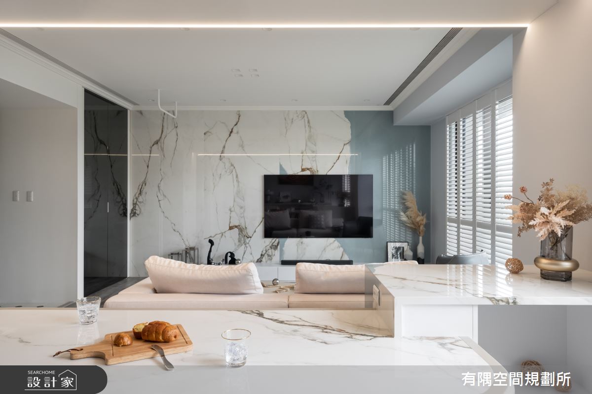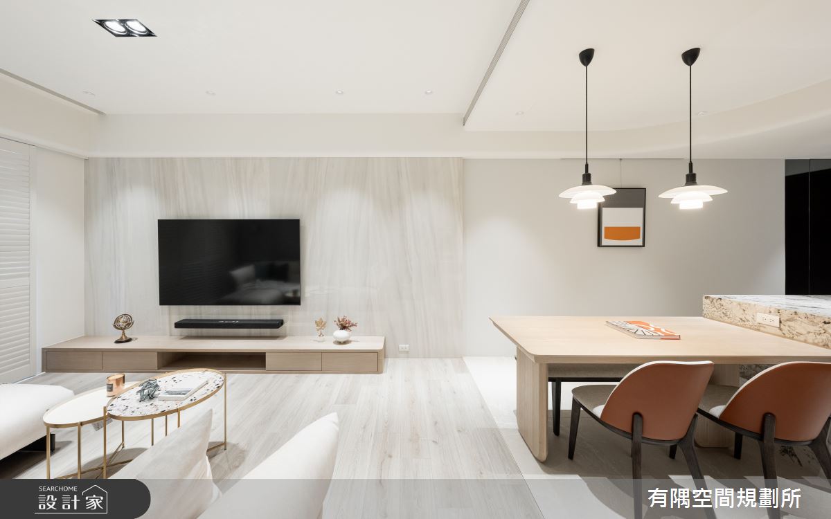 有隅空間規劃所以烤漆、樂土、木作貼皮、系統板材、石材、鐵件、長虹玻璃的搭配應用,呈現現代美式風居家氛圍,將此間60坪、三房、單層、老屋(16~30年)打造成舒適愜意的家庭空間,完成2位大人、1位小孩全家人的夢想之居。