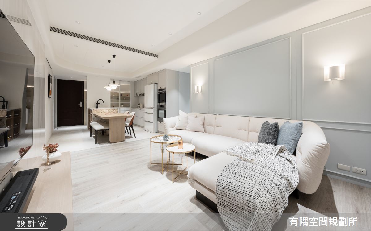 由有隅空間規劃所精心規劃的45坪三房住宅空間,家庭成員一共有2位大人。因應屋主需求,設計師運用現代美式風作為主軸,搭配乳膠漆、烤漆、木作貼皮、系統板材、皮革、花磚、繃布、線板、木百葉、鐵件、超耐磨木地板、灰鏡、薄板、仿古鏡,打造全家人的夢想家居。