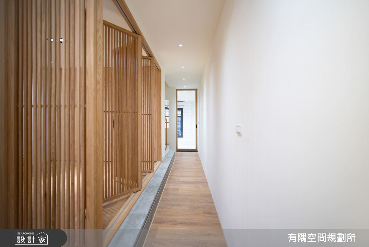 有隅空間規劃所以樂土、木作貼皮、文化石、鐵件、抿石子的搭配應用,呈現日式無印風居家氛圍,將此間70坪、五房、透天別墅、老屋(31~40年)打造成舒適愜意的家庭空間,完成2位大人、1位小孩、2位長輩全家人的夢想之居。