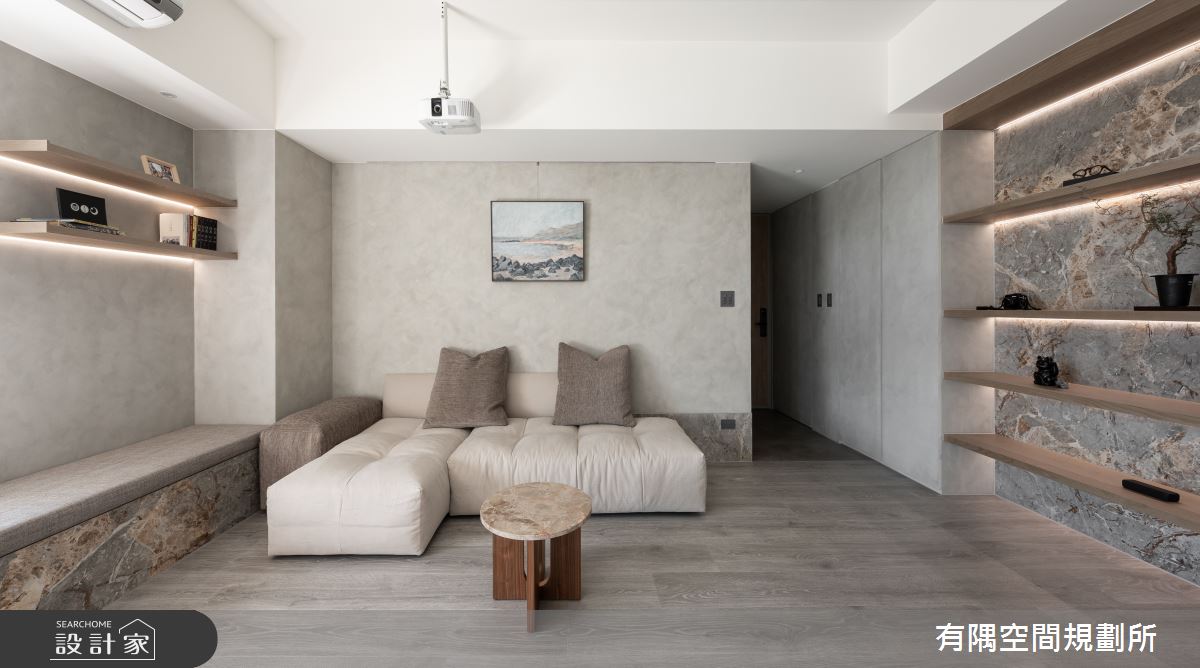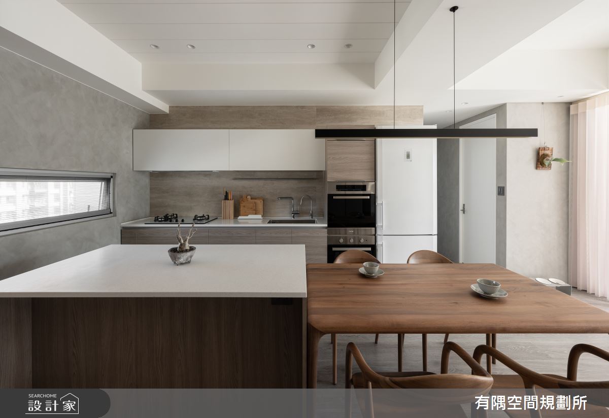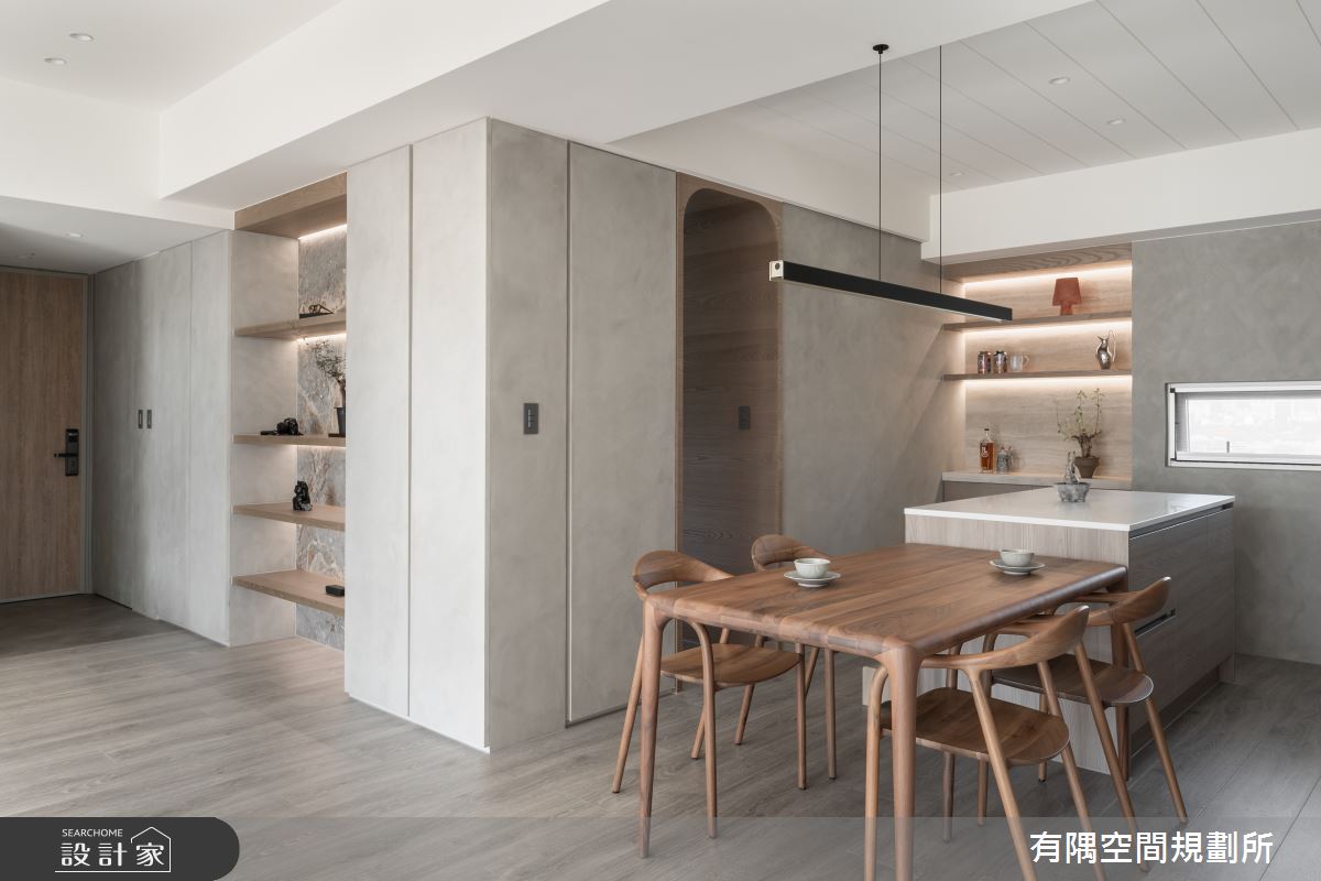 有隅空間規劃所以烤漆、樂土、木作貼皮、鐵件、磁磚、司曼特塗料、釉面磚的搭配應用,呈現現代北歐風居家氛圍,將此間24坪、兩房、單層、新成屋(5年以下)打造成舒適愜意的家庭空間,完成2位大人全家人的夢想之居。
