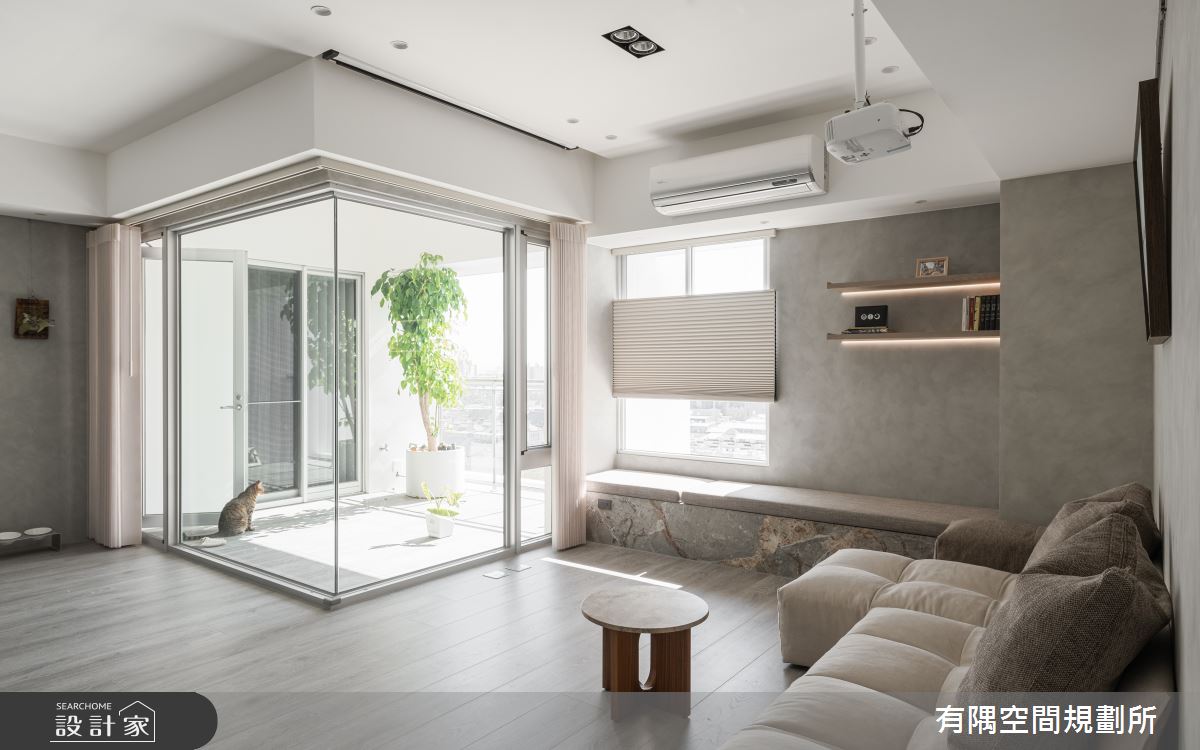 本案為有隅空間規劃所的56坪侘寂風預售屋設計作品,格局為單層三房的居住空間。居住成員包含2位大人、1位小孩。全室建材的搭配,應用乳膠漆、烤漆、樂土、木作貼皮、系統板材、超耐磨木地板、薄板磁磚、洞洞板,展現溫馨的居家氛圍。