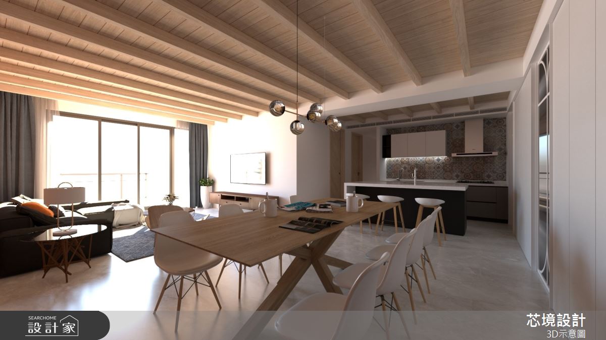 芯境設計有限公司以油漆、水泥漆、鍍鈦金屬、木作貼皮、系統板材的搭配應用,呈現北歐風居家氛圍,將此間23坪、三房、單層、預售屋打造成舒適愜意的家庭空間,完成2位大人全家人的夢想之居。