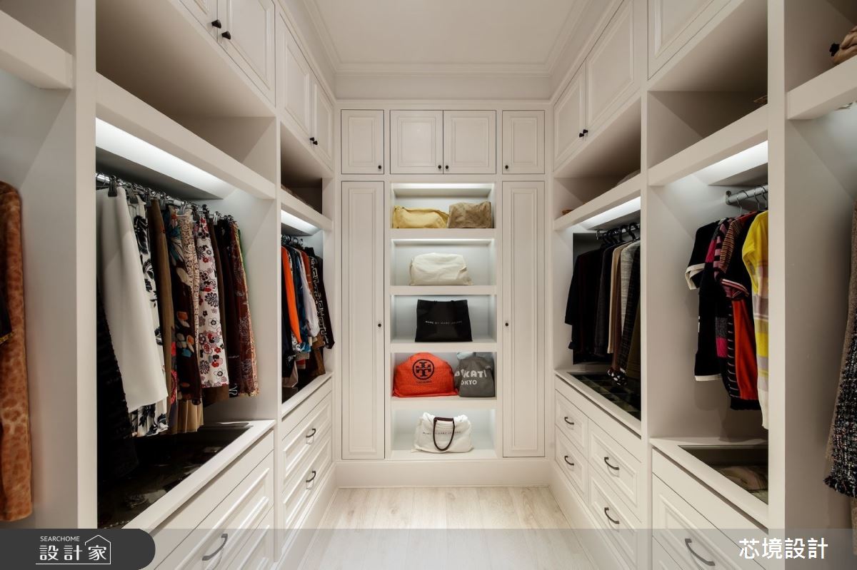 由芯境設計有限公司精心規劃的60坪三房住宅空間,家庭成員一共有2位大人、1位小孩。因應屋主需求,設計師運用新古典作為主軸,搭配乳膠漆、壁紙、木地板、不鏽鋼、鍍鈦金屬、木作貼皮、烤漆、大理石、皮革、石材、繃布、線板、噴漆,打造全家人的夢想家居。