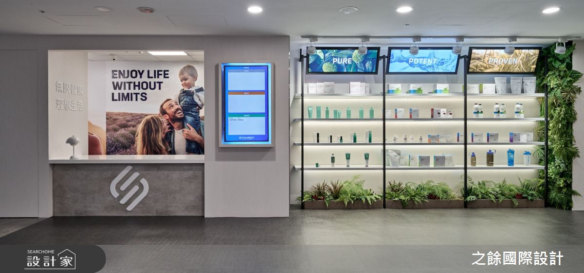 之餘國際設計以油漆、壁紙、大圖輸出、鐵件、木作貼皮、軌道燈、壓克力刻字、玻璃、線燈、植生牆的搭配應用,呈現現代風的風格氣息,將此間160坪中古屋(5~15年)優雅詮釋成舒適愜意的商業空間。