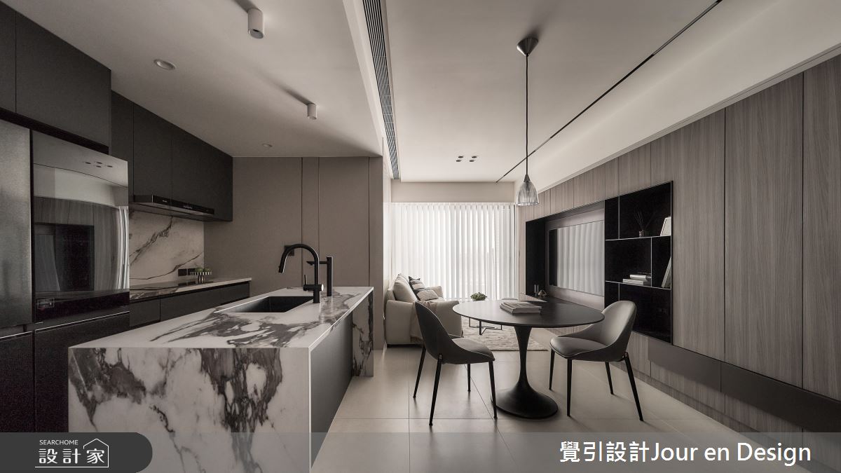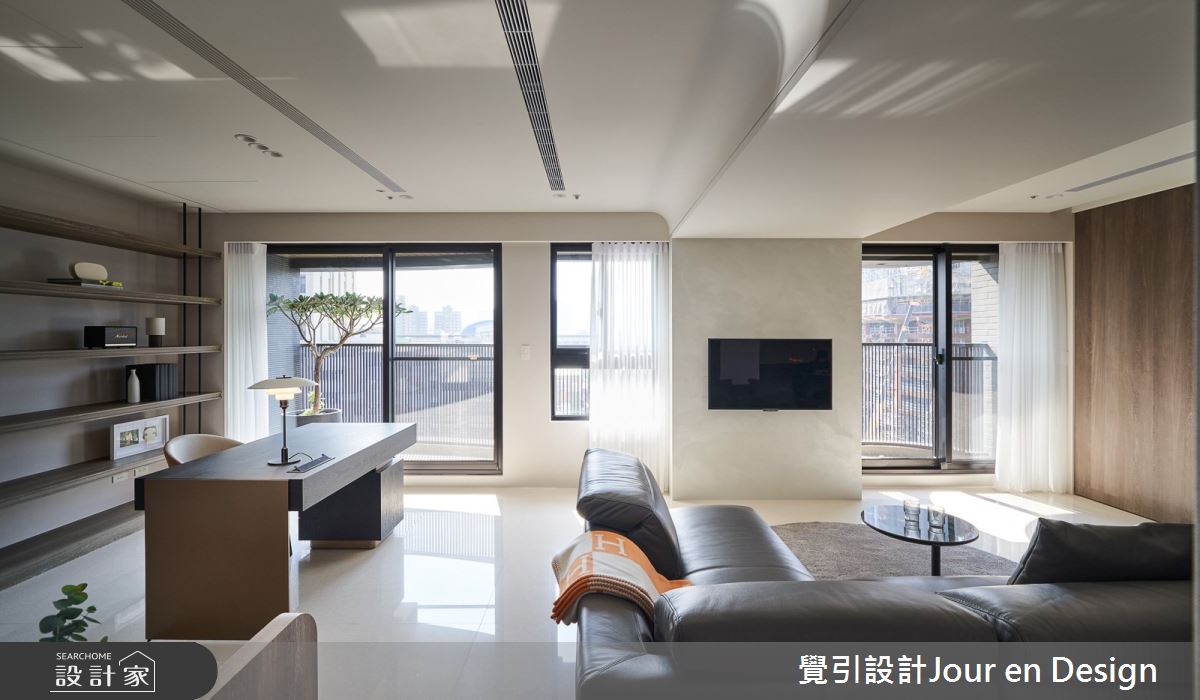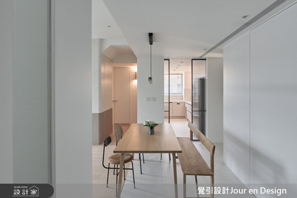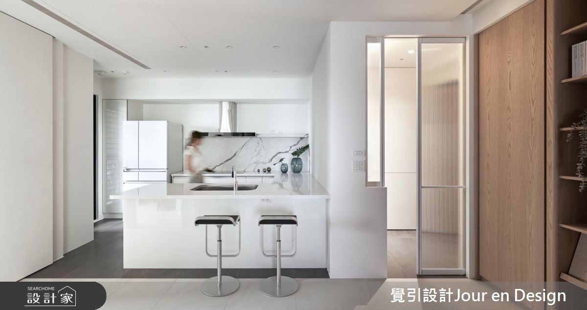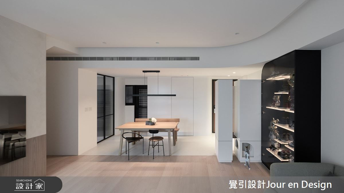 由覺引設計Jour en Design精心規劃的32坪住宅空間。因應屋主需求,設計師運用現代風作為主軸,搭配特殊漆、白橡鋼刷實木皮、長虹玻璃、義大利石紋薄,打造全家人的夢想家居。