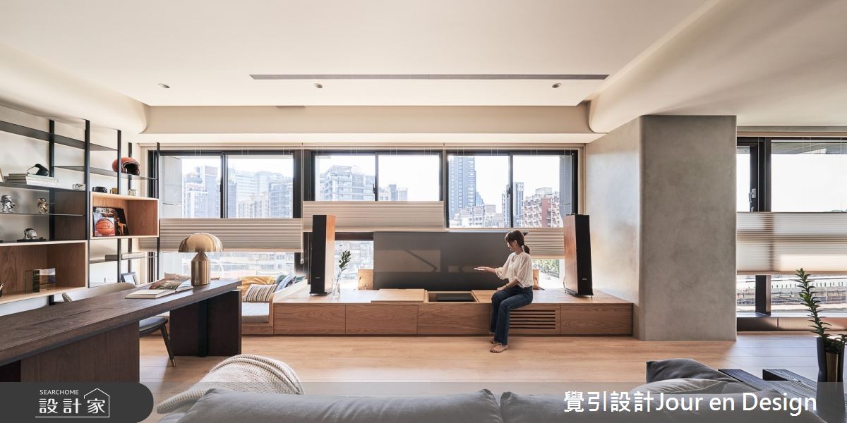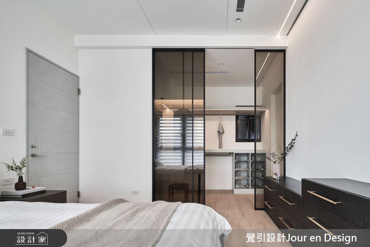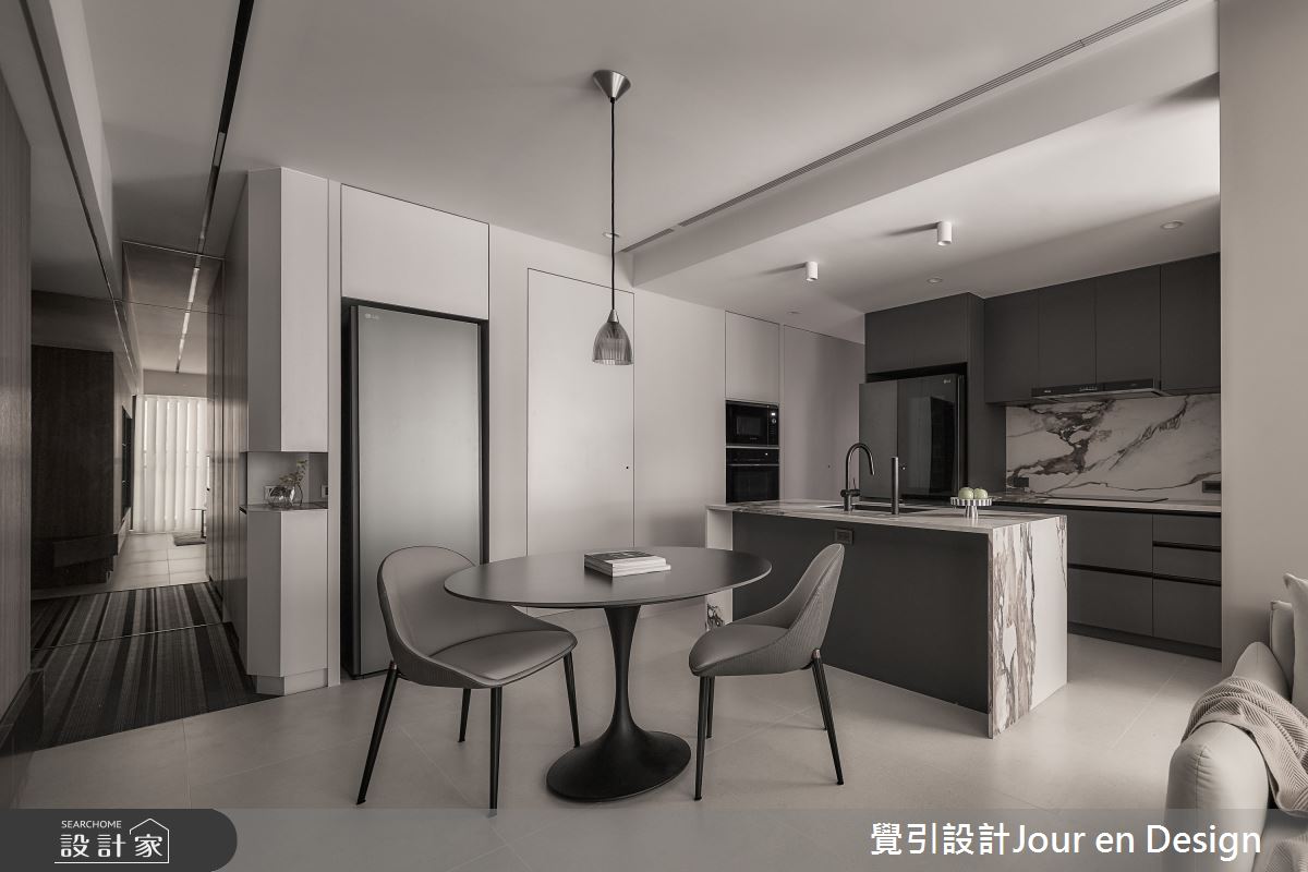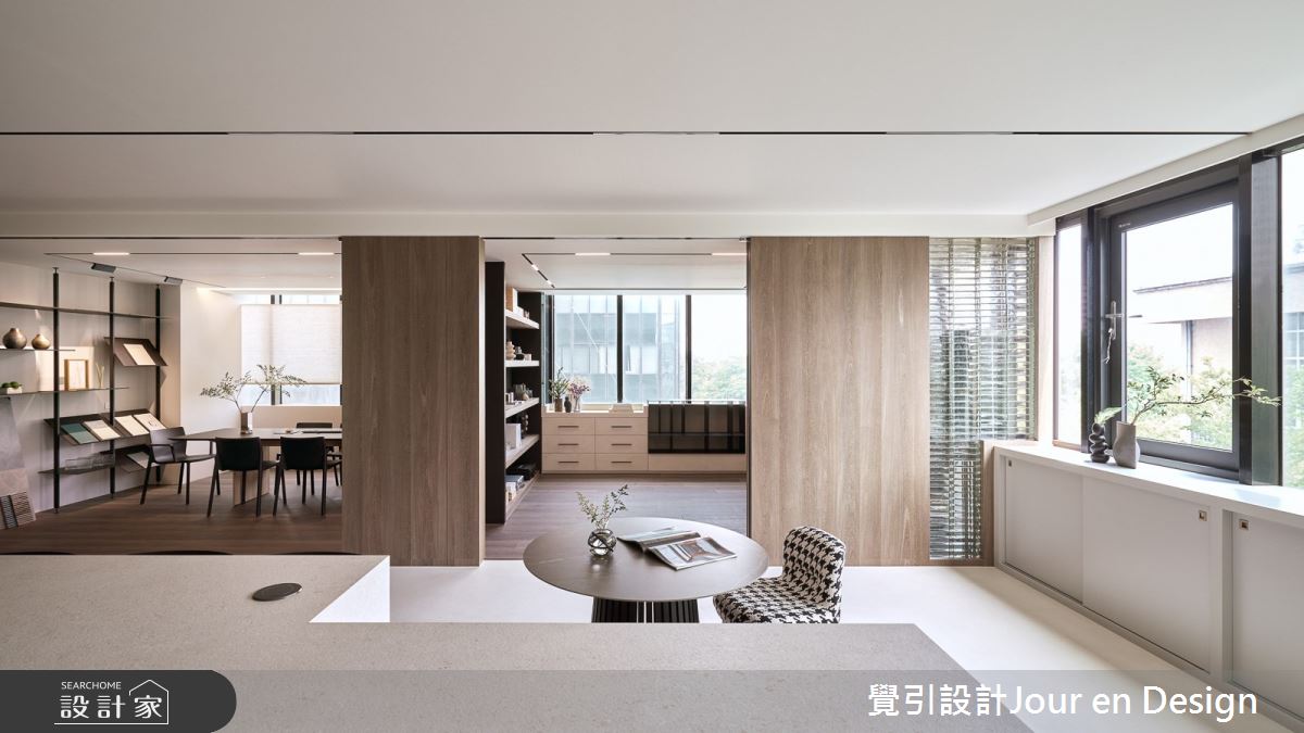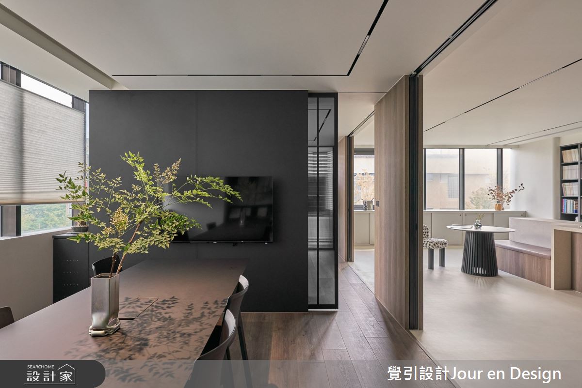 由覺引設計Jour en Design精心規劃的32坪住宅空間。因應屋主需求,設計師運用現代風作為主軸,搭配特殊漆、白橡鋼刷實木皮、長虹玻璃、義大利石紋薄,打造全家人的夢想家居。