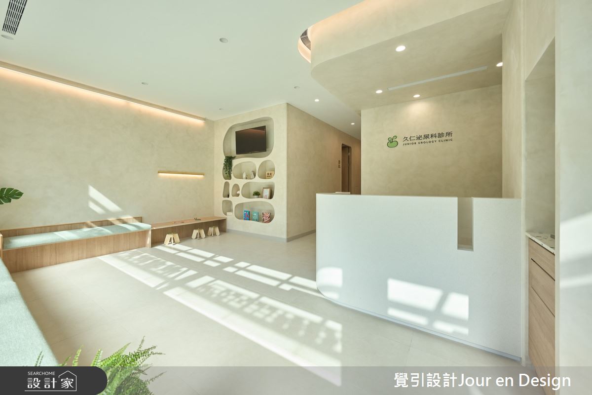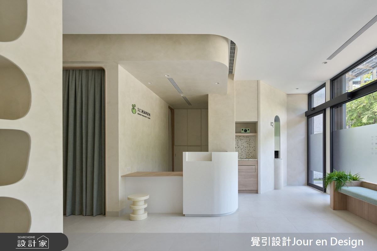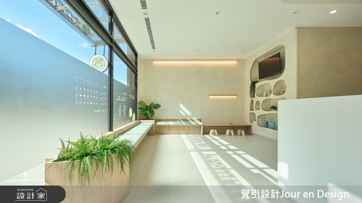 覺引設計Jour en Design以特殊漆、水磨石、木紋美耐板、小冰柱直紋玻的搭配應用,呈現侘寂風的風格氣息,將此間45坪毛胚屋優雅詮釋成舒適愜意的商業空間。