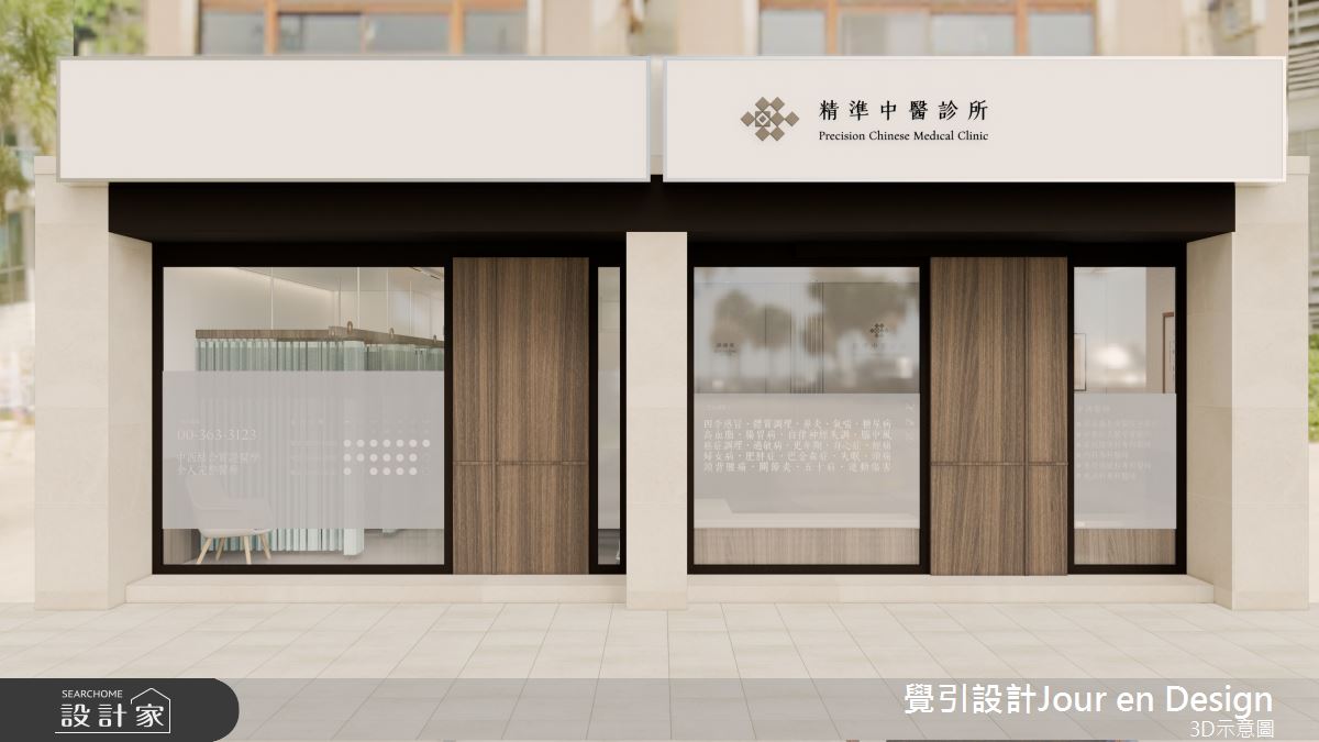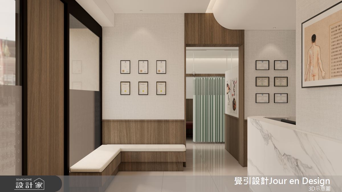 覺引設計Jour en Design以水染鐵刀實木皮、訂製鐵件、特殊漆、玻璃磚、義大利石紋薄板、波隆地毯的搭配應用,呈現現代風的風格氣息,將此間55坪中古屋(5~15年)優雅詮釋成舒適愜意的商業空間。