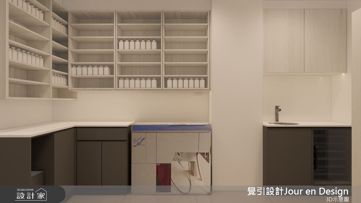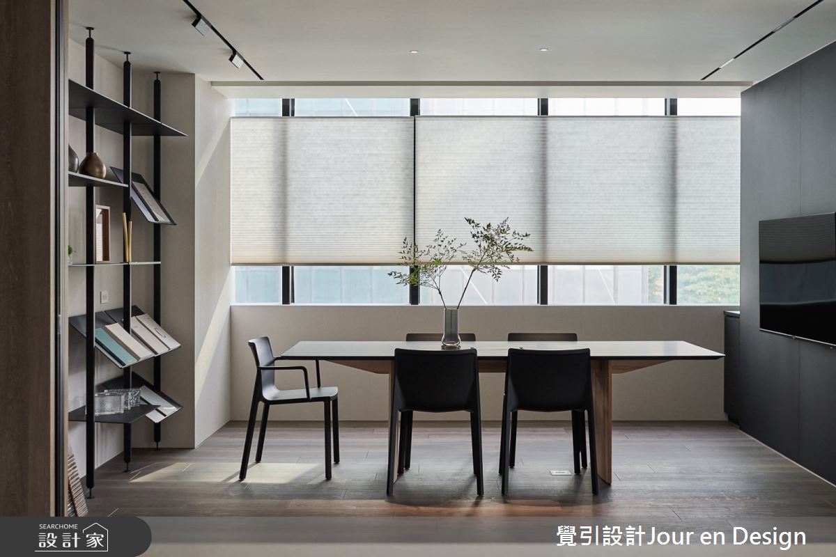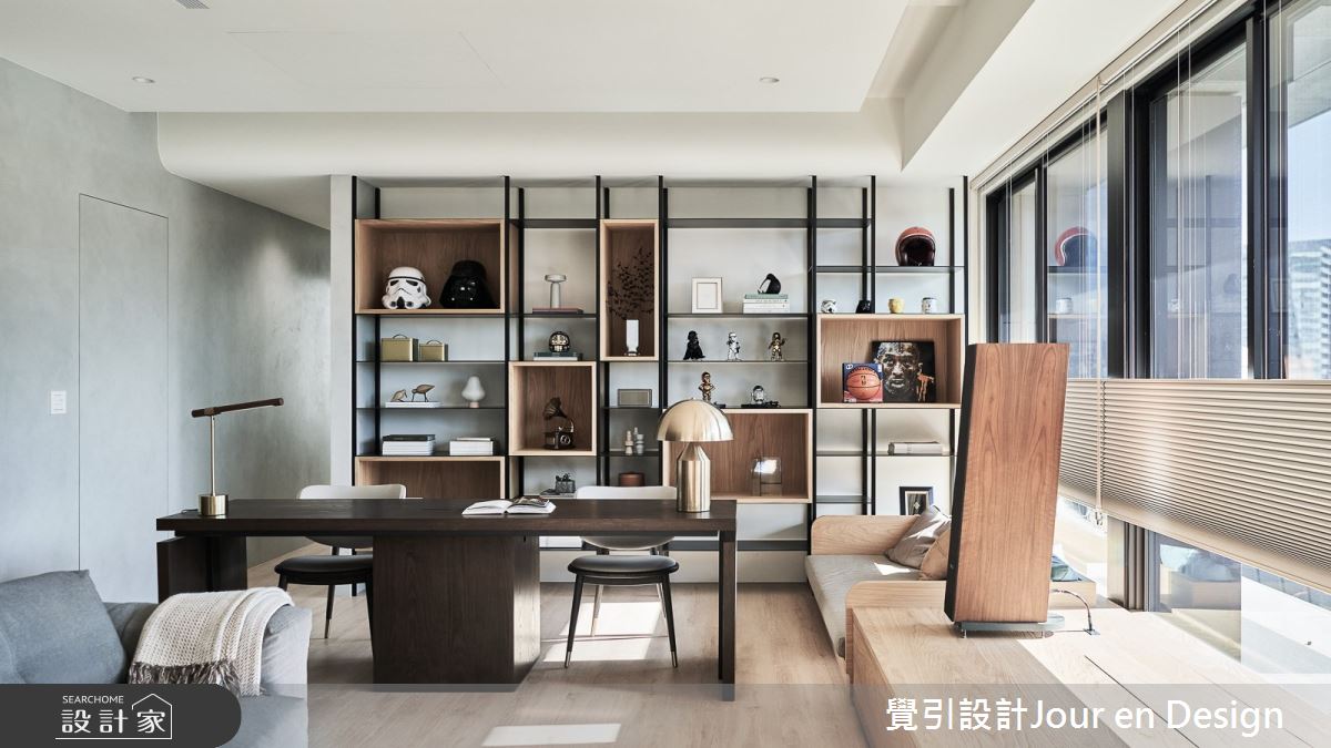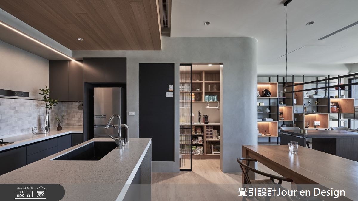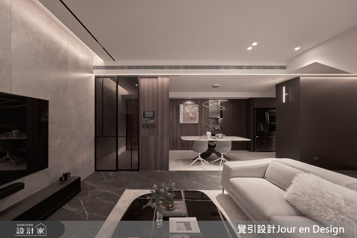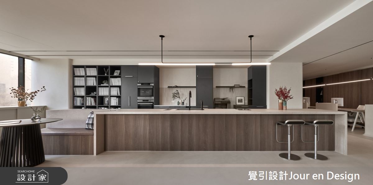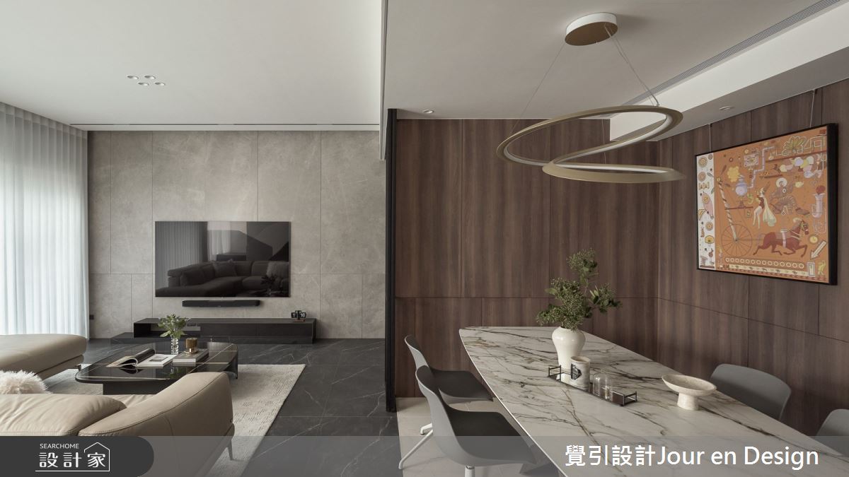 本案為覺引設計Jour en Design的55坪現代風新成屋(5年以下)設計作品,格局為單層三房的居住空間。居住成員包含2位大人。全室建材的搭配,應用金屬美耐板、鋼刷石木皮、義大利石紋薄板、超耐磨木地板、鍍鈦金屬,展現溫馨的居家氛圍。