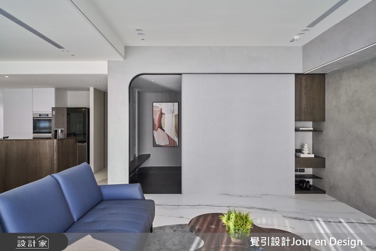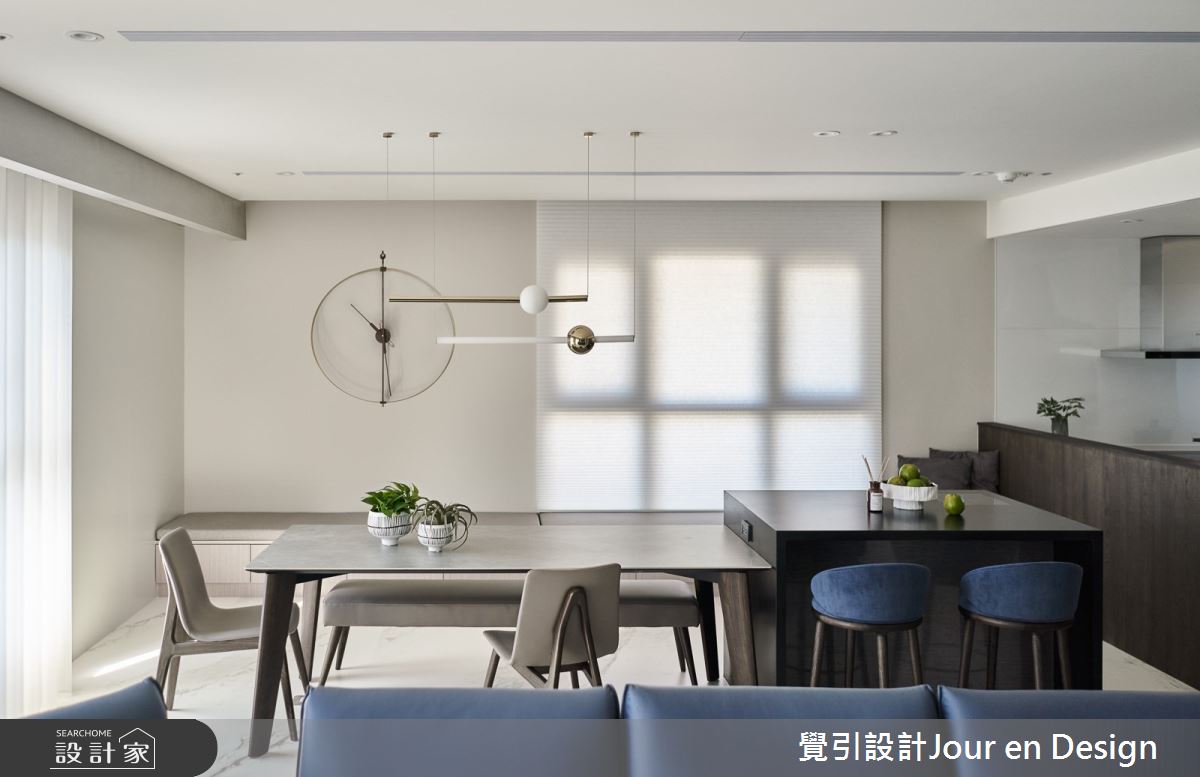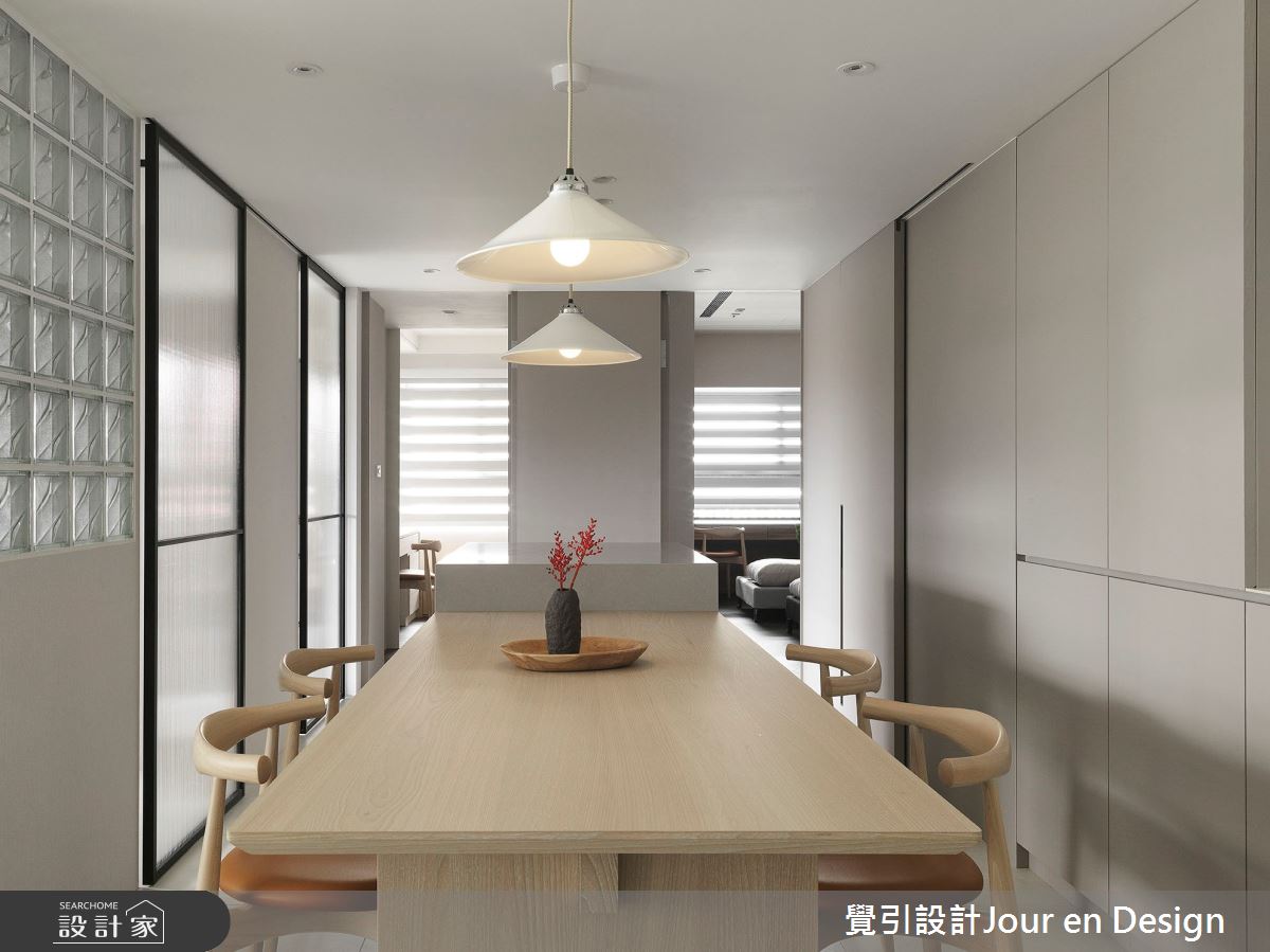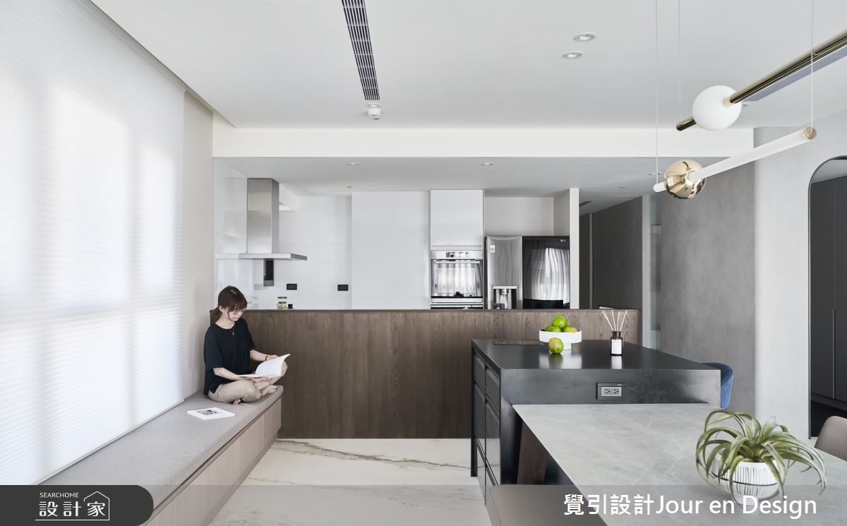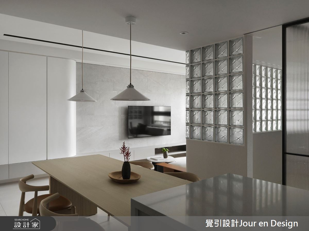 由覺引設計Jour en Design精心規劃的32坪住宅空間。因應屋主需求,設計師運用現代風作為主軸,搭配特殊漆、白橡鋼刷實木皮、長虹玻璃、義大利石紋薄,打造全家人的夢想家居。