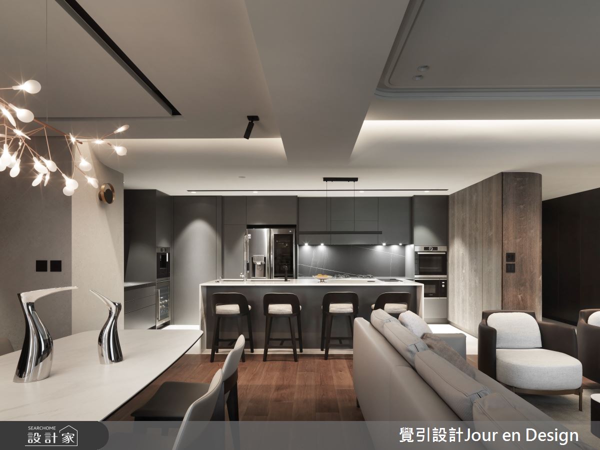 覺引設計Jour en Design以鋼刷石木皮、石紋薄板、皮革、鐵件、實木海島地板、進口壁紙、鍍鈦的搭配應用,呈現現代風居家氛圍,將此間50坪、單層、中古屋(5~15年)打造成舒適愜意的家庭空間,完成全家人的夢想之居。