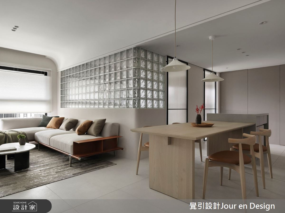 來自覺引設計Jour en Design的35坪現代風住宅案,是一間單層毛胚屋的格局,設計師藉由建材以進口米色石紋磚、進口灰色石紋磚、玻璃磚、超耐磨地板、鋼刷實木皮、FENIX美耐板的搭配應用,實現一家人的理想生活。