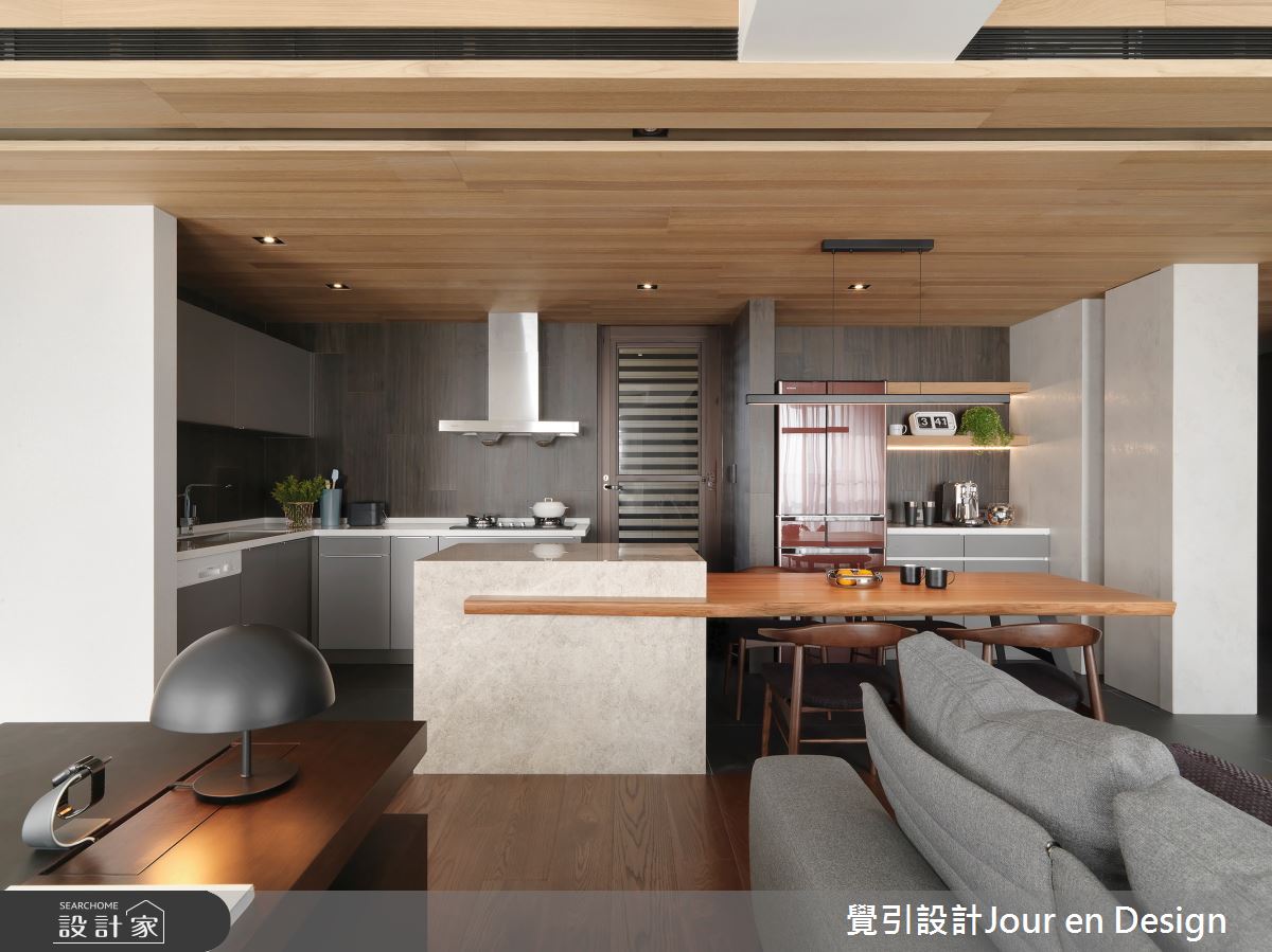 覺引設計Jour en Design以鋼刷石木皮、石紋薄板、皮革、鐵件、實木海島地板、進口壁紙、鍍鈦的搭配應用,呈現現代風居家氛圍,將此間50坪、單層、中古屋(5~15年)打造成舒適愜意的家庭空間,完成全家人的夢想之居。