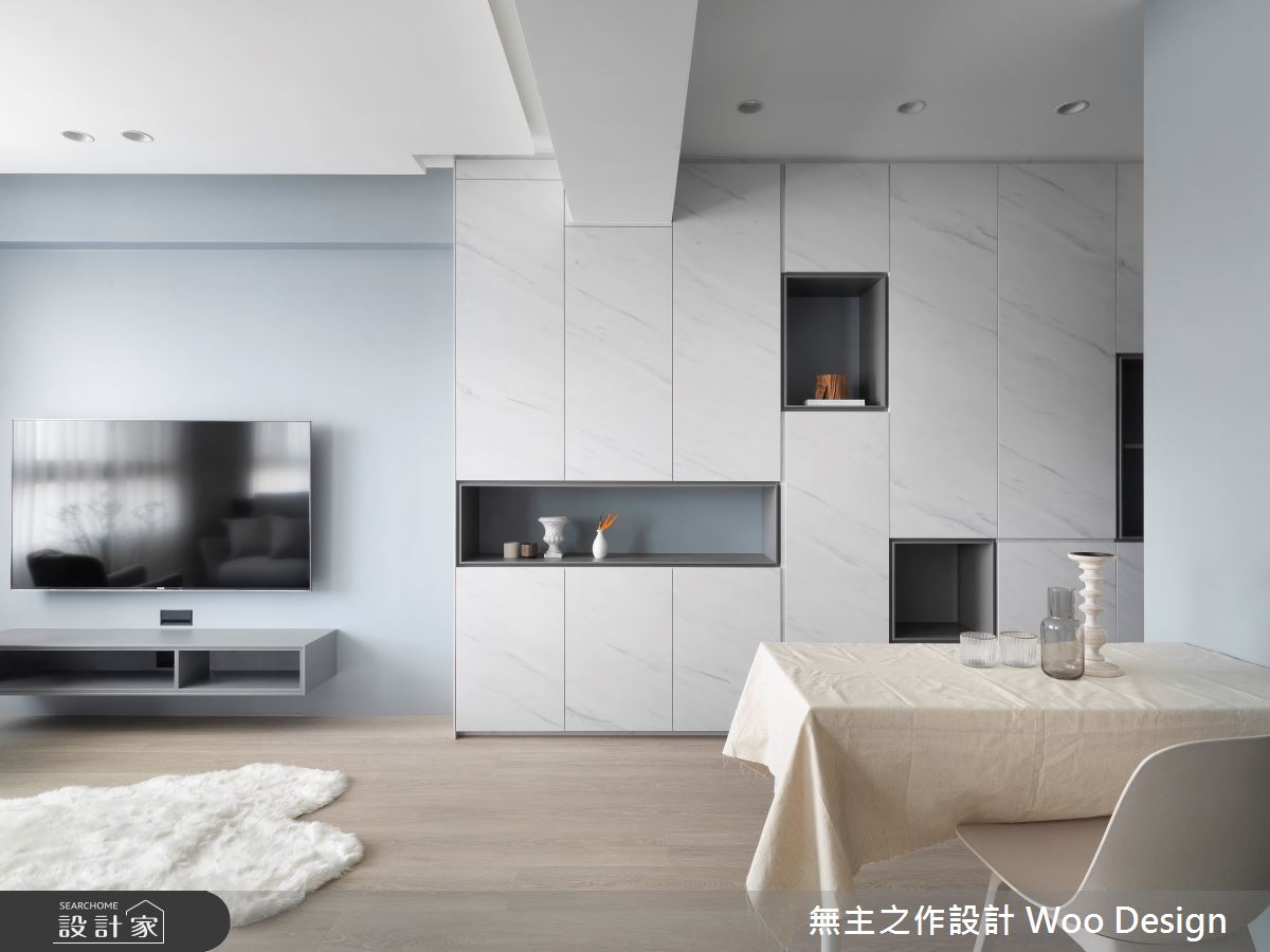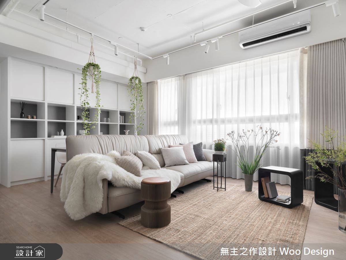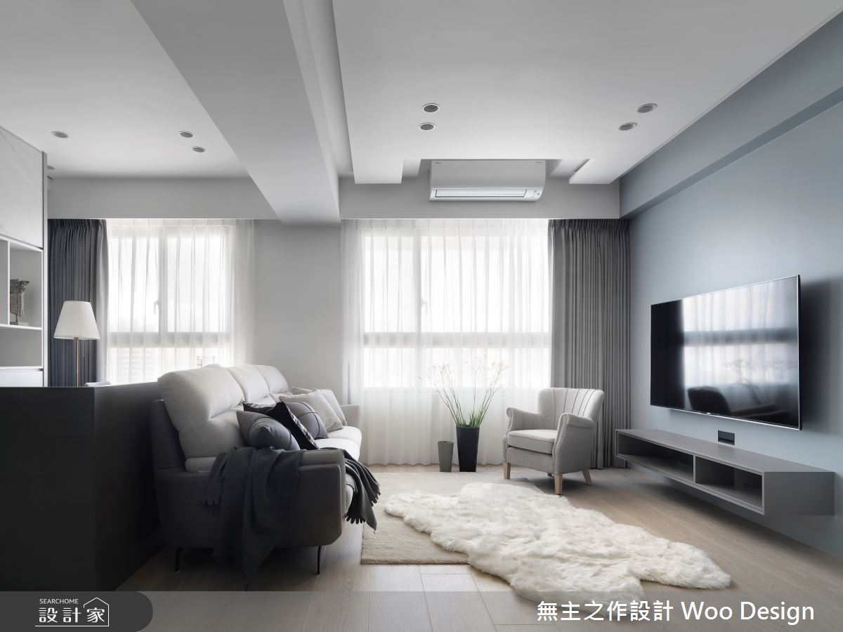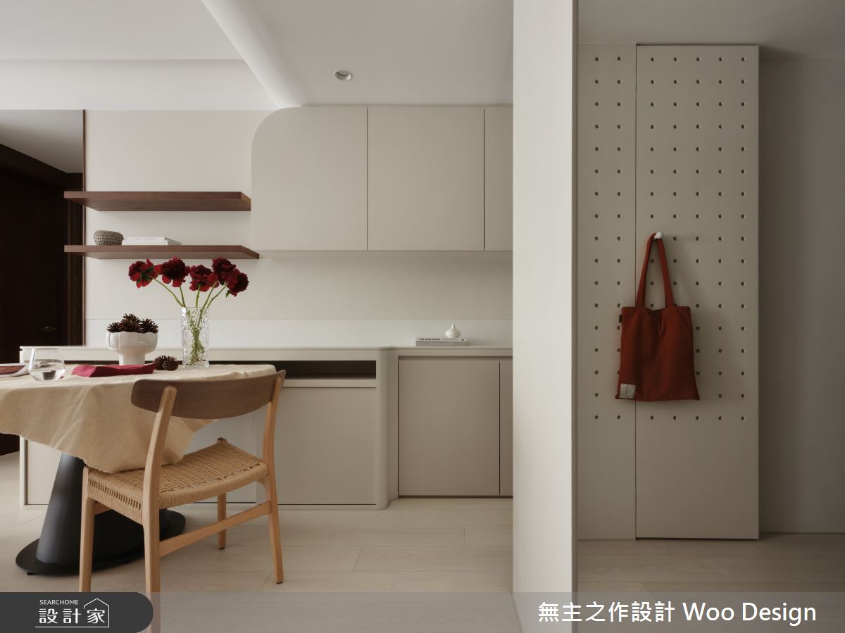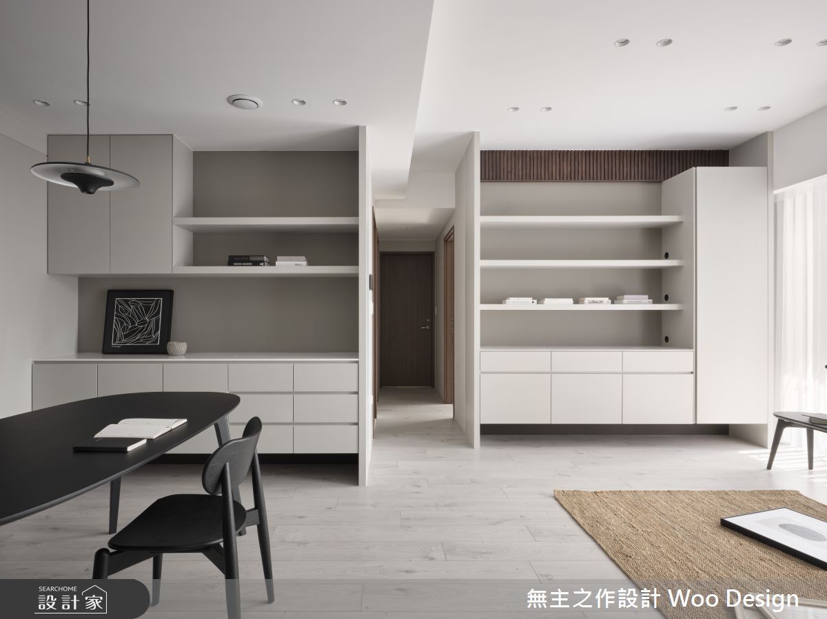 無主之作空間設計以乳膠漆、超耐磨木地板、烤漆、系統板材、賽麗石、噴漆的搭配應用,呈現簡約風居家氛圍,將此間29坪、三房、單層、新成屋(5年以下)打造成舒適愜意的家庭空間,完成2位大人全家人的夢想之居。
